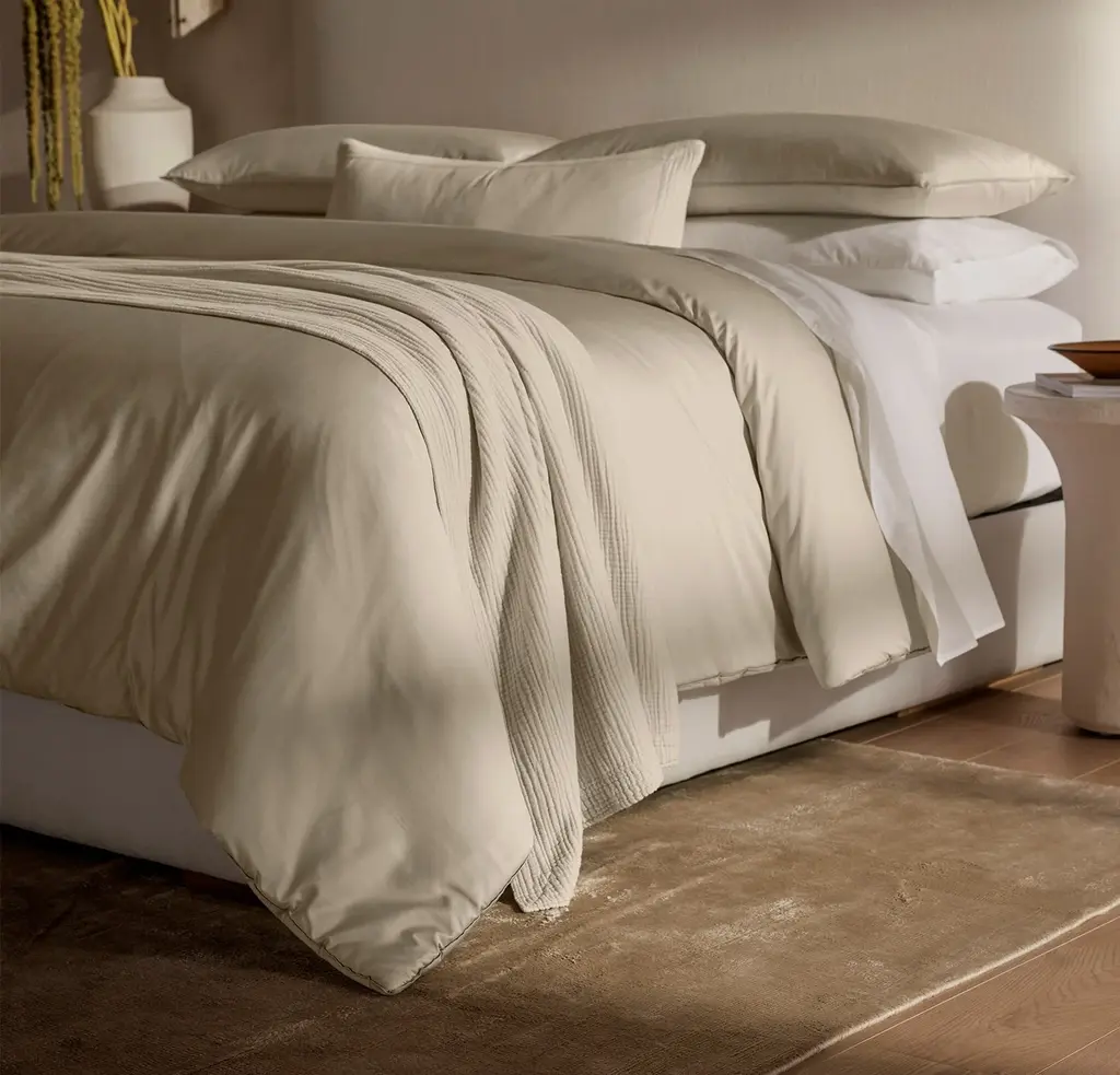 Get the look of a duvet with the ease of one layer. Reinvented with our buttery, breathable organic cotton Signature fabric, this Comforter gives your top of bed a luxuriously soft hand-feel that gets softer with every wash. Invisible quilt stitching keeps the hypoallergenic, 100% recycled polyester fill perfectly in place, and ensures a clean-lined finish that will maintain its shape over time. The Feel Buttery and breathable with an ideal, all-season weight The Look Relaxed finish with a soft sheen and refined trim