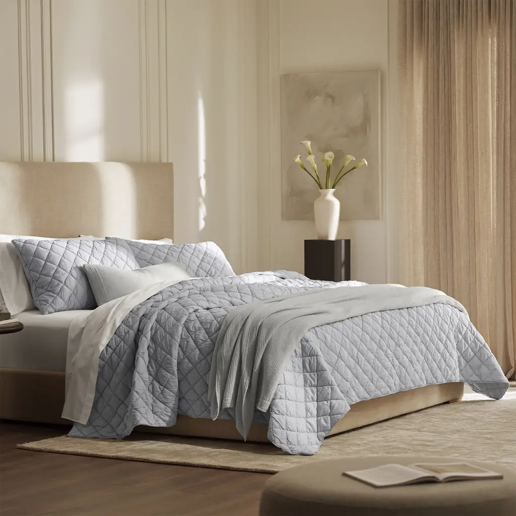 An effortlessly dimensional design updates Boll & Branch's comforter set for a cloud-like experience you'll indulge in night after night. Ruched diamond quilting gives this style its lofty texture, meticulously stitched along the top and hand-finished at the back. The buttery soft shell is made with signature long-staple cotton fabric, woven to get softer with every wash.