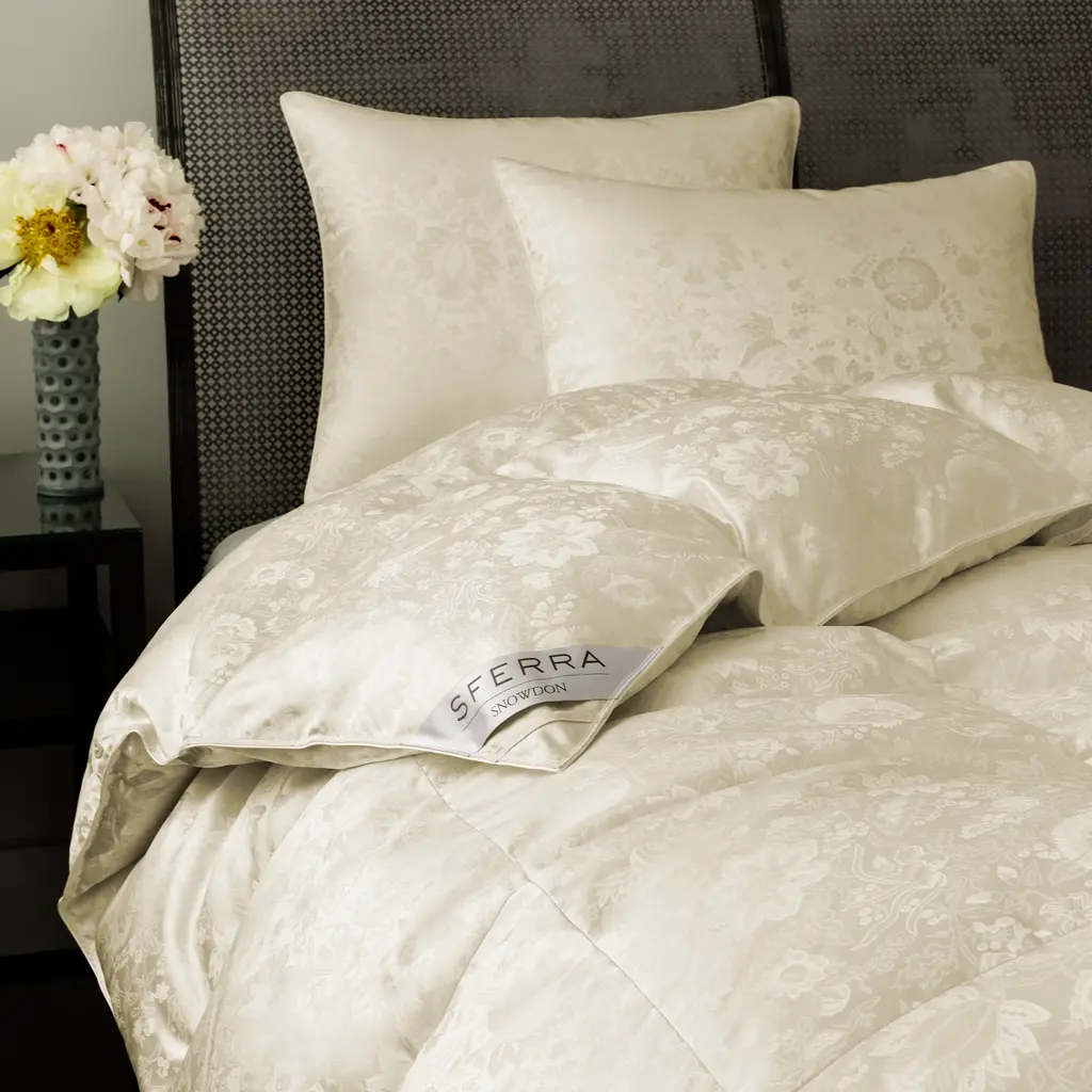This down Sferra duvet is designed to cocoon you in sweet dreams. The Sferra Down Collection boasts an amazing variety of down duvets and sleeping pillows. Carefully constructed of down clusters, which interlock and trap air to keep you warm, but also have the remarkable ability to keep you comfortable, Sferra down offers varying levels of fill power to customize the perfect sleeping experience. A measure of efficiency, the higher the fill power number, the better the down and the greater its insulating value. With a weight and a loft for everyone, one will be just right for you.