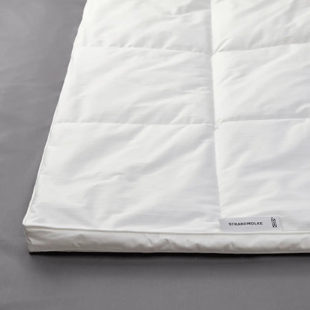 STRANDMOLKE Comforter, warm King. A warm, easy-care comforter in soft, dobby woven cotton and a hollow fiber filling from recycled sources. The side walls make this comforter extra thick and fluffy. Panel stitched with intermediate walls to keep the filling in place, which distributes warmth evenly.