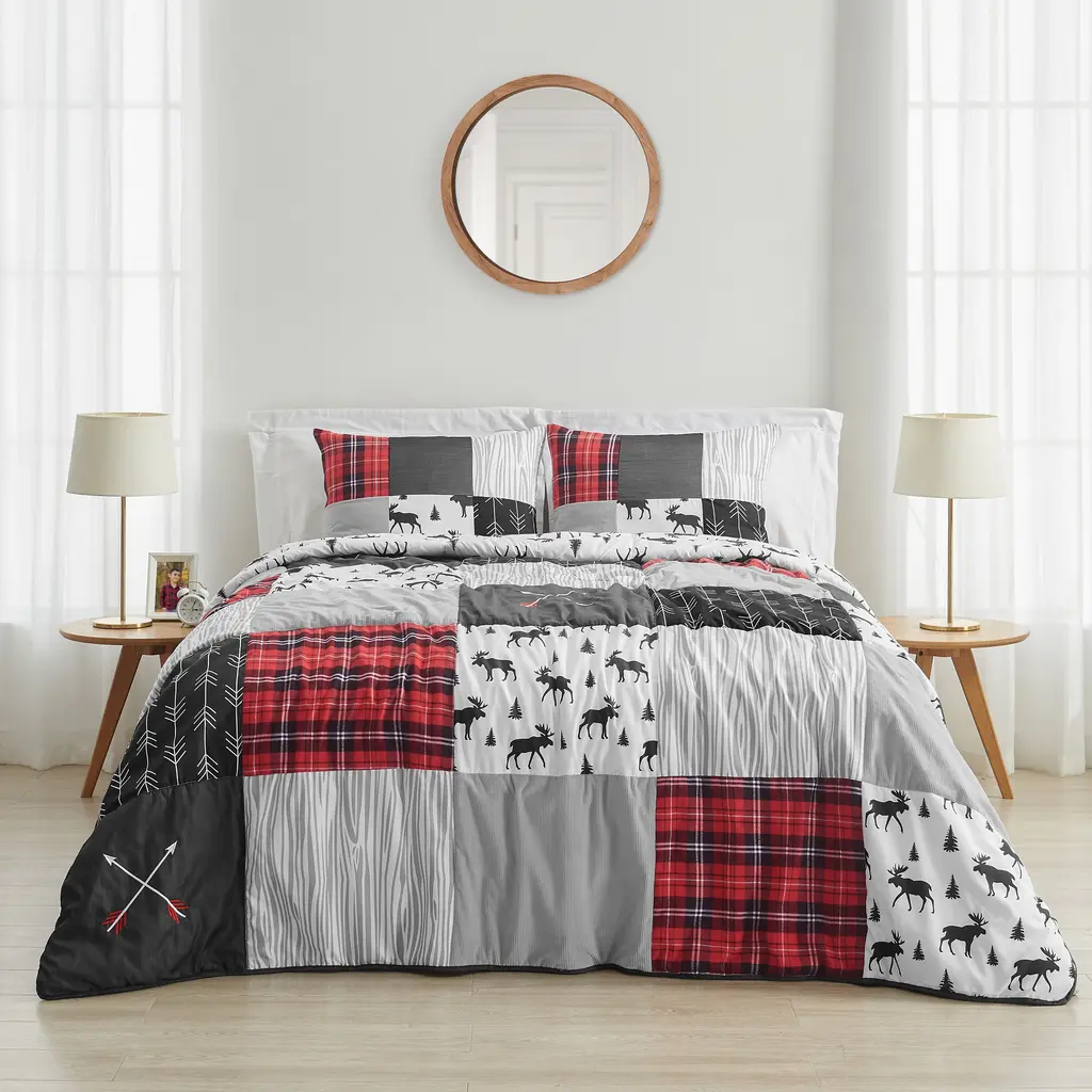 Create a cozy and stylish bedroom for your child with the Sweet Jojo Designs Rustic Patch Collection Comforter Set. Featuring a combination of moose, arrow, wood grain, and red plaid flannel prints, this designer bedding set uses brushed microfiber, denim, corduroy, and flannel fabrics in the colors of grey, red, black, and white. The lightweight comforter and pillow shams are easy to care for as they are machine washable. This 3-piece set is perfect for full and queen size beds. Cozy and stylish combination of prints and fabrics. Colors of grey, red, black, and white. Lightweight comforter suitable for all seasons. Fits full and queen size beds. Machine washable for easy care.