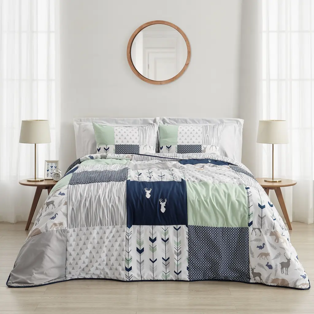 A fresh and stylish complement to any bedroom, this bedding set from Sweet Jojo Designs incorporates a crisp, contemporary pattern to match its plush and cozy feel. The premium polyester microfiber has a brushed texture that makes for equal parts durability and comfort, and ensures that this set is as easy to maintain as it is to enjoy for years to come. Features: Lightweight comforter. Includes comforter and 2 shams. Made of polyester microfiber. White, grey, navy, and mint color scheme. Patchwork arrow pattern. Machine washable. Full/queen sizeFull/Queen Dimensions: Comforter: 86 inches wide x 86 inches long. Shams: 20 inches wide x 26 inches longThe digital images we display have the most accurate color possible. However, due to differences in computer monitors, we cannot be responsible for variations in color between the actual product and your screen.