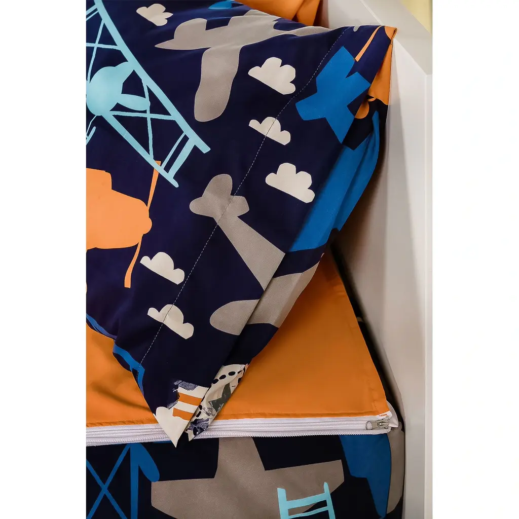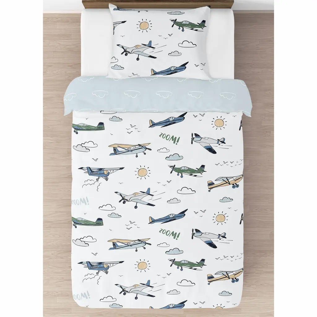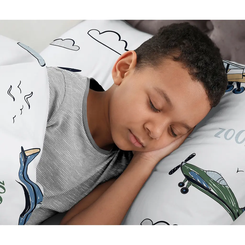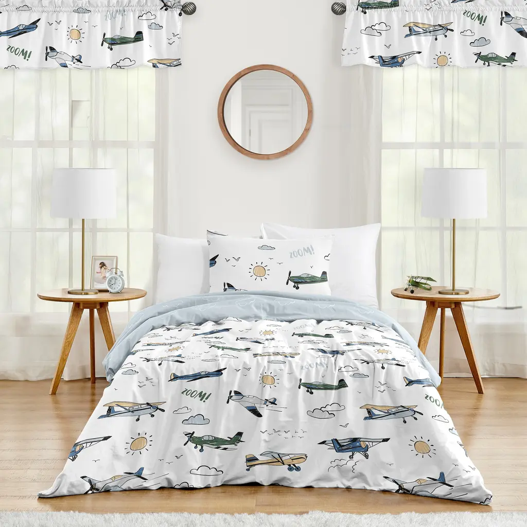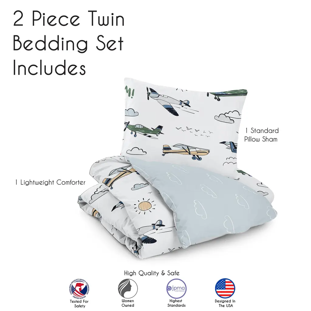Transform your child's bedroom into a cozy and stylish retreat with our 2pc Green and Blue Airplane kids bedding sets for boys by Sweet Jojo Designs. Designed for people who love both style and comfort, this twin size bedding set features vibrant colors and fun patterns. This twin bedding comforter sets for boys uses a sensational collection of exclusive, brushed microfiber fabrics. This all-in-one twin bed in a bag set includes a super-soft twin blanket and a matching pillow sham, offering the perfect blend of warmth, comfort and durability. The soft comforter features a fun vintage air plane print and a coordinating cloud print. The colorful palette of green, white, yellow, light blue, grey and black will create the perfect aviator themed bedroom. This versatile collection has you covered with the perfect toddler twin bedding set for any airplane lover in your family. Our twin bedding sets for children provide softness & quality, making it perfect for those who appreciate luxury bedding without the hefty price tag. Whether you're updating your guest bedroom essentials, need extra bedding, or upgrading your child's room, this twin bedding set is a must-have. This boys bedding sets twin by Sweet Jojo Designs will fit all standard twin size beds and is machine washable for easy care and repeated use. 2PC TWIN BEDDING SETS FOR BOYS INCLUDES: Lightweight Comforter (62in. x 86in.) & Standard Sham (20in. x 26in.). Easy machine washable and dryable on low. This transportation twin comforter set for boys is made with super soft, moisture wicking brushed microfiber fabric and features the colorful palette of green, white, yellow, light blue, grey and black will bring together this airplane look for your bedroom. AVIATOR AIRPLANES THEME: This twin boys bedding set boasts a soft blanket & pillow case sham. The bed comforter features a fun coloring book inspired vintage air plane print and a coordinating sky clouds print. This twin bed set has a matching pillow sham.