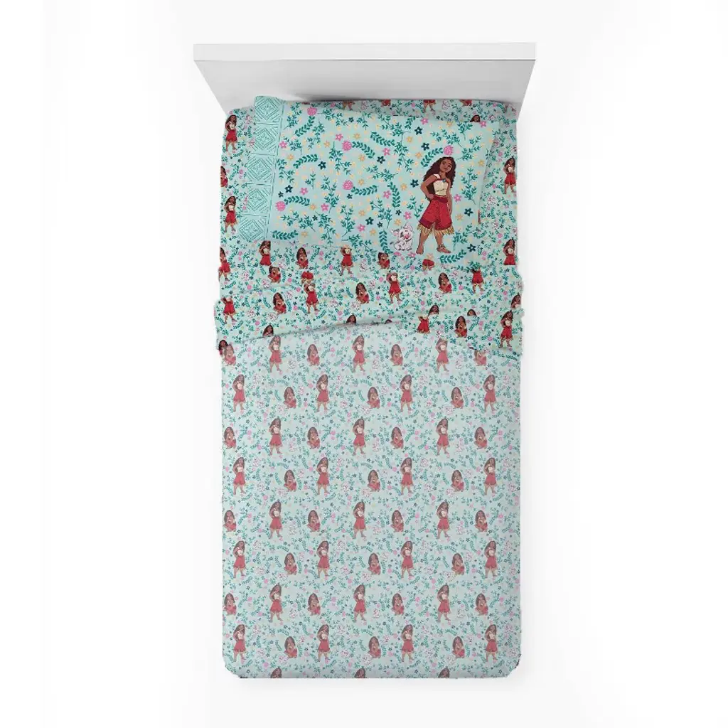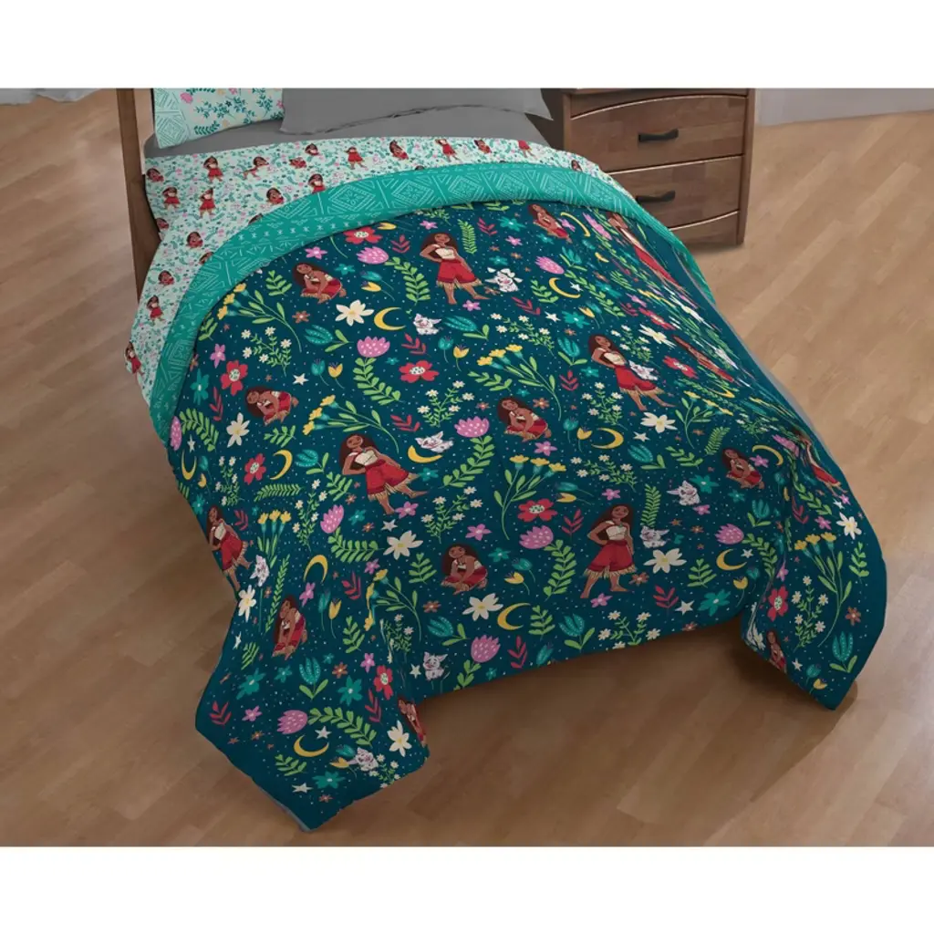 Sail into sweet dreams with this Moana twin comforter, measuring 86" long by 64" wide. Featuring Moana and her lovable sidekick Pua surrounded by a vibrant green flowery design, this cozy comforter brings adventure and tropical charm to bedtime. Perfect for any Disney fan, it adds warmth, comfort, and island-inspired style to your child’s bedroom. This comforter is 100% polyester. Machine wash cold. Tumble dry low.