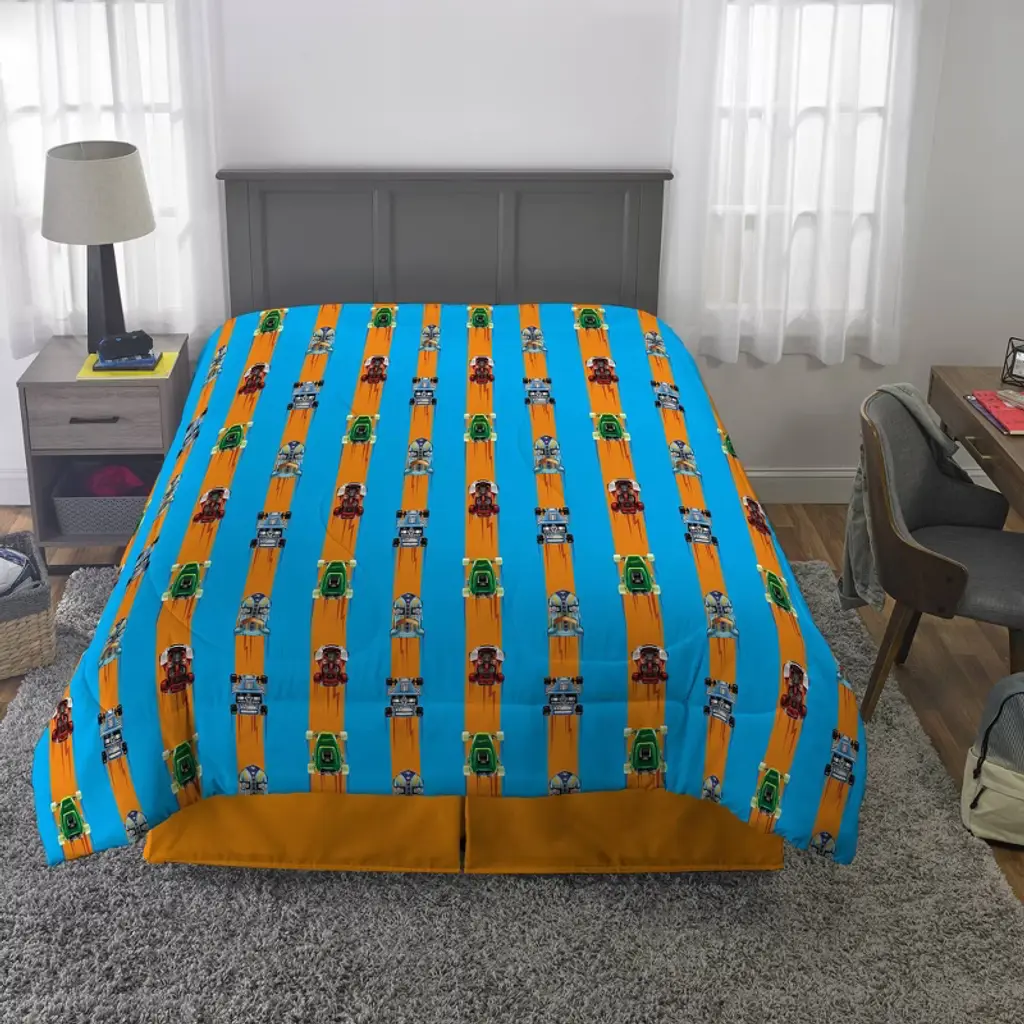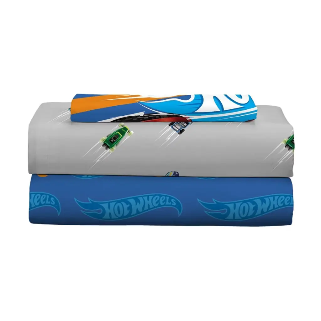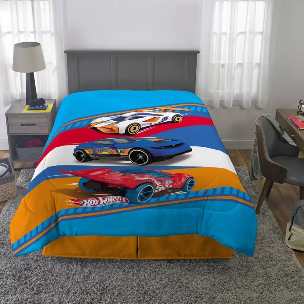 Young speedsters can gear up for a good night's sleep with this plush comforter featuring Hot Wheels. With its cool look and cozy feel, kids will be ready and set for bed in no time.This high-quality bedding is crafted from super soft microfiber for impressive warmth and comfort. Bold imagery of race cars and the Hot Wheel logo adorn the front. When it's time for a change, simply flip over the comforter to reveal a striped race track and car pattern.Sleep will come fast when your little one crawls into bed with this soft and warm comforter. Thanks to its plush design, even little racers will love to slow down and cuddle up for the night.