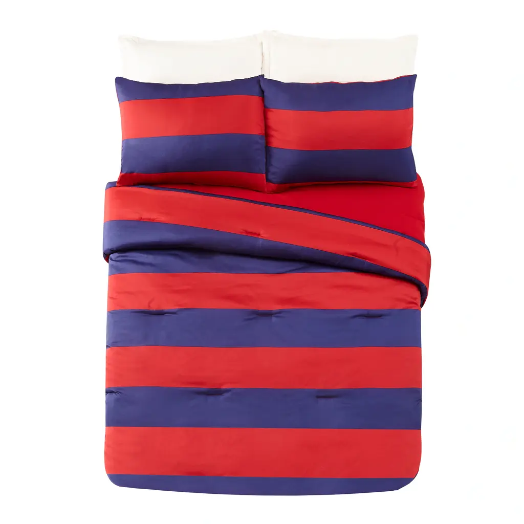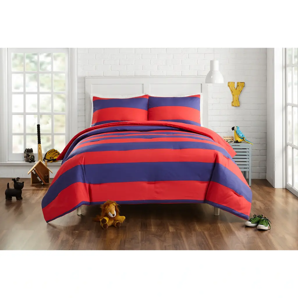Make sure your little sport gets a good night's rest with the Lavelle Comforter Set. This bold and versatile printed stripe adds a modern touch to your room. The printed face reverses to a solid making this comforter completely reversible. This easy care set is made of super soft brushed polyester. Twin/XL Twin set includes one matching sham; Full/Queen set includes two matching shams.