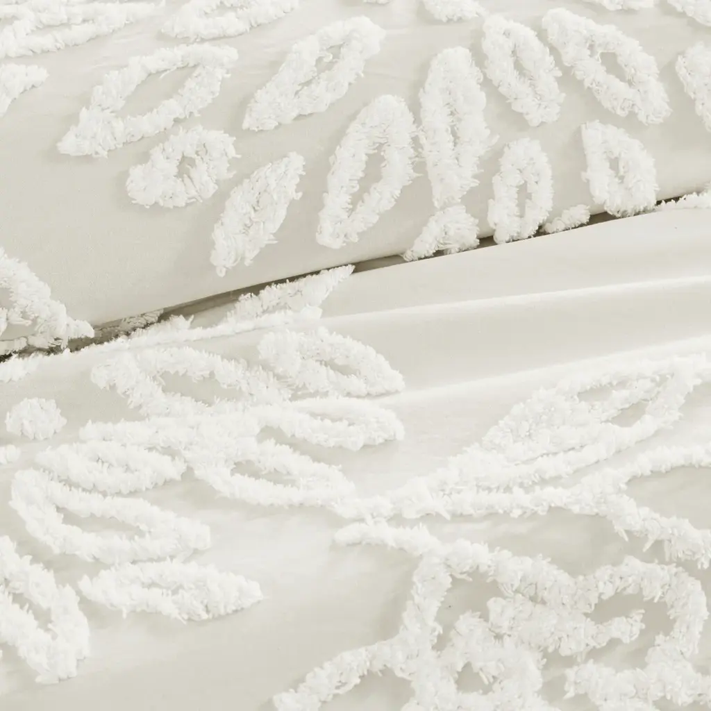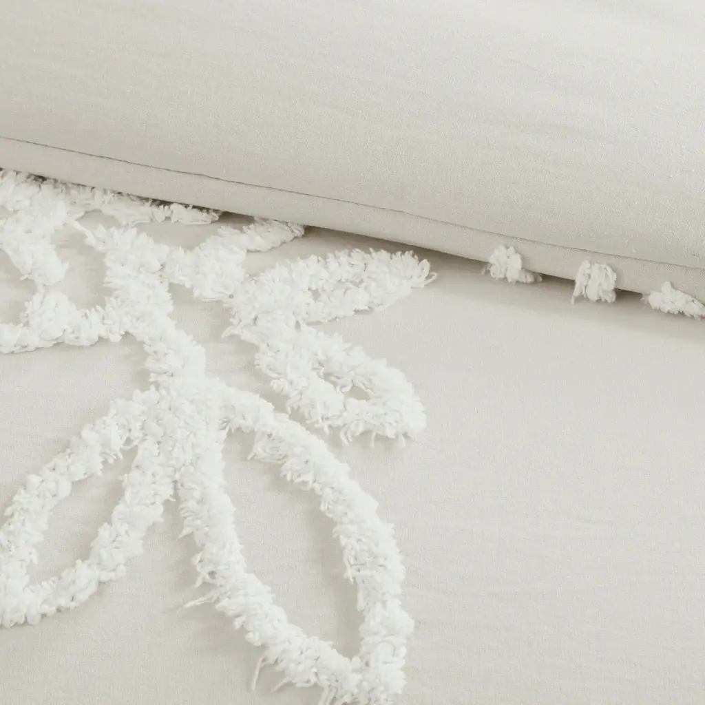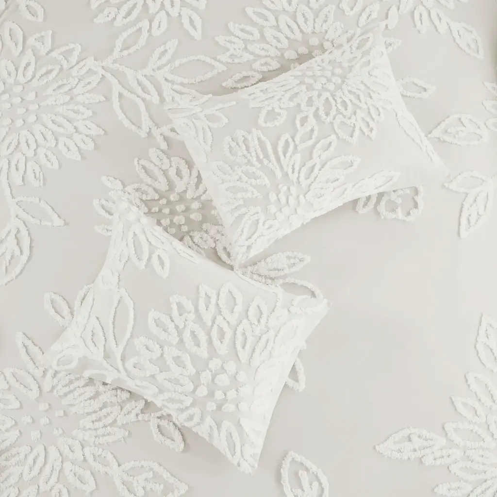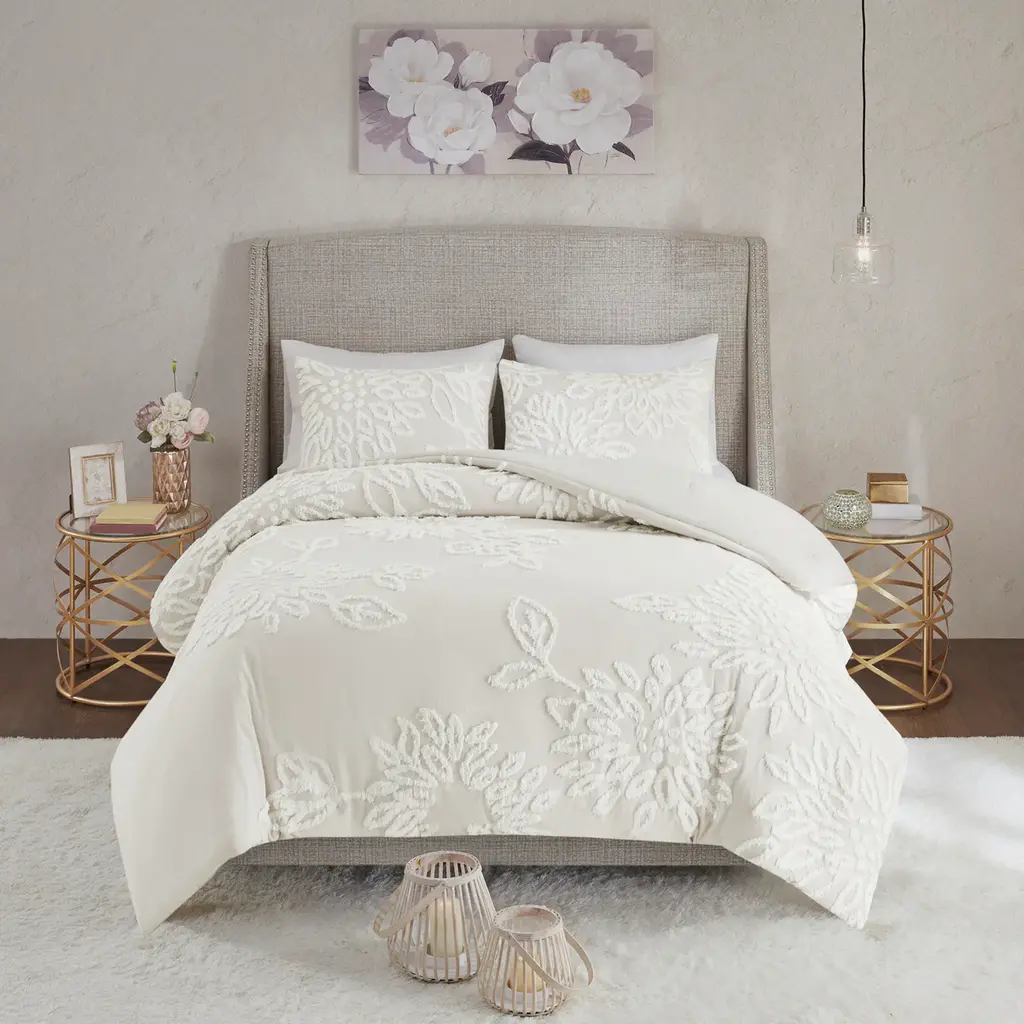 Complete your bedroom decor with the Madison Park Veronica 3 Piece Tufted Chenille Floral Comforter Set. The shabby chic comforter features off white cotton tufted chenille floral pattern on a off white ground that creates a soft cozy style. The 2 matching shams mirror the design of the comforter to complete the farmhouse aesthetic, while hypoallergenic filling in the comforter provides exceptional warmth and comfort. Machine washable for easy care, this tufted chenille comforter set offers a soft shabby chic look to elevate your bedroom decor. Due to the nature of the chenille fabric, some shedding will occur naturally in the first 3-4 washes. Items in the set may come in a rolled or compressed packaging, which will need to be fluffed up or steam ironed before use to remove wrinkles.