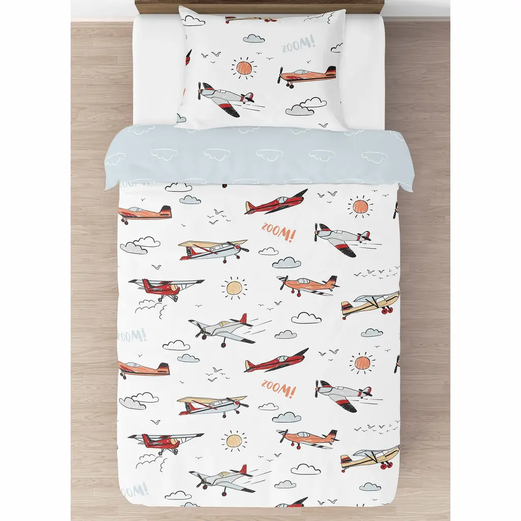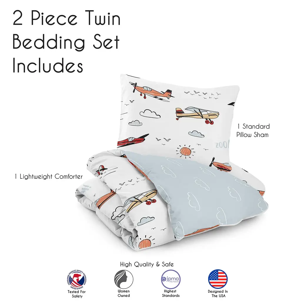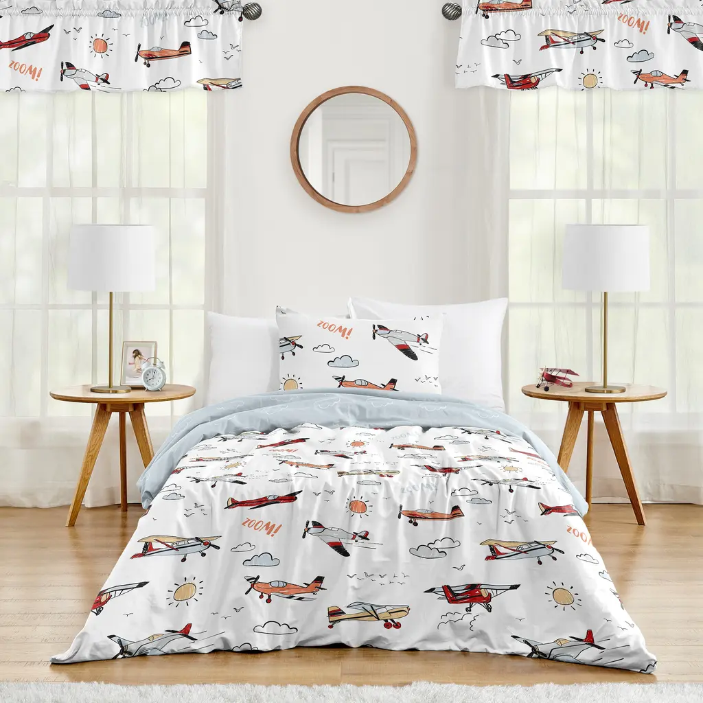 Vintage Airplane Boy 2Pc Twin Comforter Set - Grey Yellow Orange Red White Blue Airplanes Air Plane Transportation Clouds Sky - Red, Blue, Orange