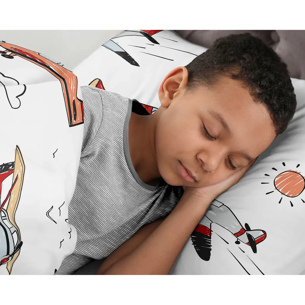 Transform your child's bedroom into a cozy and stylish retreat with our 2pc Red and Blue Airplane kids bedding sets for boys by Sweet Jojo Designs. Designed for people who love both style and comfort, this twin size bedding set features vibrant colors and fun patterns. This twin bedding comforter sets for boys uses a sensational collection of exclusive, brushed microfiber fabrics. This all-in-one twin bed in a bag set includes a super-soft twin blanket and a matching pillow sham, offering the perfect blend of warmth, comfort and durability. The soft comforter features a fun coloring book inspired vintage air plane print and a coordinating cloud print. The colorful palette of red, orange, yellow, light blue, grey and black will create the perfect aviator themed bedroom. This versatile collection has you covered with the perfect toddler twin bedding set for any airplane lover in your family. Our twin bedding sets for children provide softness & quality, making it perfect for those who appreciate luxury bedding without the hefty price tag. Whether you're updating your guest bedroom essentials, need extra bedding, or upgrading your child's room, this twin bedding set is a must-have. This boys bedding sets twin by Sweet Jojo Designs will fit all standard twin size beds and is machine washable for easy care and repeated use. 2PC TWIN BEDDING SETS FOR BOYS INCLUDES: Lightweight Comforter (62in. x 86in.) & Standard Sham (20in. x 26in.). Easy machine washable and dryable on low. This transportation airplanes twin comforter set for boys is made with super soft, moisture wicking brushed microfiber fabric and features the colorful palette of red, orange, yellow, light blue, grey and black. AVIATOR AIRPLANES THEME: This twin boys bedding set boasts a soft blanket & pillow case sham. The bed comforter features a fun coloring book inspired vintage air plane print and a coordinating sun, sky clouds print. This twin bed set has a matching pillow sham.