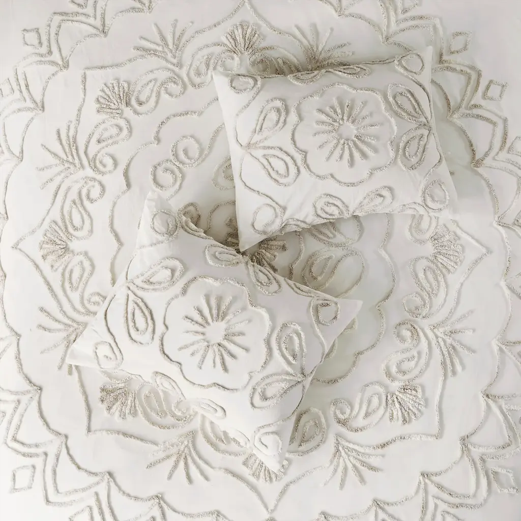 The Madison Park Violette 3 Piece Tufted Cotton Chenille Comforter Set offers a globally inspired update to brighten your bedroom decor. A large tufted chenille medallion is displayed in the center of the comforter, creating an elegant textural look. Matching shams mirror the beautiful design on the comforter to complete the cotton bedding set. This bedding set is OEKO-TEX certified, meaning it does not contain any harmful substances or chemicals to ensure quality comfort and wellness. Due to the nature of the chenille fabric, some shedding will occur naturally in the first 3-4 washes.