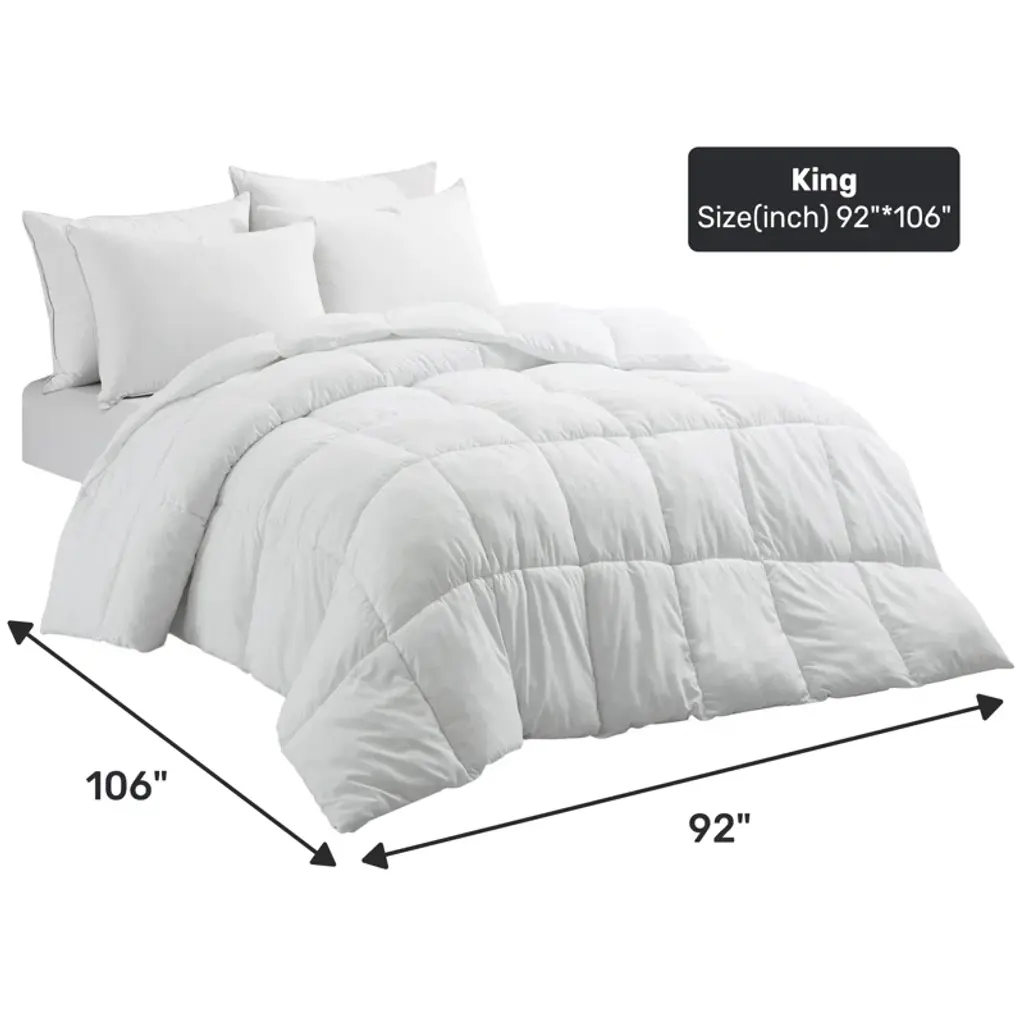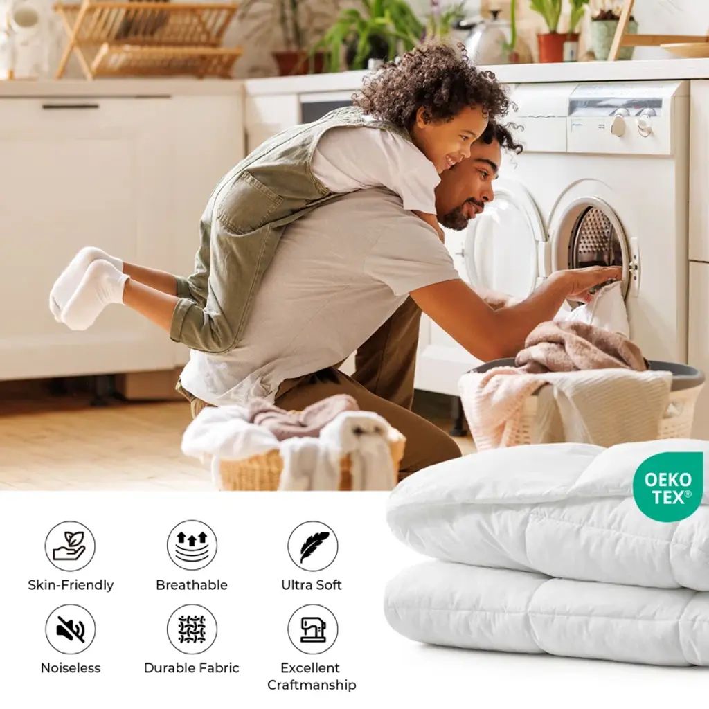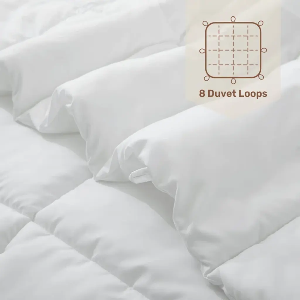 Cozy up at night with this lightweight comforter. Filled with 100% polyester, this comforter provides just the right amount of warmth without being too heavy. The white microfiber cover is soft to the touch, and the sewn-through box-stitch construction ensures the filling stays evenly distributed across your bed, no matter which side you prefer. Plus, this comforter features duvet corner ties, so it's easy to attach to your favorite duvet cover (not included). To care for this comforter, simply machine wash and tumble dry.