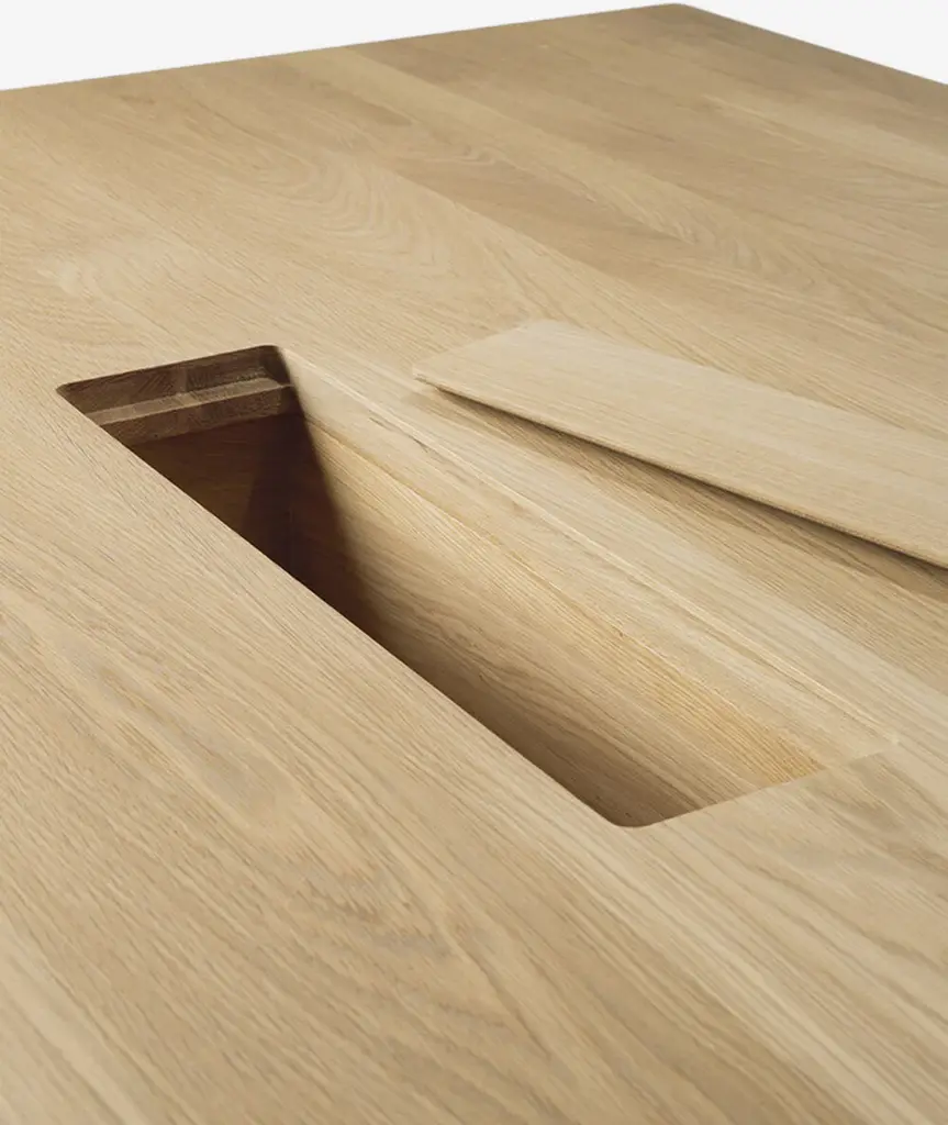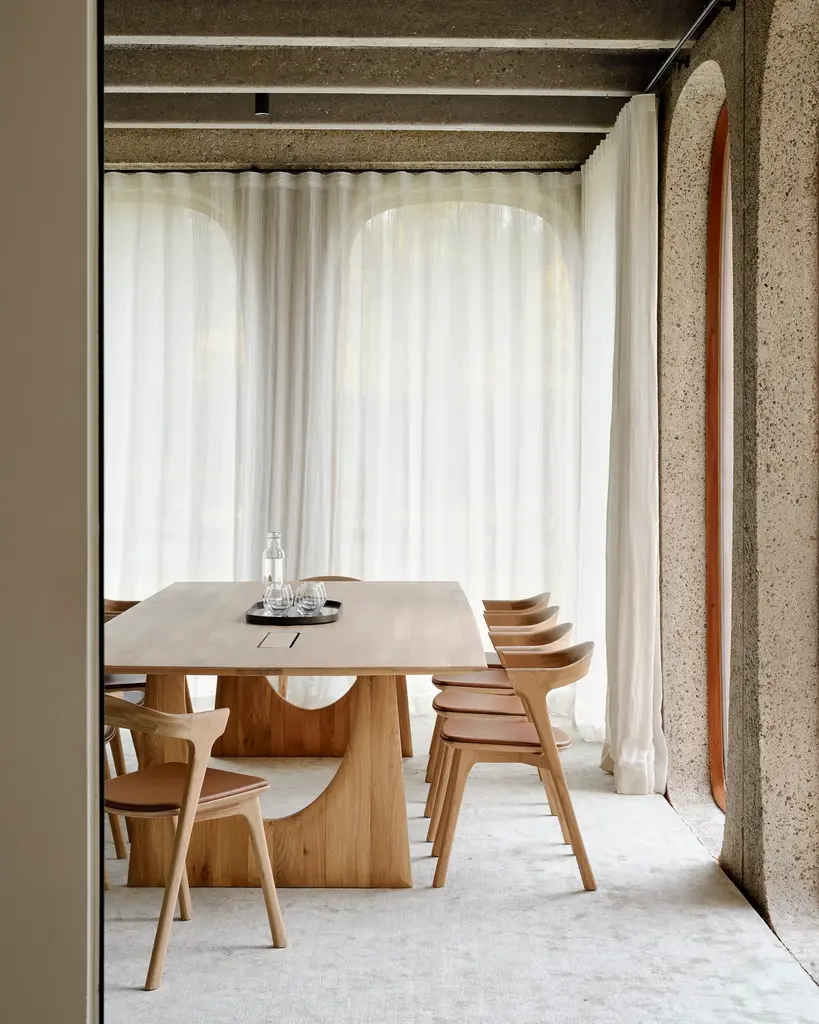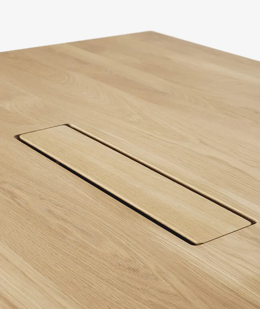 In the Geometric collection, shapes intersect in unexpected ways, creating playful contrasts with light and shadow at every angle. The Geometric meeting table elevates a professional space with softened edges and natural lines at play, adding volume and practical comfort further enhanced by integrated wire management.