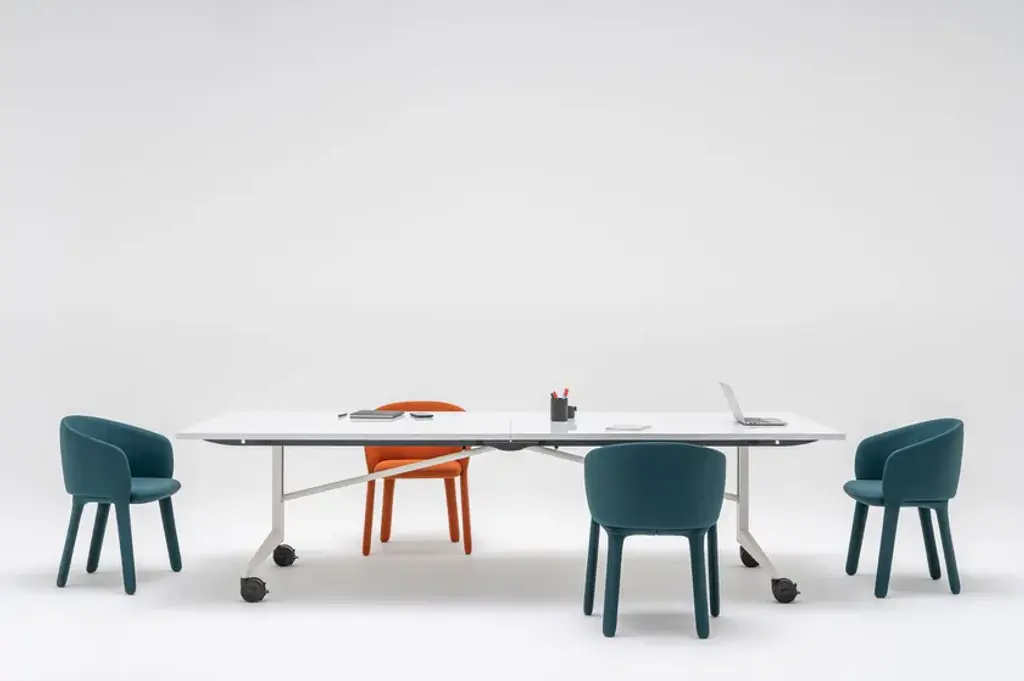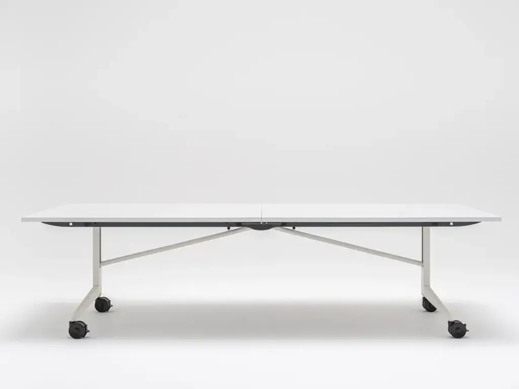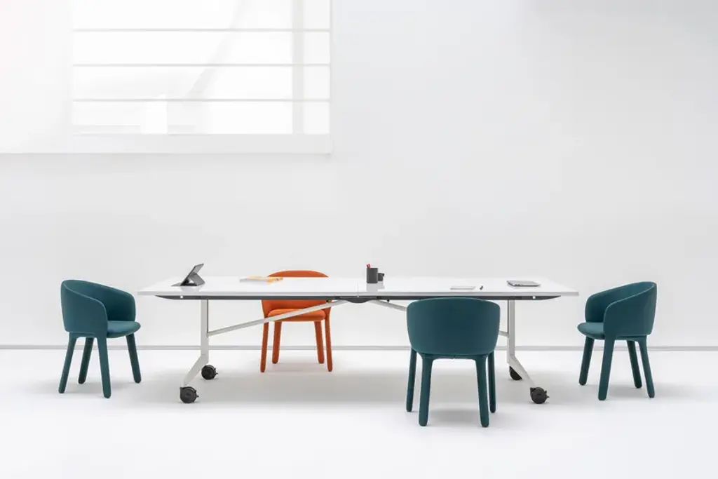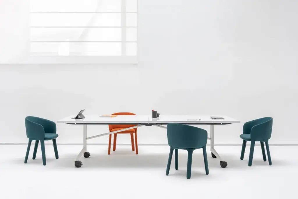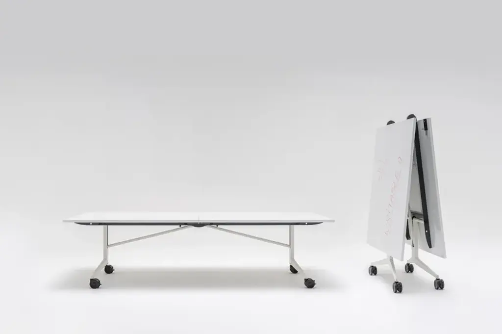Plex is a compact table suitable for conference rooms, studies as well as open space offices. It is a great companion of various meetings, workshops, and training. The advanced folding mechanism allows for manoeuvring the table but just one person. Once folded the width of the table decreases to 50 centimetres what helps to move the table through the door, transport it with a lift or store in smaller spaces. Plex is equipped with a protection mechanism which secures user from hand jamming during folding and unfolding of the table. The .mdd offer includes three different shapes: rectangular, rectangular with rounded edges, and barrel. What is more, there are three finishes available: melamine board, nano-tech Fenix laminate, which stands out with its high scratching and abrasion resistance as well as dry-wipe whiteboard allowing to create notes directly on the table. Universal design and monochromatic colours make the table match the leading style of the interior composing an aesthetically coherent arrangement.