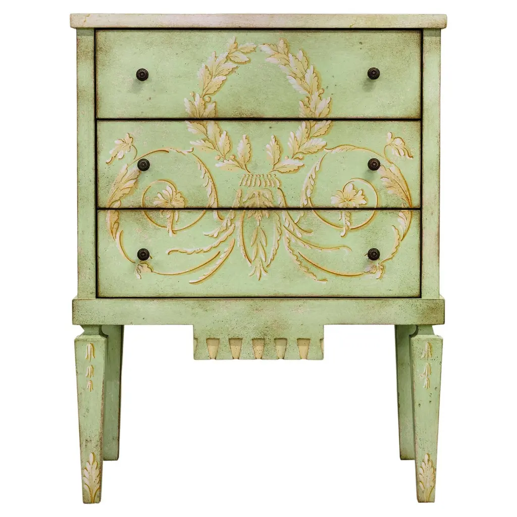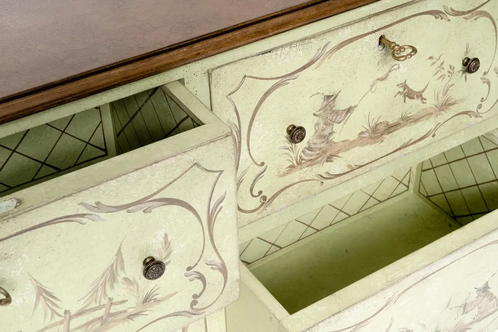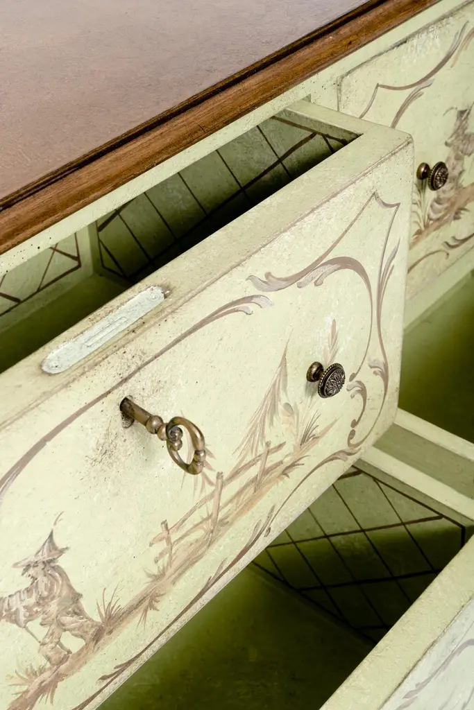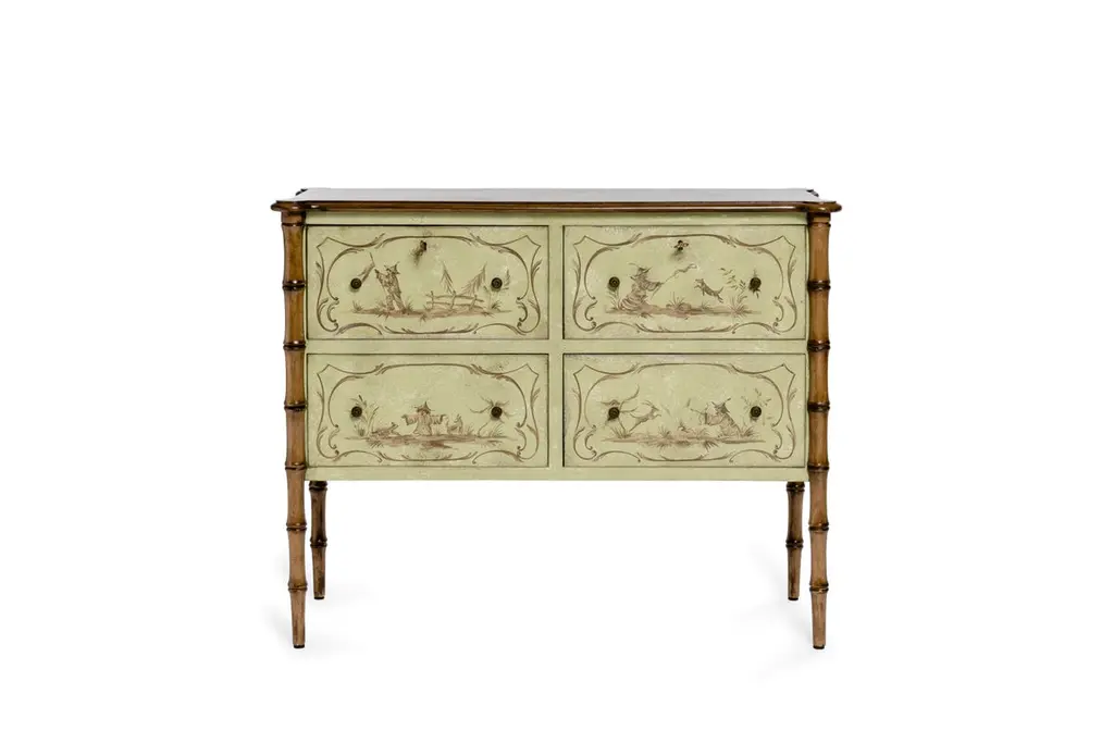 From our hand painted Furniture Collection, we are pleased to introduce you to our Apple Green Bamboo Lombardia Console with drawers. This beautiful creation is the perfect balance between the old-world of Venetian hand-painted Furniture and the new looks of today's design. In fact, the classic Venetian chinoiserie is hand-decorated using a light palette of colors, going from the apple green base, to the different shades of brown, greys and ochre of the detailed decoration. Lastly, the piece is made more contemporary and whimsical by the use of the bamboo, that becomes the perfect last touch, giving character and timeless appeal to the piece. Like all our furniture, this beautiful chest is made from scratch using the very best XVIII C. Venetian techniques of hand-painting and decorating. Of course, any colors and decorations can be entirely customized according to our customers’ requests. Set your imagination free and reach out to create your bespoke piece of furniture!