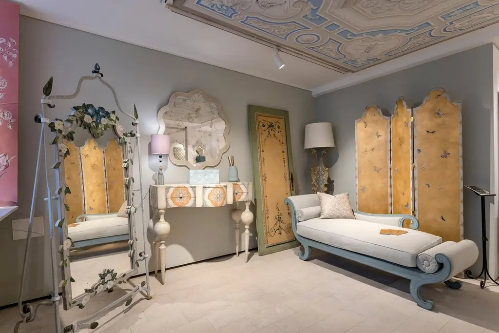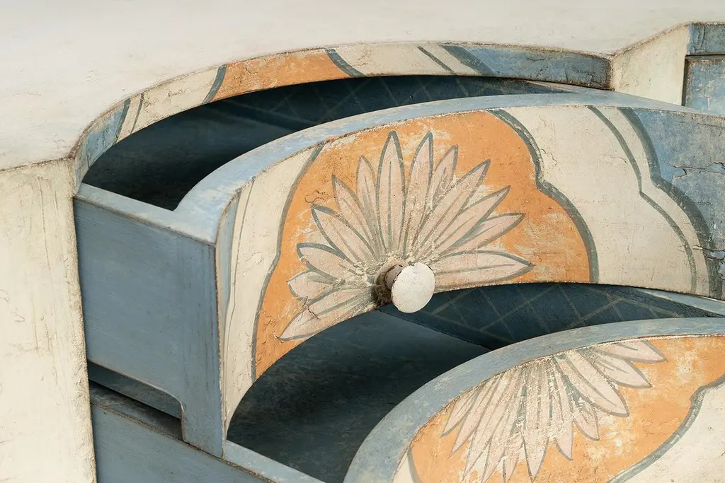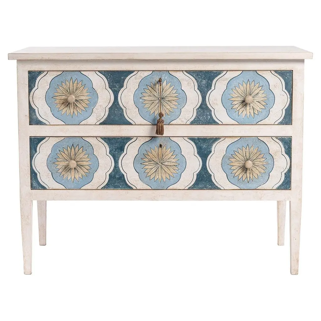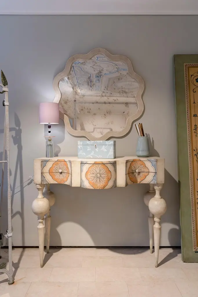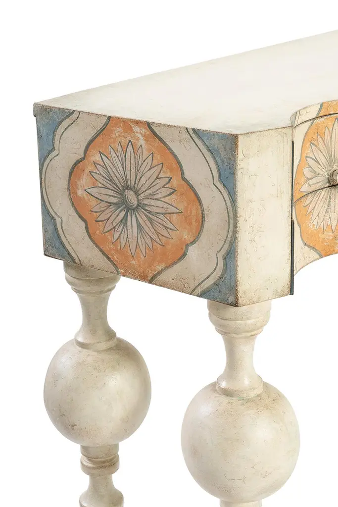 From our hand-painted Furniture Collection, we are pleased to introduce you to our sunflower console in white. At Porte Italia we like to play with shapes, colors and finishes and sometimes we just go bold. Like in this case, with our Sunflower Console in White with a Sunflowers pattern in a contrasting palette of oranges, Parma Blue and Whites. Each piece from our Collections is entirely hand-painted on every side of the Furniture by using the very best 18th Century Craftsmanship Venetian Techniques, passed down through the generations of artists from our land. We are passionate about decorating also the inside of every drawers, in this case with our "criss-cross" decors, so that even the simple act of opening the small drawers of your Sunflower Console becomes a moment of graceful beauty.
