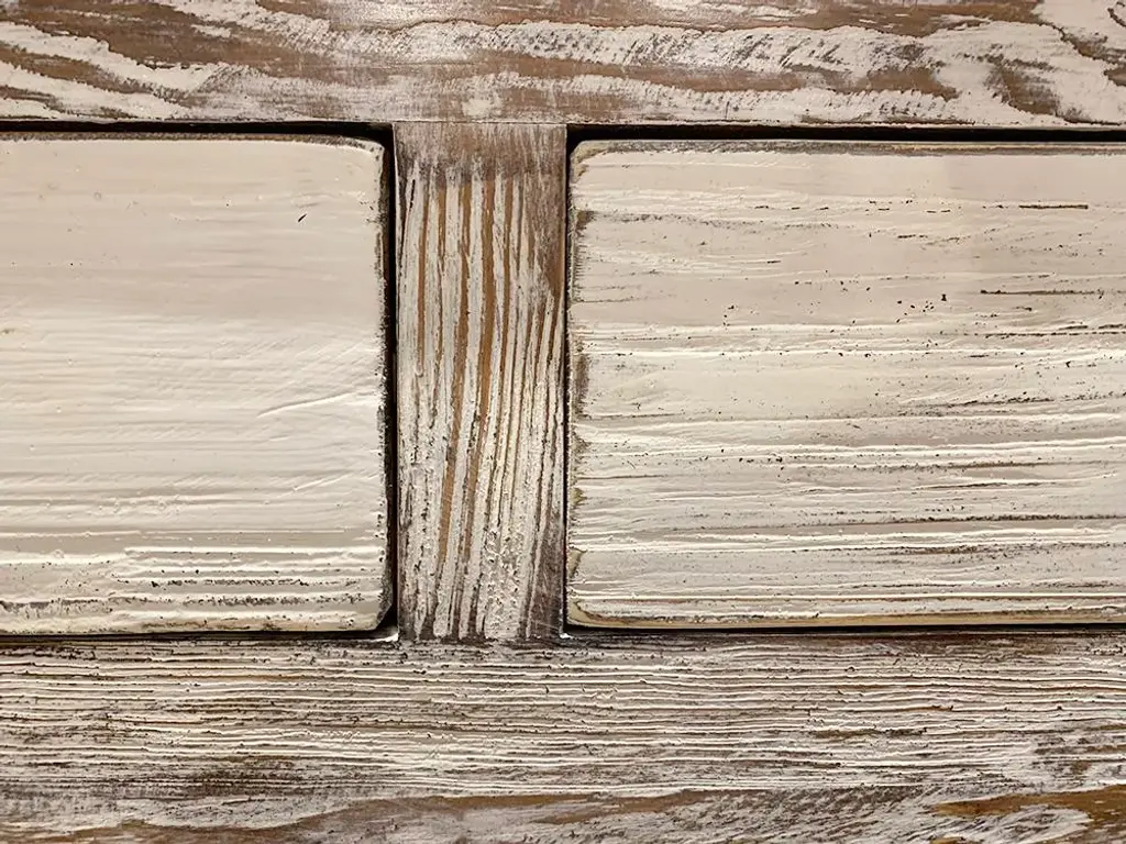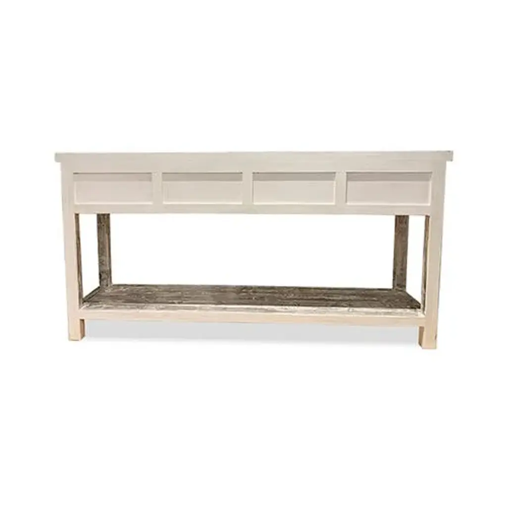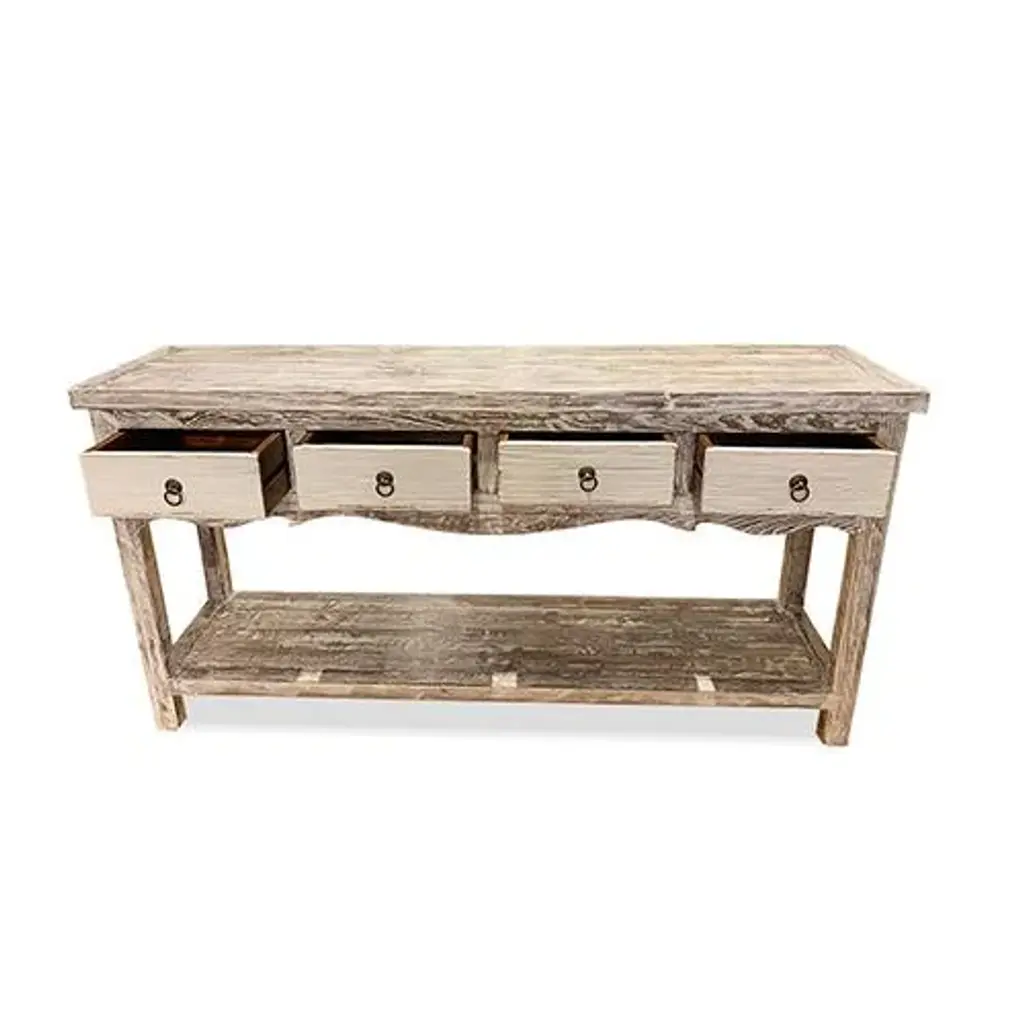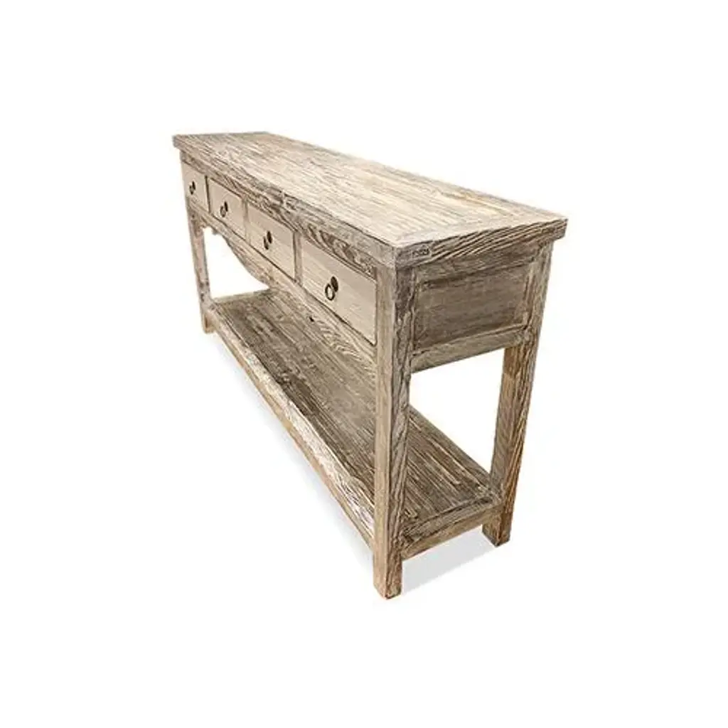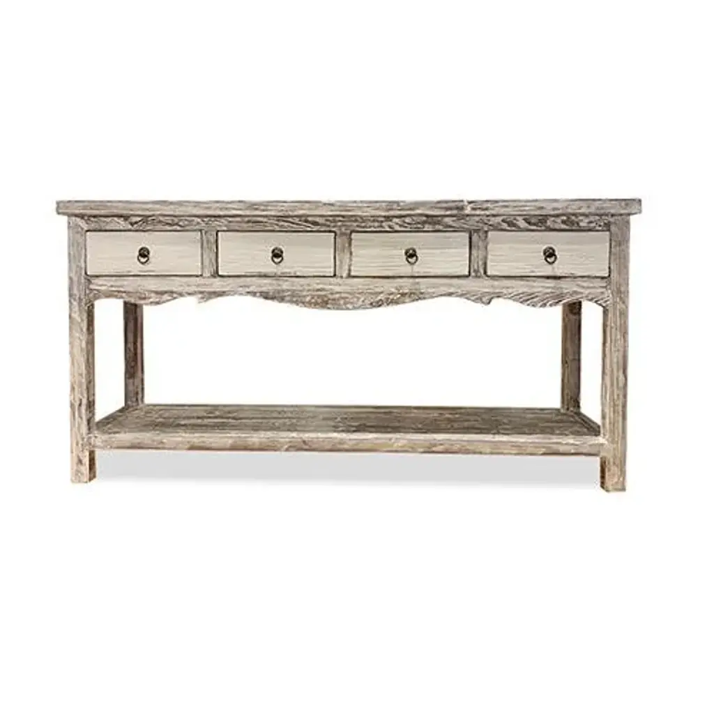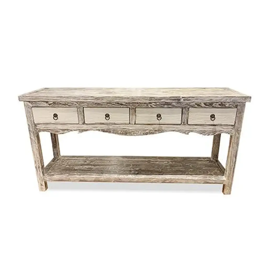 Asian White Wash Hampton Short Console Table is made out of elm wood. It has 4 drawers with 1 shelf at the bottom. It can be use at the entry or behind the sofa. Dimensions are: 59"W x 13.75"D x 30"H, Knee Width is 53.5", Knee Height from bottom shelf up is 13.5".
