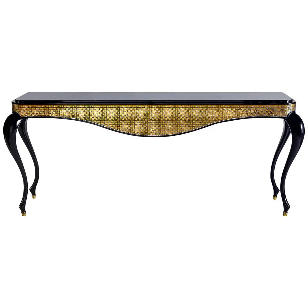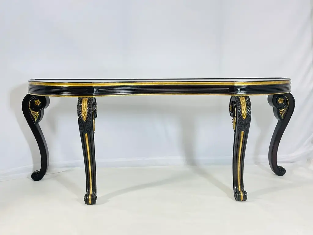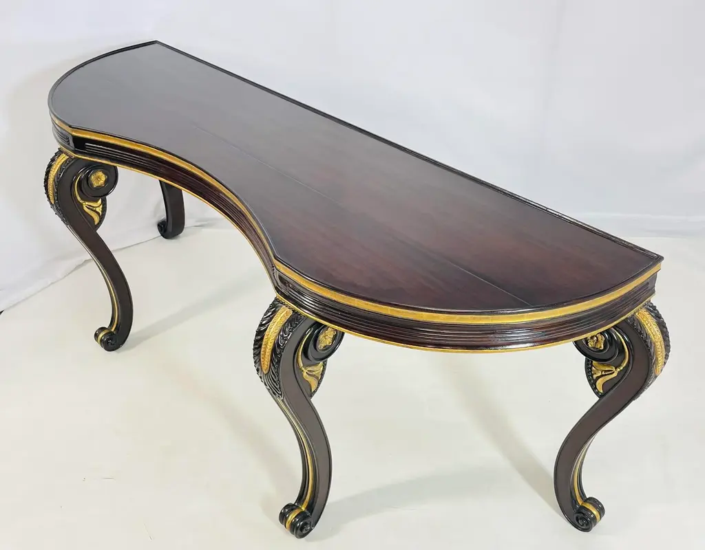 Large Console or sofa table designed and manufactured in Los Angeles California by Dessin Fournir. The table is made in a combination of mahogany wood and gold gilding with carved accents. The piece has beautiful lines and it goes perfectly with different design aesthetics. Measurements: 90.50 inches wide x 28.50 inches deep x 34.25 inches high. We have to tables in the same design. The table retains the manufacturer's label.