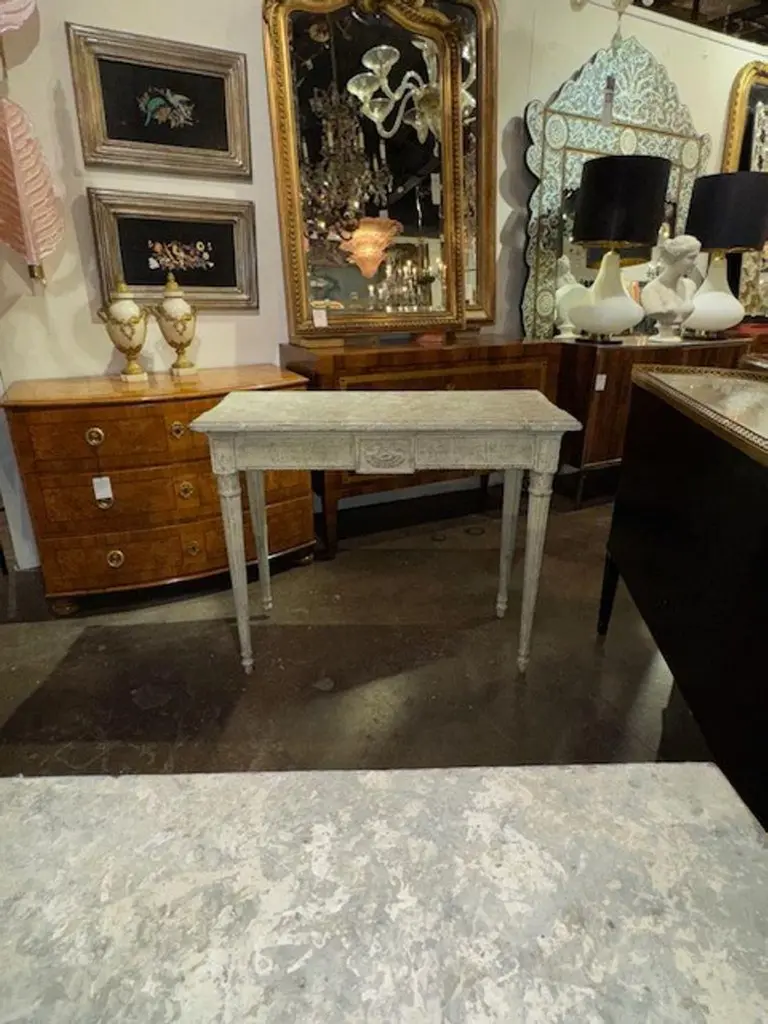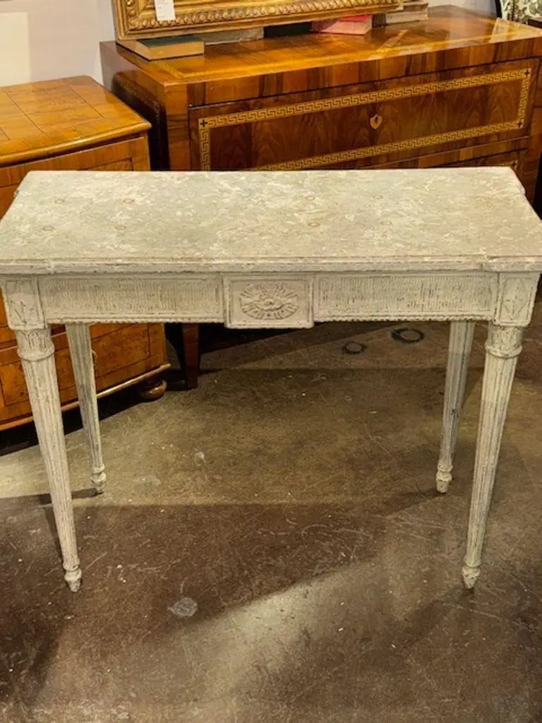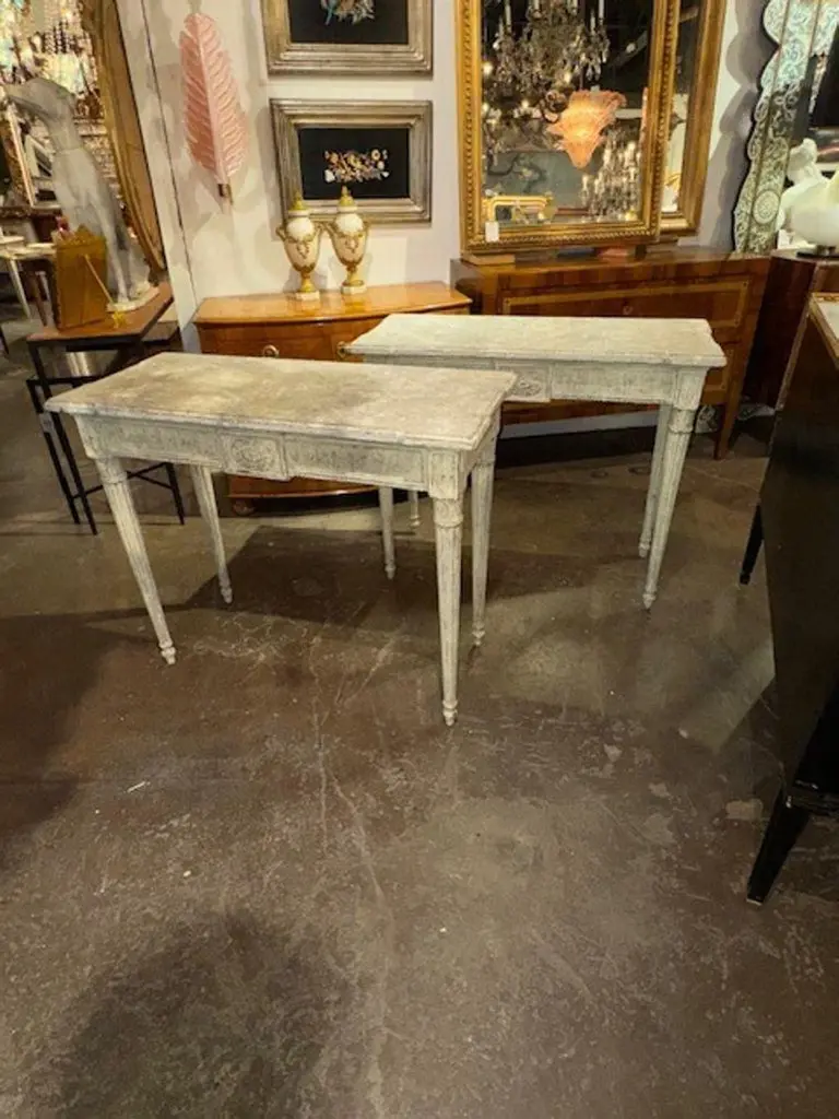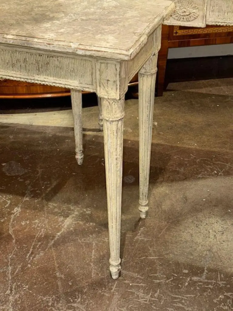 The 19th Century French Louis XVI Carved and Painted Consoles are elegant pieces of furniture that add a real touch of elegance. Perfect for adding a touch of sophistication and history to any home, these consoles would be a stylish addition to a living room, hallway, or entryway. Note 2 available. Sold separately. Circa 1890.40w x 17d x 33h