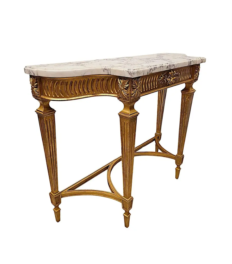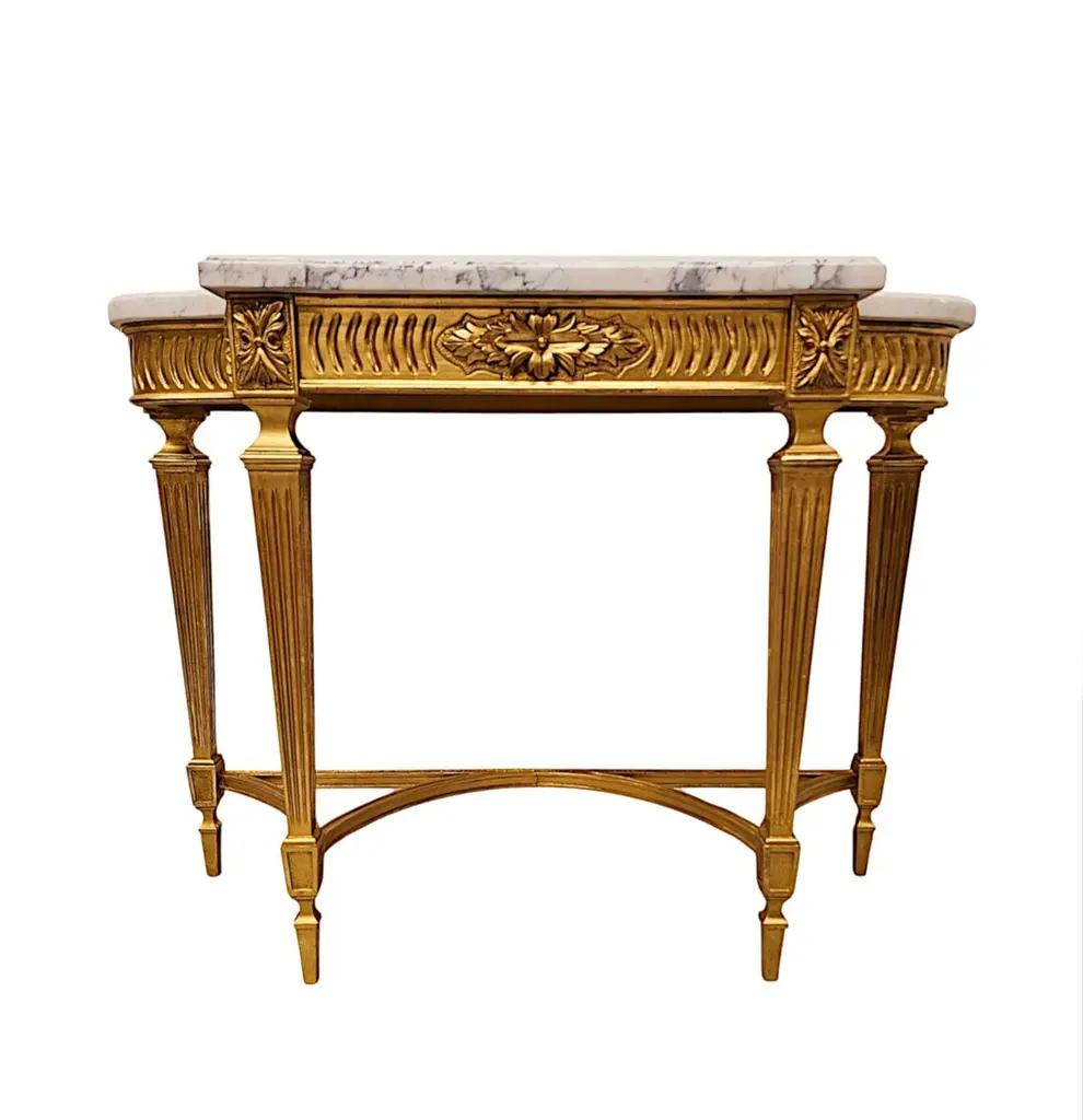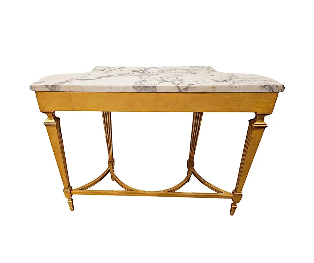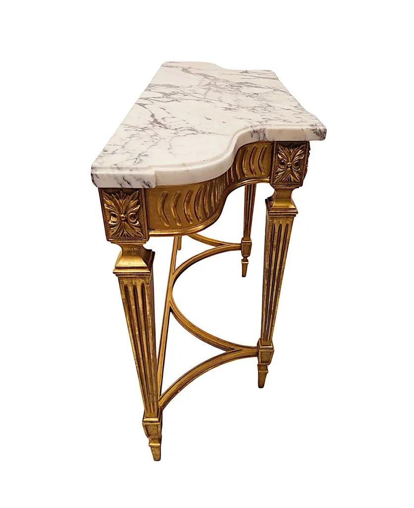 A fabulous 19th Century marble top giltwood console table, finely hand carved and of exceptional quality. The stunning moulded and shaped Carrara White marble top of shaped rectangular form with concave sides is raised over a shaped and ornately carved moulded, fluted and panelled frieze embellished with a central plaque with a beautiful arrangement of foliate and acanthus leaf motifs, flanked with panels of foliate detail. Supported on elegantly tapering square, ring turned and fluted legs, conjoined with decorative concave stretcher, terminating on stylised block and arrow foot.
