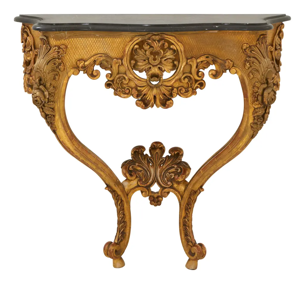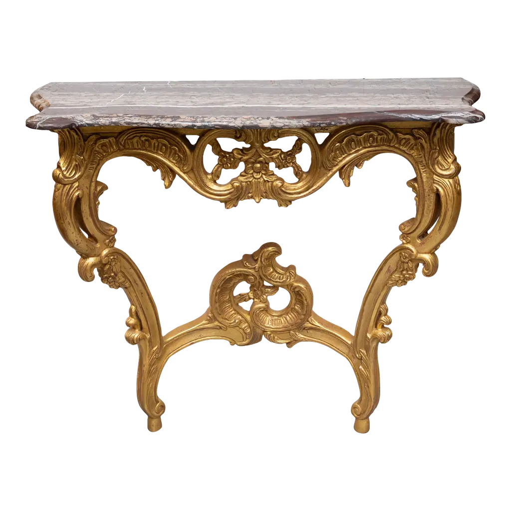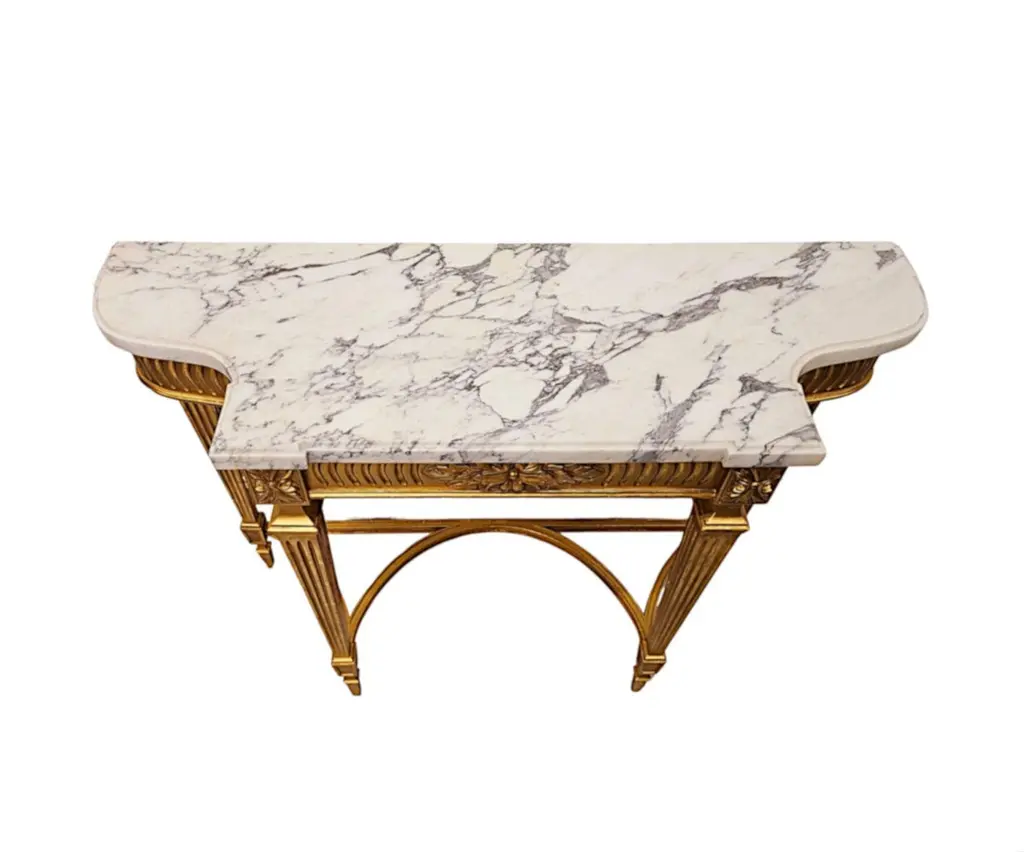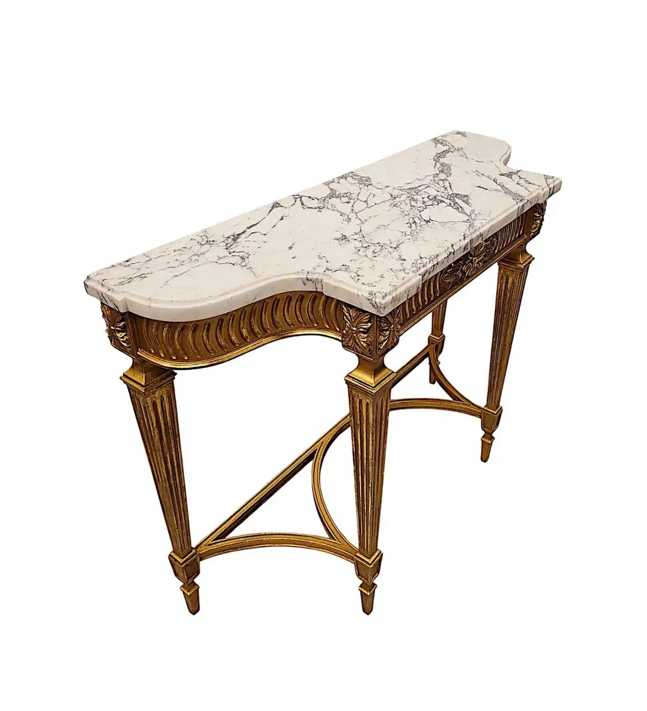 A fabulous 19th Century marble top giltwood console table, finely hand carved and of exceptional quality. The stunning moulded and shaped Carrara White marble top of shaped rectangular form with concave sides is raised over a shaped and ornately carved moulded, fluted and panelled frieze embellished with a central plaque with a beautiful arrangement of foliate and acanthus leaf motifs, flanked with panels of foliate detail. Supported on elegantly tapering square, ring turned and fluted legs, conjoined with decorative concave stretcher, terminating on stylised block and arrow foot.