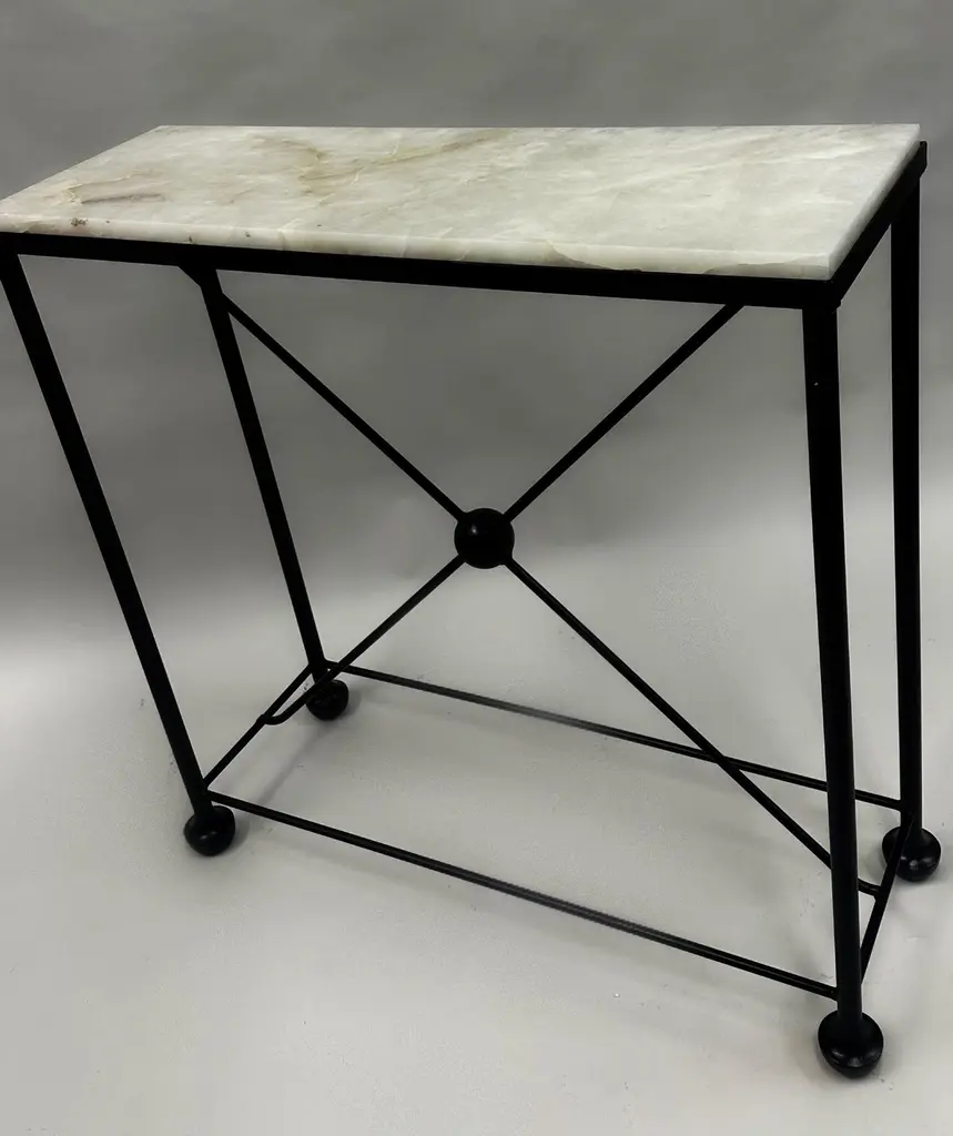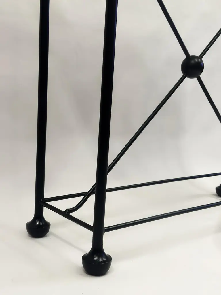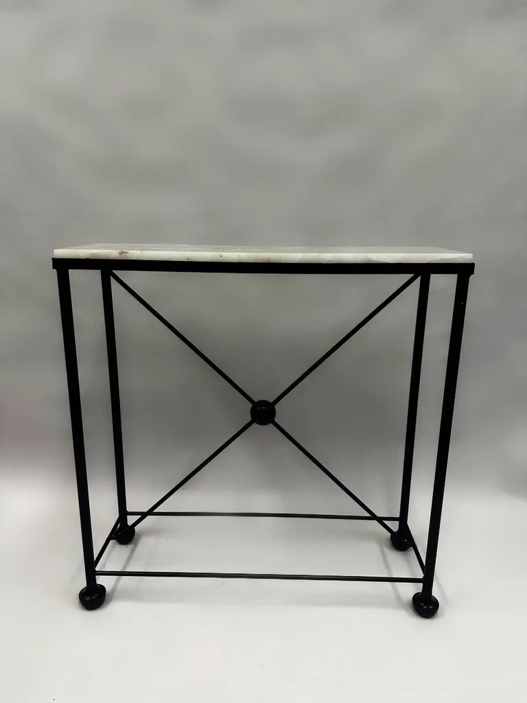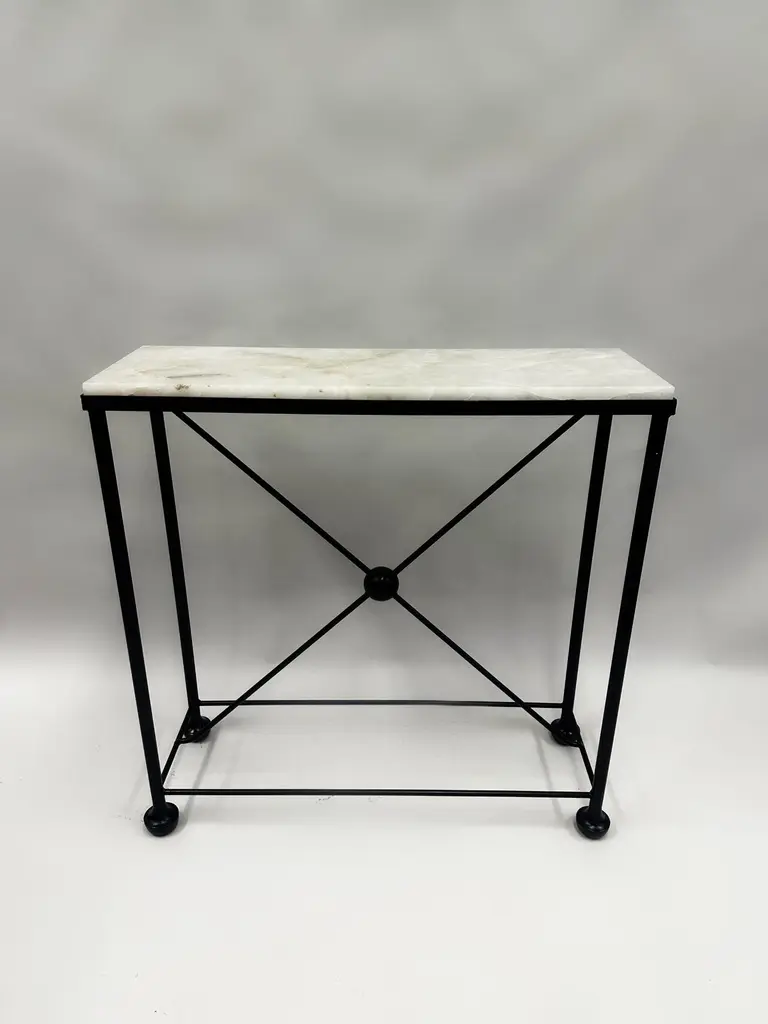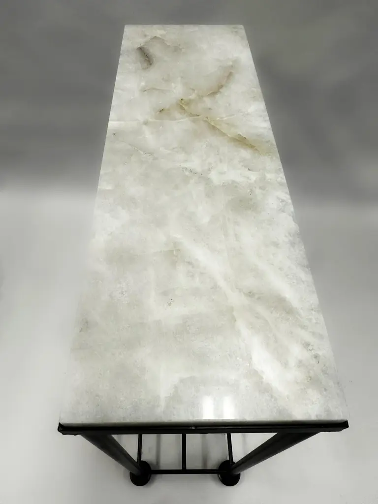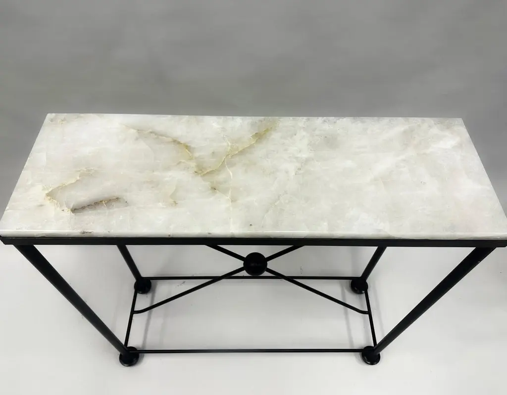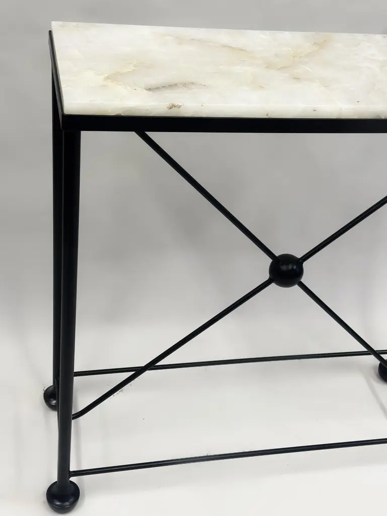 These pieces are priced and sold as individual pieces. 2 rare and elegant French mid-century Consoles in the Modern Neoclassical Spirit and composed of patinated wrought iron bases supporting solid slabs of pure rock crystal. Each console is priced and sold individually and reflect the style of Jean-Michel Frank. These unique pieces embody the pure, timeless Neoclassic spirit with X-form stretcher united by a ball form in the center of the piece. The profile is slim allowing the consoles to function in narrower spaces while maintaining a daring, sensuous appeal. Dramatic ball feet anchor the consoles to the earth providing solidity and dignity. The solid rock crystal tops allow the transparency of light to pass through them and provide a luminescent, eternal quality. France's most important designer of the 1930 period, Jean-Michel Frank, frequently used slabs of similar rock crystal in his timeless and sought after designs. Priced and Sold as Individually. Additional References: French Art Deco, Andre Arbus, Gilbert Poillerat, Raymond Subes, Emile-Jacques Ruhlmann, Gio Ponti.
