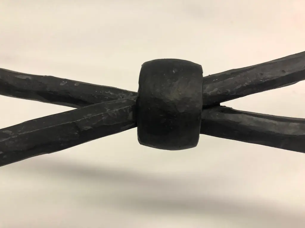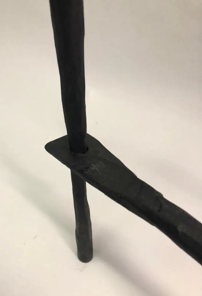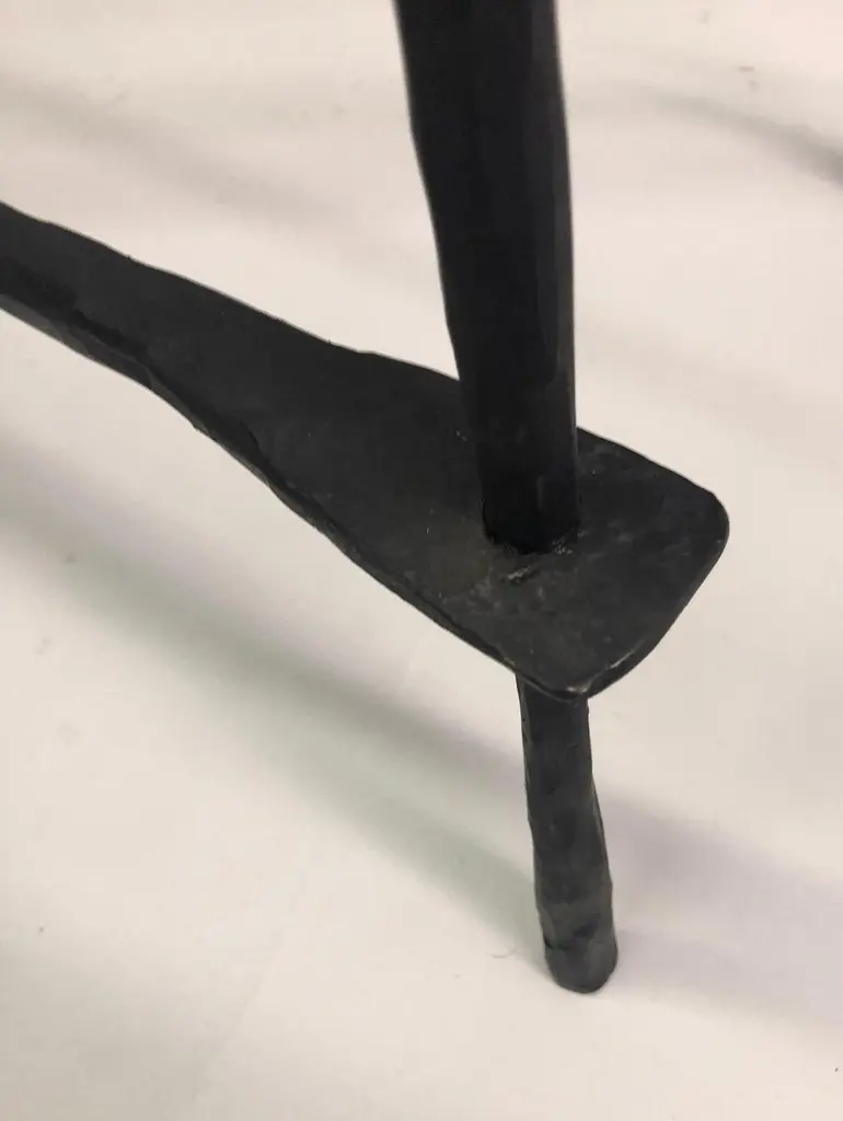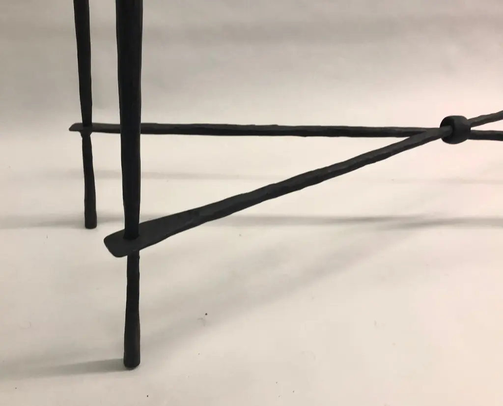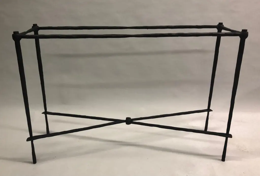 2 Italian Hand Hammered Wrought Iron Consoles in the style of Giacometti by Giovanni Banci for Hermes. The pieces feature stunning, deeply hammered iron work by Banci with an X form stretcher that traverse through a central ring. Furthermore, each leg pierces the stretchers adding to the composition. The patina is a matte black but can adjusted to suit taste.Priced and Sold as Individual Pieces. Base dimensions alone are H 31.75 x 47.5 x D 14.