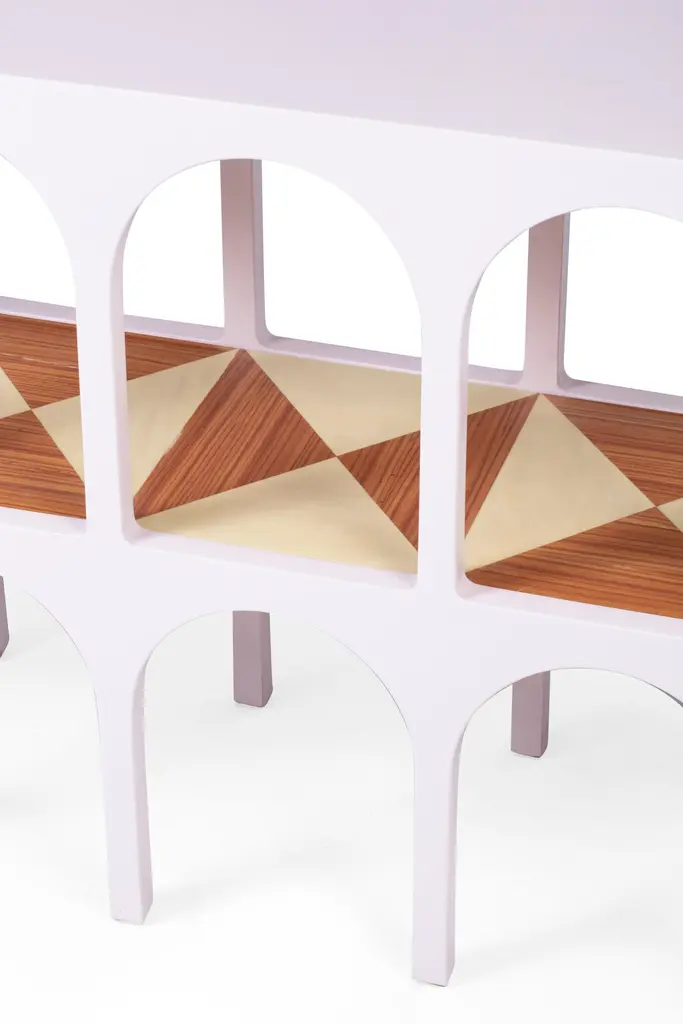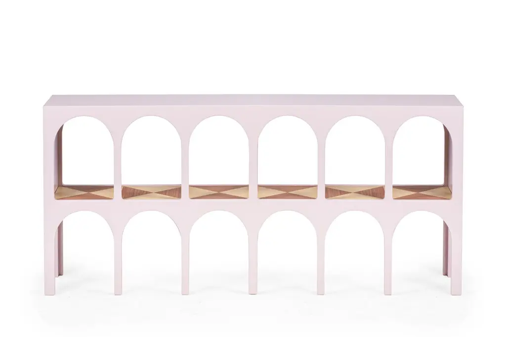 Chiostro is a tribute to Italy's immense architectural heritage. The design is a hybrid of classic and contemporary, and is characterised by rigorous lines embellished by an inlay that enhances the company's know-how. Even the workmanship is a hybrid of ancient and modern: the wooden structure is made with a CNC pantograph, while the inlay is made strictly by hand with precious woods. The lacquered finish simulates the purity of the marble widely used in classical architecture. Chiostro is not a simple piece of furniture, but a symbol of Italian culture, history and taste. FeaturesRose light lacquered wooden console table, hand inlaid middle shelf in rosewood and ashwood.Size: 140 x 30 x 65 H.Designer - Roberto RagoGraduated in "Design and Communication" in Italy, Roberto Rago is active in the product, interior, graphic and experience sectors. His design method is based on the observation of society, customs and habits, trying to investigate the interaction between things, people and space, and the ways that trigger affection towards an object. In 2016 the "Otium" project received an honourable mention from the Order of Architects of Bologna in the "The Bside" contest. In 2020 the "Lucky" project won third prize in the "Real Wood" contest organised by the Fondazione Real Sito di Carditello. Since 2017 he has collaborated as a product designer with the companies Hebanon Fratelli Basile1830 and Marmi Sacco. His works have been exhibited at the events: Bologna Design Week, Arkeda Mostra Convegno, Fuorisalone, Salone del Mobile di Milano, Edit Napoli and published on websites and magazines such as Marie Claire Maison, Case Design e Stili, Archiproduct.The Company identity - Hebanon Fratelli Basile - 183042 are the wooden species kept in our vault of centuries-old veneers, 5 of which are endangered; 2 are the result of anomalies: woods tell as much about humanity as people do.In Hebanon Fratelli Basile 1830 we operate with respect for man and the environment,using only non-toxic products for human health, formaldehyde free, wood with forest certifications and recovering processing waste as a source of complementary energy.All products are 100% certified Designed and manufactured in Italy, branded and identified by an identification number and holographic mark that guarantee their uniqueness and originality in the world.LanguageOur language stems from our cultural heritage coming from the Kingdom of the two Sicilies and from cabinetmaking of which we have internalized the discipline, technique and vision. - The carvings: they become elements that sculpt the air and dictate the rhythm of space; a game of seduction between opposites: hot and cold, masculine and feminine, natural and precious materials, pure and primary shapes alternating with organic forms of nature.- The inlays: they lose the only decorative value, acquiring in themselves the narrative value of the object; perspectives, optical illusions, sometimes provocative, sometimes sensual, sometimes ethereal and elusive, natural materials and textures that anthropomorphize nature.Prices do not include shipping from Italy.