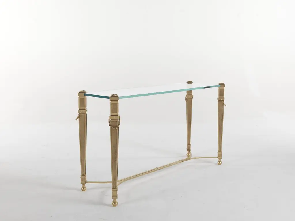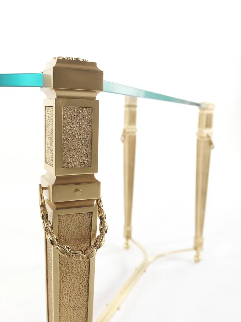 A light and refined design for Giove console. The structure, with a golden finish, features decorative elements in a neo-classical style, while the top is in extra light glass. A piece of furniture with a versatile and timeless style, able to fit into different settings.Giove Console with structure in metal with gold finishing. Lost-wax cast brass decorative elements. Top in the extra-light glass.