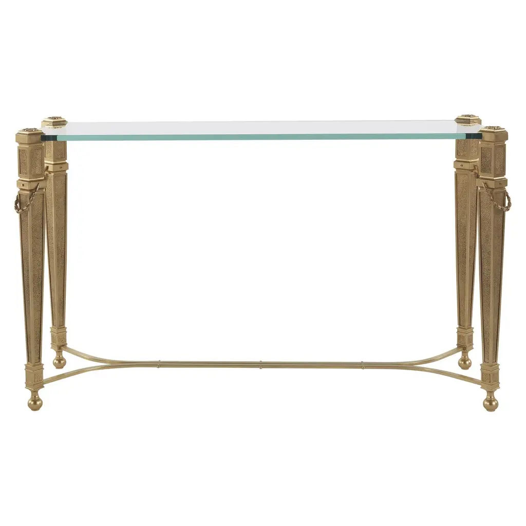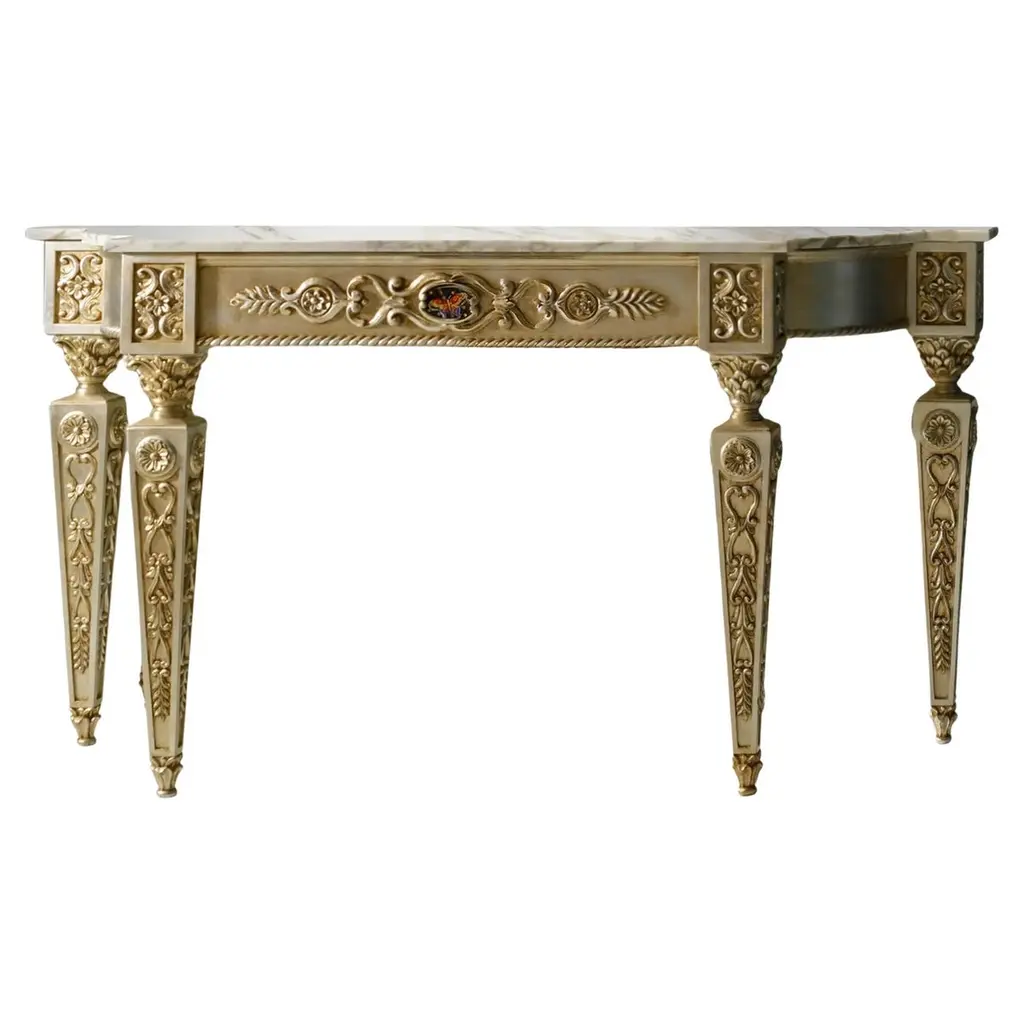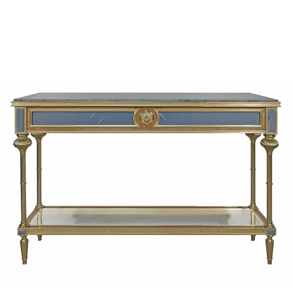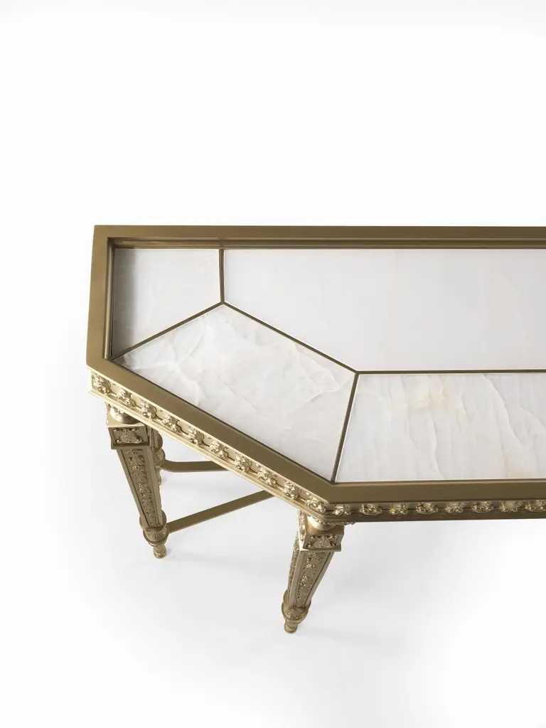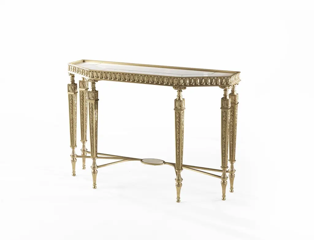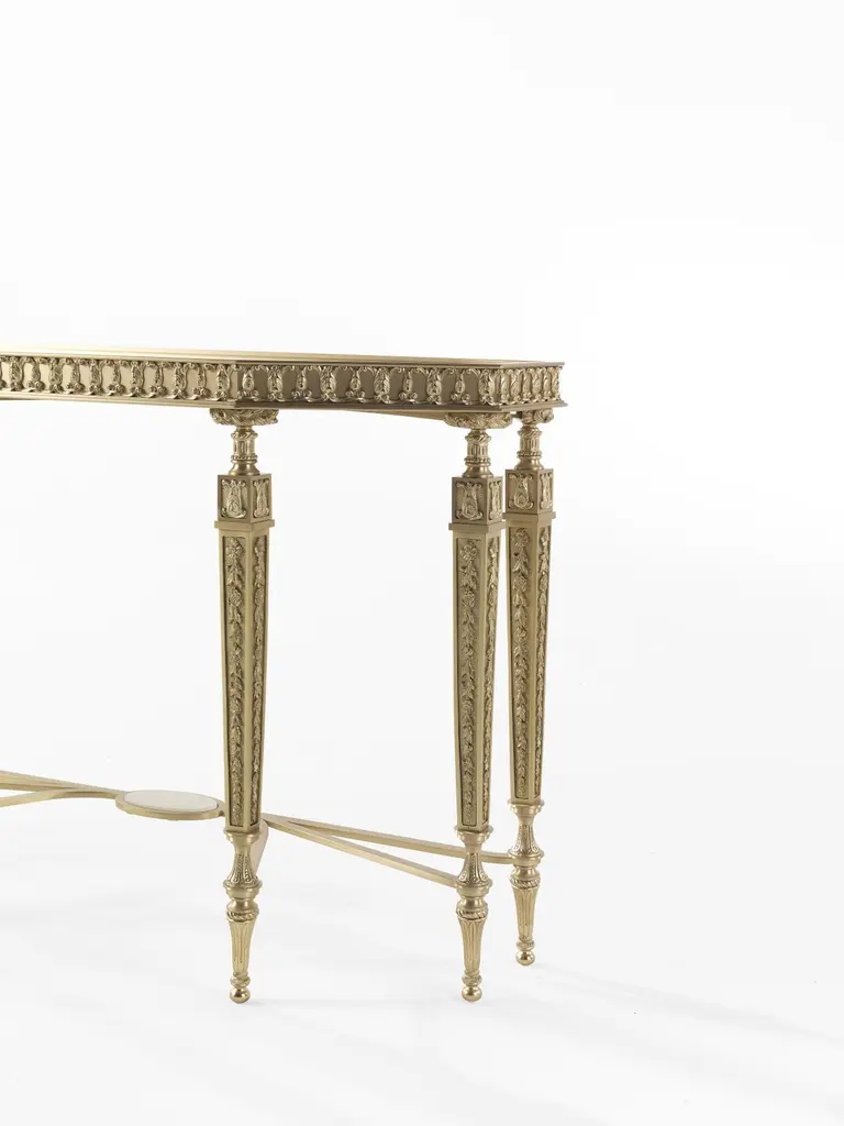 The classic elegance of the French style relives in all its beauty in the Lumière line. The console is a timeless element, radiating a sophisticated idea of luxury. A piece of furniture whose elegance is enhanced by the top in white Namibia Rhino marble.Console with structure in lost-wax cast brass with gold finishing. Top in white Namibia Rhino marble.