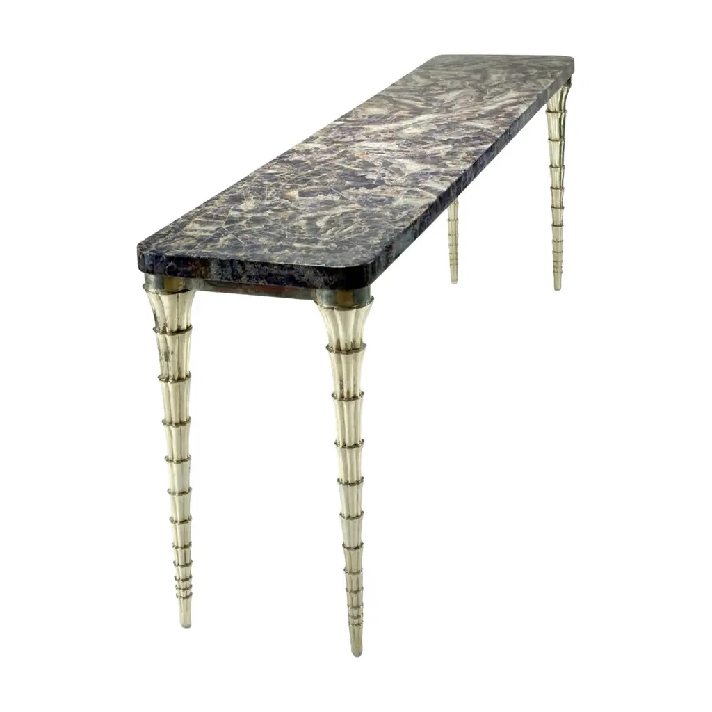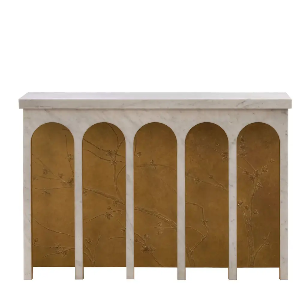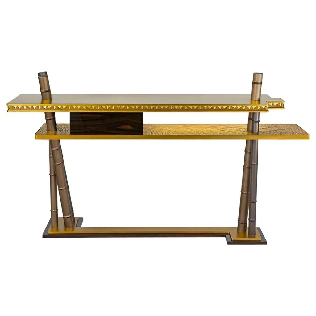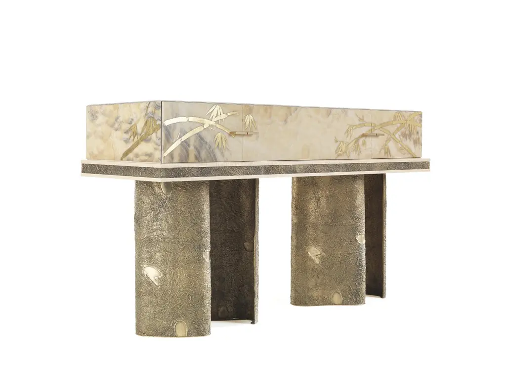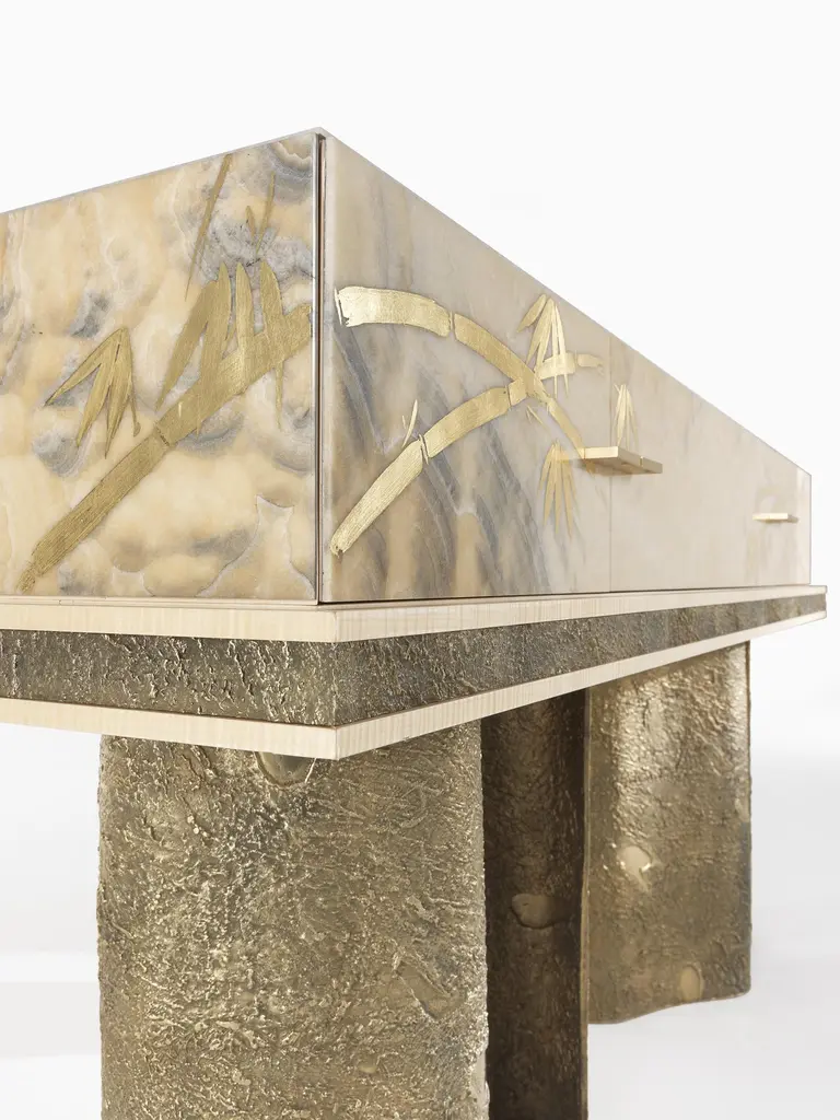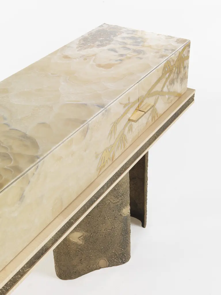 Characterized by sculptural shapes, the pieces of furniture of the Shinto line combine the essence of classic style with a contemporary allure. The pieces are distinguished by an original combination of materials, including natural maple, precious marble and brass casting. The parts in brass castings, with their materic appeal, contrast with shiny components in onyx or marble, enriched with refined decorations in gold leaf. All the pieces are characterized by an important artisanal component: the manufacturing mixes the use of experimental techniques with traditional methods handed down for centuries.Shinto console with sculptural bases in lost-wax cast brass with antique bronze finishing. Structure in maple, covered in Cloudy Onyx with gold leaf decorations. Inserts in cast brass.