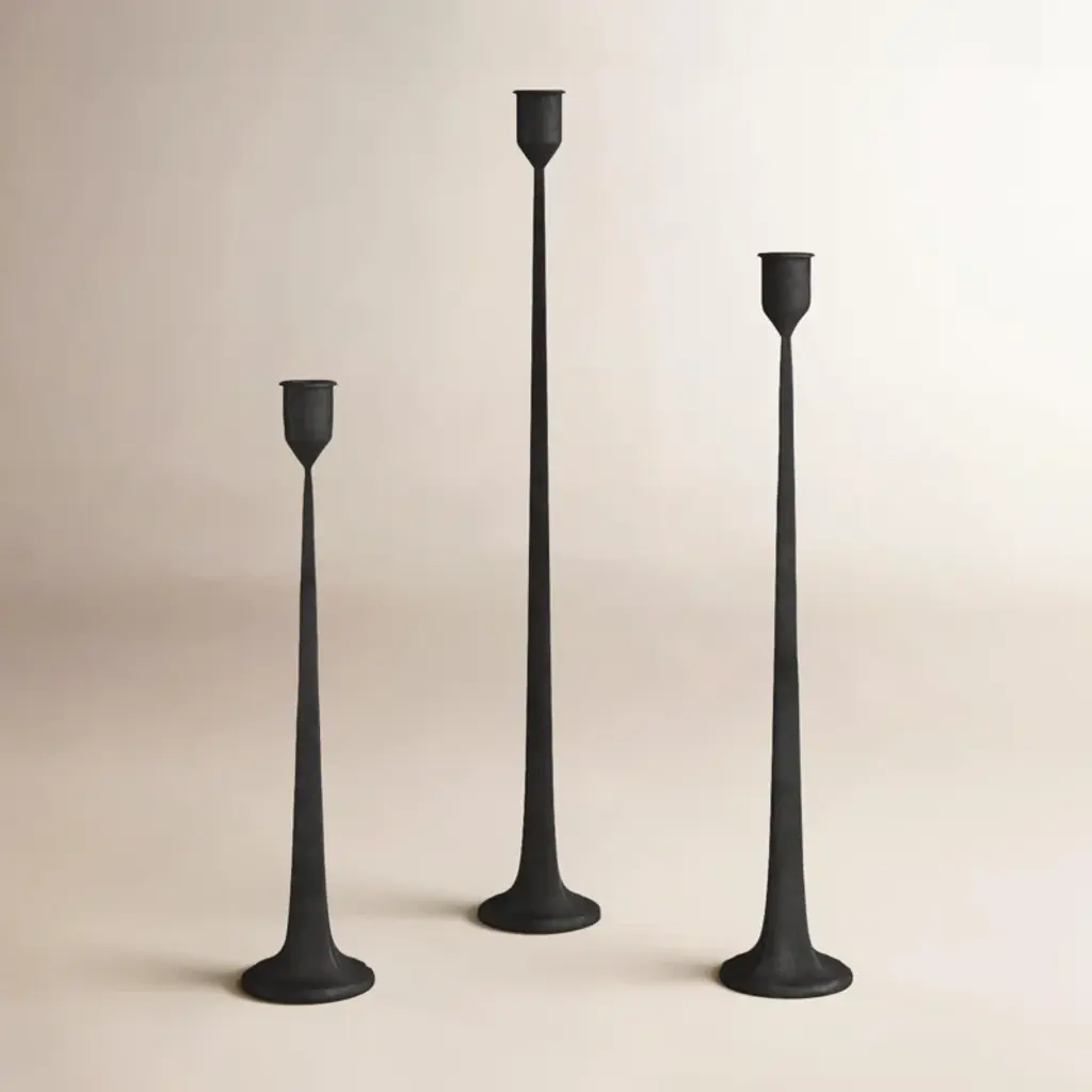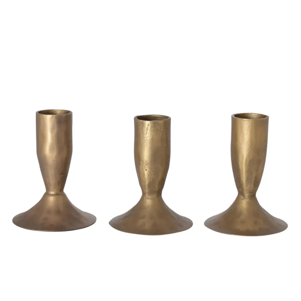 This trio of taper holders makes a bold case for simplicity. Each one is handcrafted from aluminum with a sculptural silhouette, minimal base, and warm metallic finish. Group all three for an elegant centerpiece, or space them out for subtle glow in every corner.
