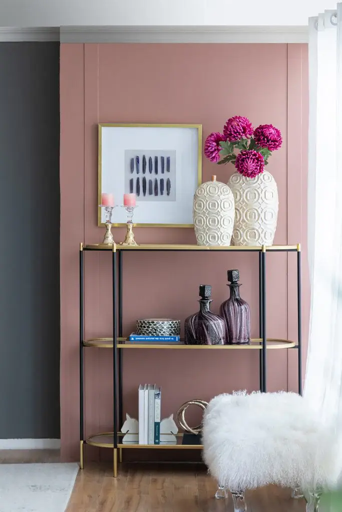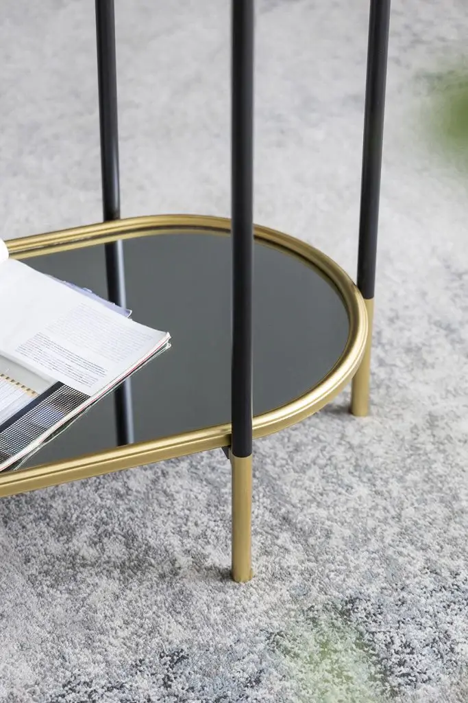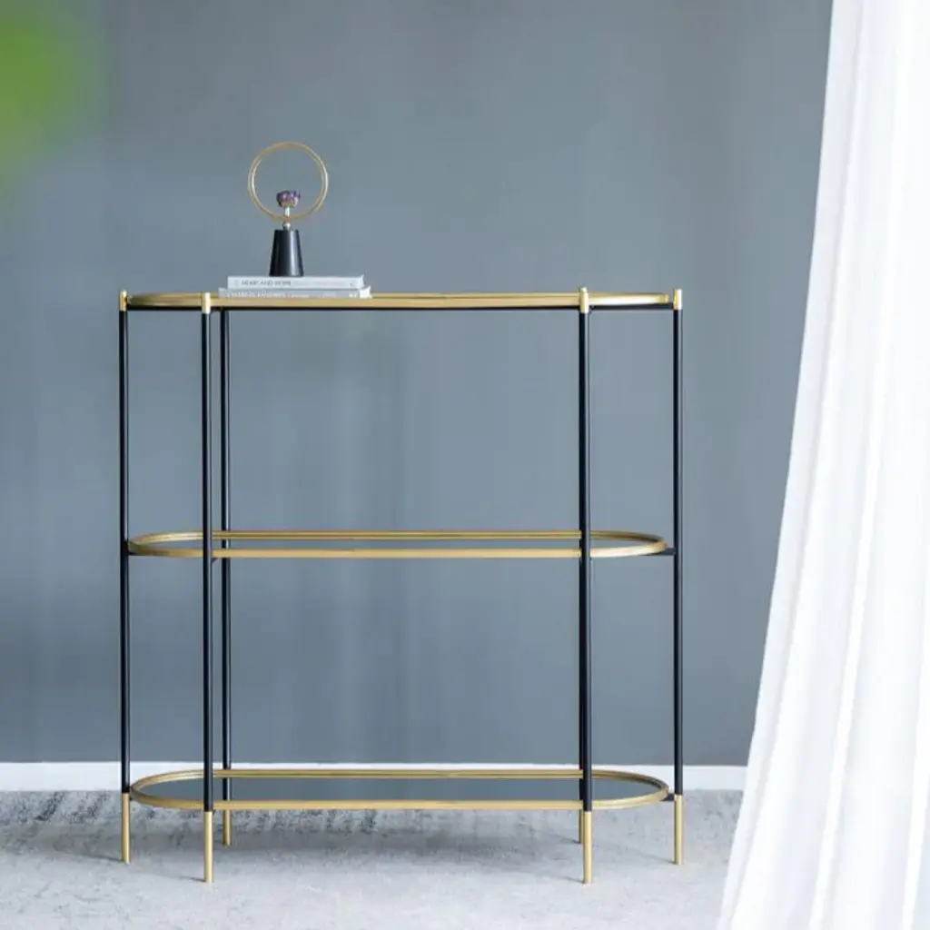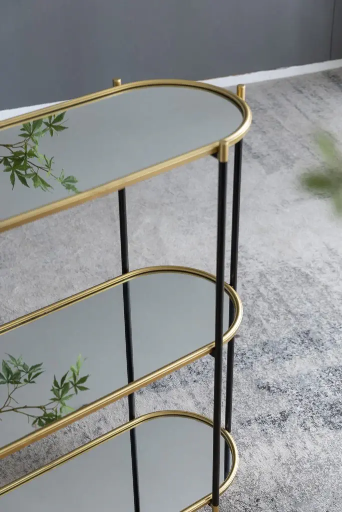 The Design The Bertram 3-Tier Metal Console Table features open shelving at different levels, featuring a mirror base to store and display your most prized possessions. Finished in a gold rim and elegant black legs, this versatile table will add a splash of luxury to your home with a modern chic feel.