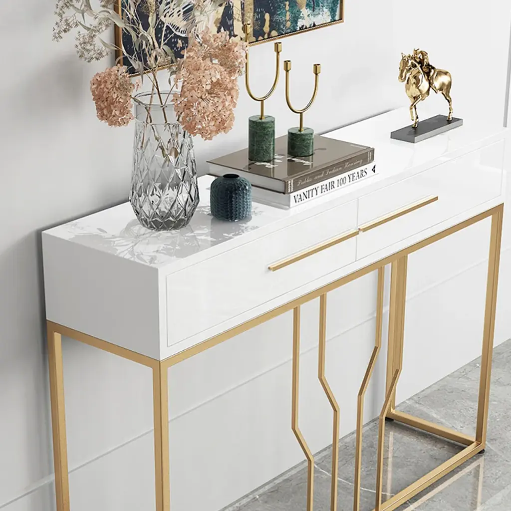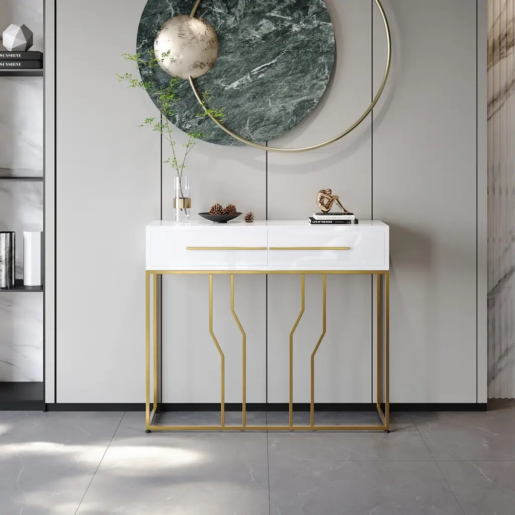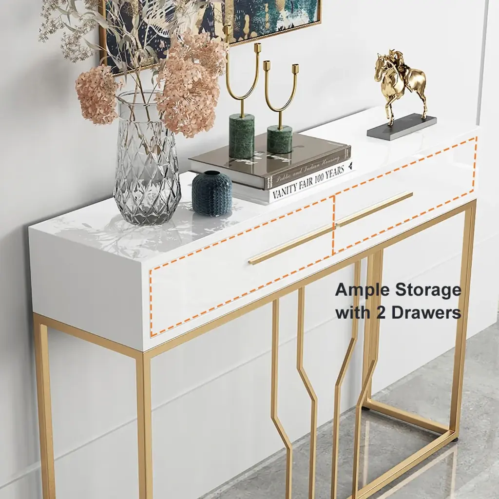 This is a white and gold console table with a sleek wooden top, perfect for photo frames and vases. Two spacious drawers clean up your space, while metal legs add to the overall elegance of the design.