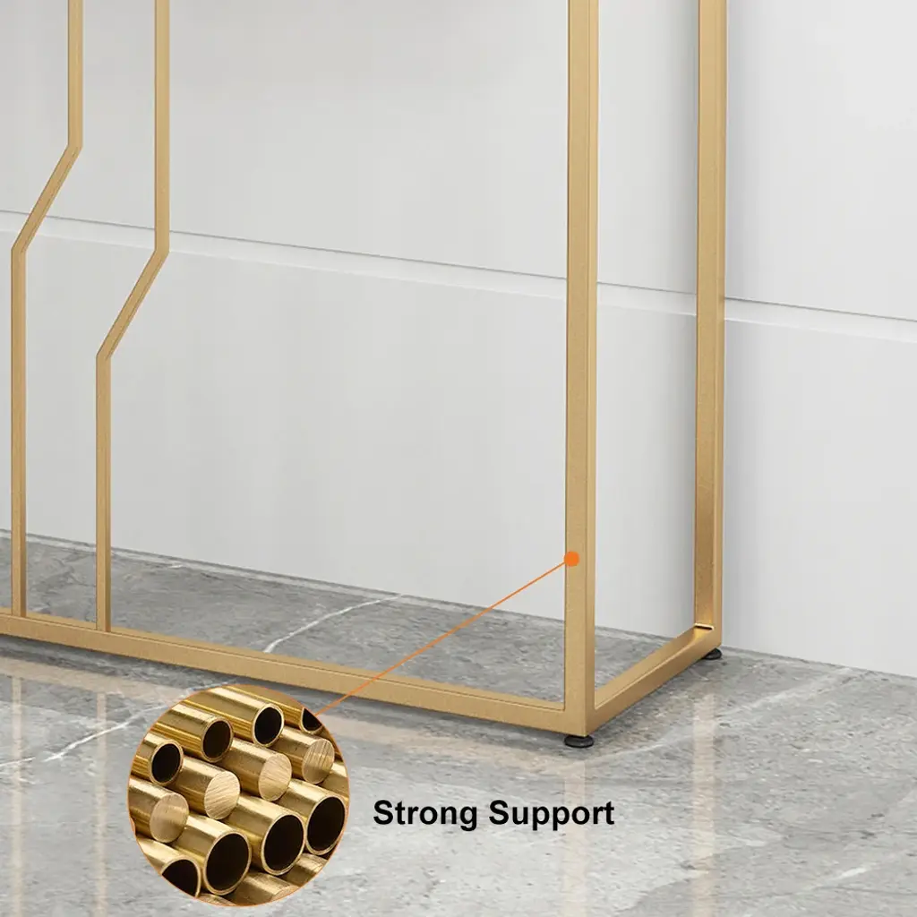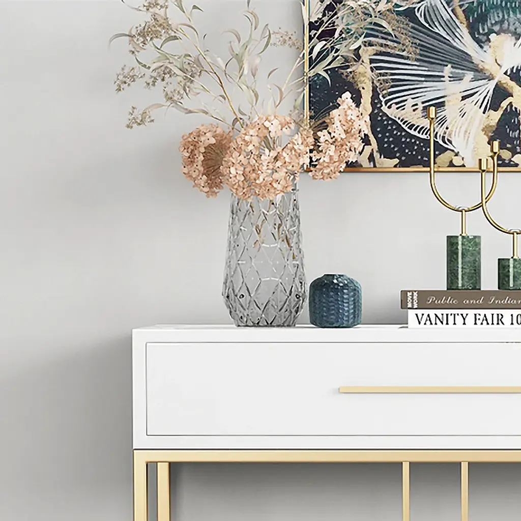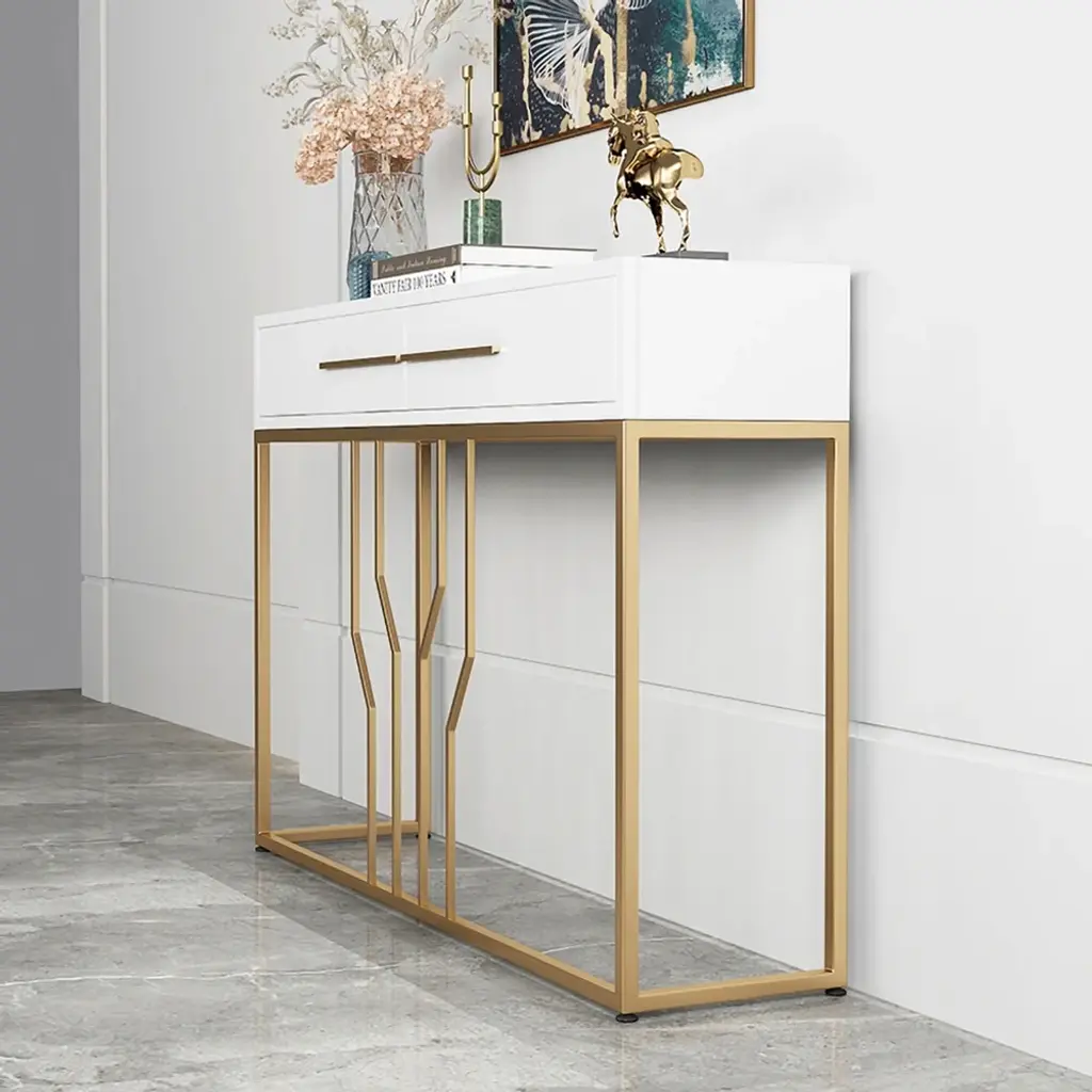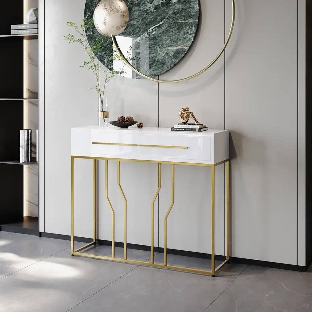 This is a white and gold console table with a sleek wooden top, perfect for photo frames and vases. Two spacious drawers clean up your space, while metal legs add to the overall elegance of the design.