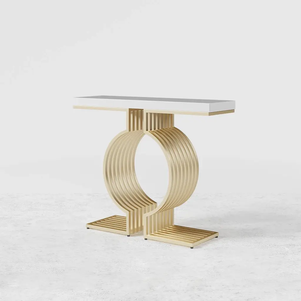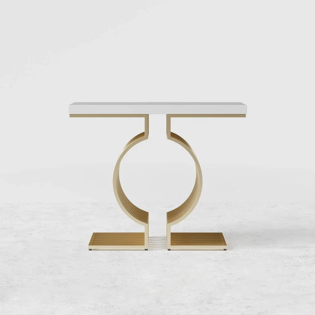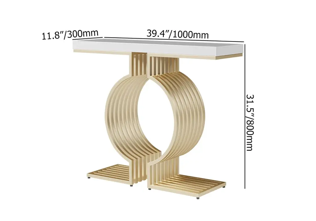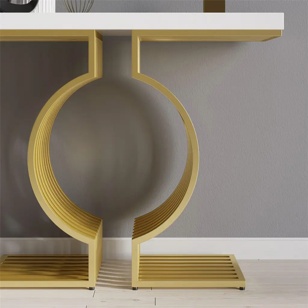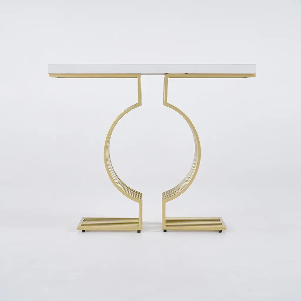 Upgrade your space with this modern console table featuring a sleek white top and a geometric gold base. Made from high-quality materials, it's perfect for entryways, hallways, or living rooms. Easy to assemble with detailed instructions included.