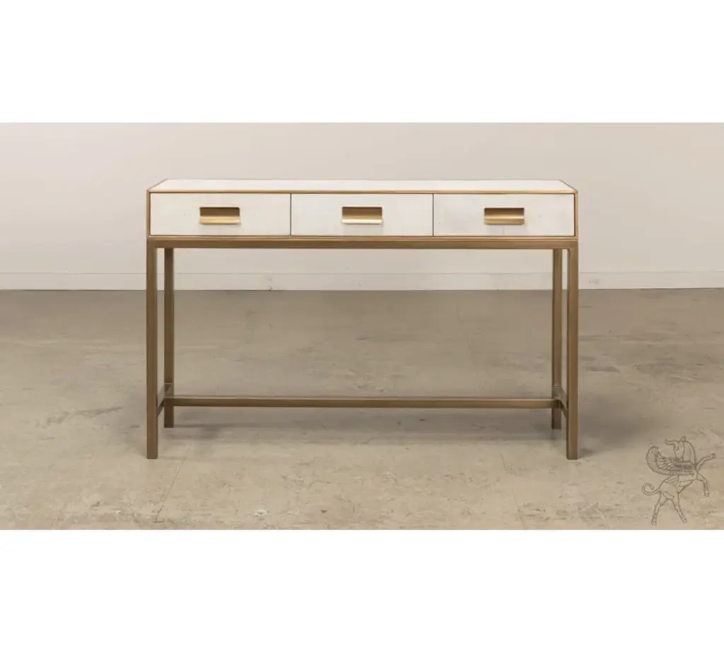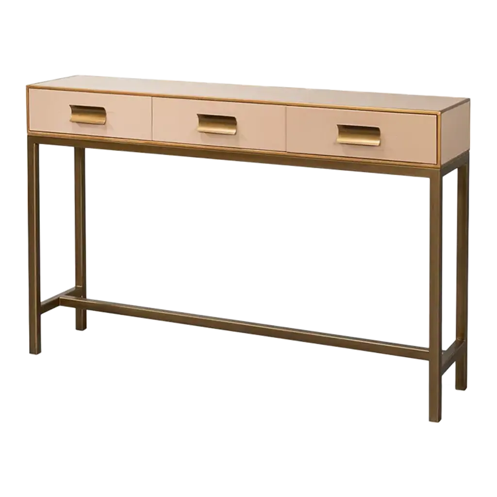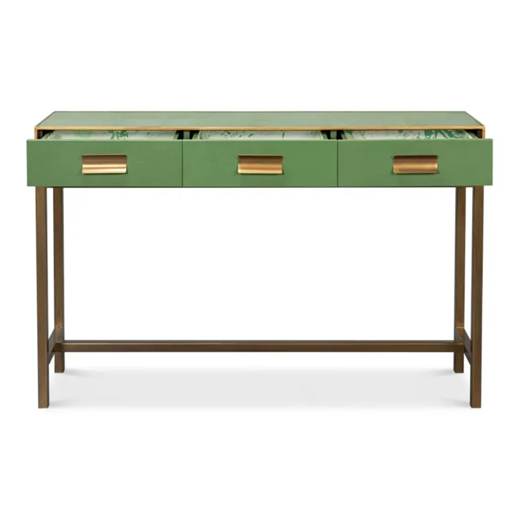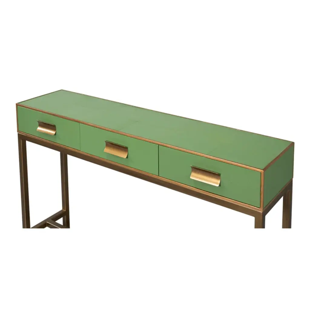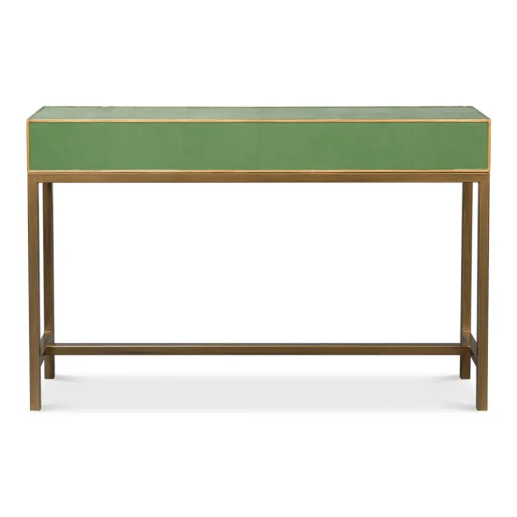 This console table blends modern design with classic elegance, featuring a textured shagreen finish that adds a touch of sophistication. Perfect for hallways or living areas, it provides a stylish surface for decorative accents or functional storage. Its refined design complements a variety of interior styles, combining aesthetic appeal with practical utility. Add versatility and charm to your living space with this standout piece.