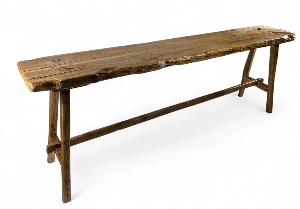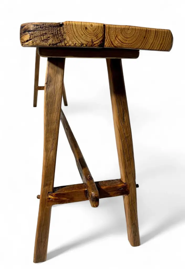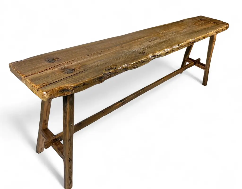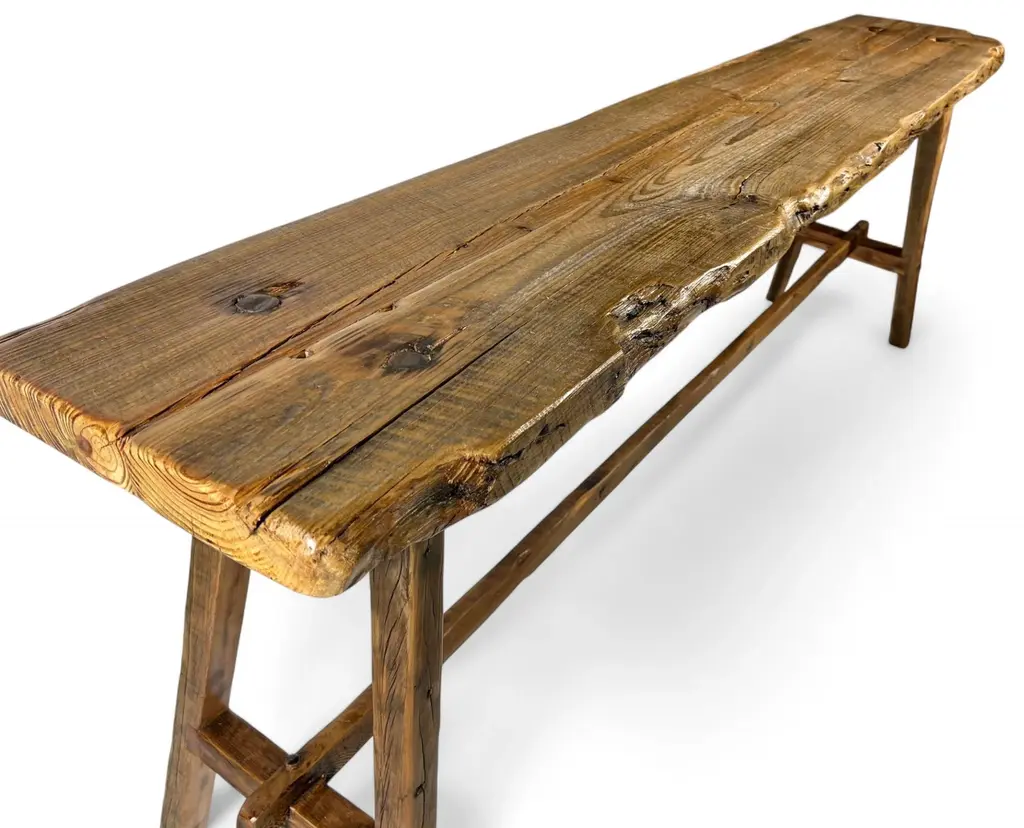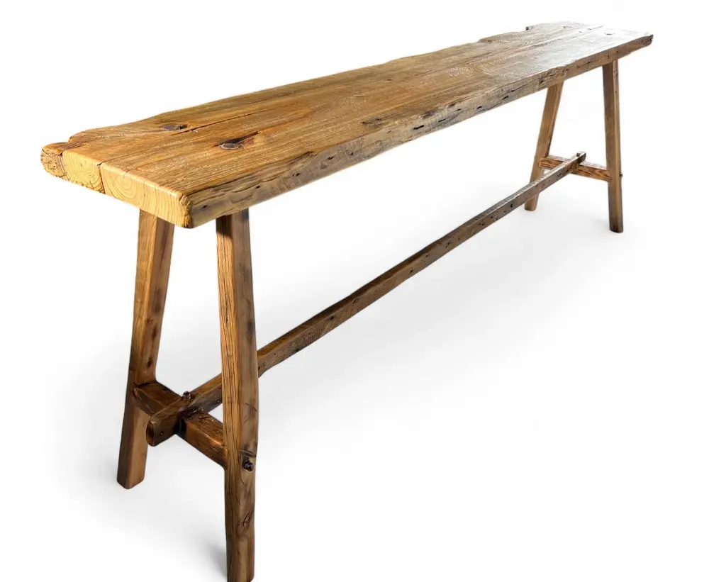 Archaic’s made-to-order French farmhouse bucket console table. This version has a heavier 2” thick top and dramatically splayed, branch tooled legs which breach the top. Unlike our standard console, this bucket table version is skirt-less. The finish shown is semi-gloss Polycrylic. All of our farmhouse furniture is custom made by hand in our South Carolina workshop located just outside of Charleston. We use only antique reclaimed lumber found throughout the United States. Most of the wood is circle-sawn lumber harvested from 19th and early 20th century structures such as barns and farm buildings. The most common wood types we utilize are elm, oak, cypress, pecky cypress, walnut, and heart pine. The species used on this particular table are elm and oak for the undercarriage, and heart pine for the top. Each original piece is branded at the underside with the Archaic logo. 78"W x 34"H x 12"D (Overall Depth with Leg Spread - 14"D)
