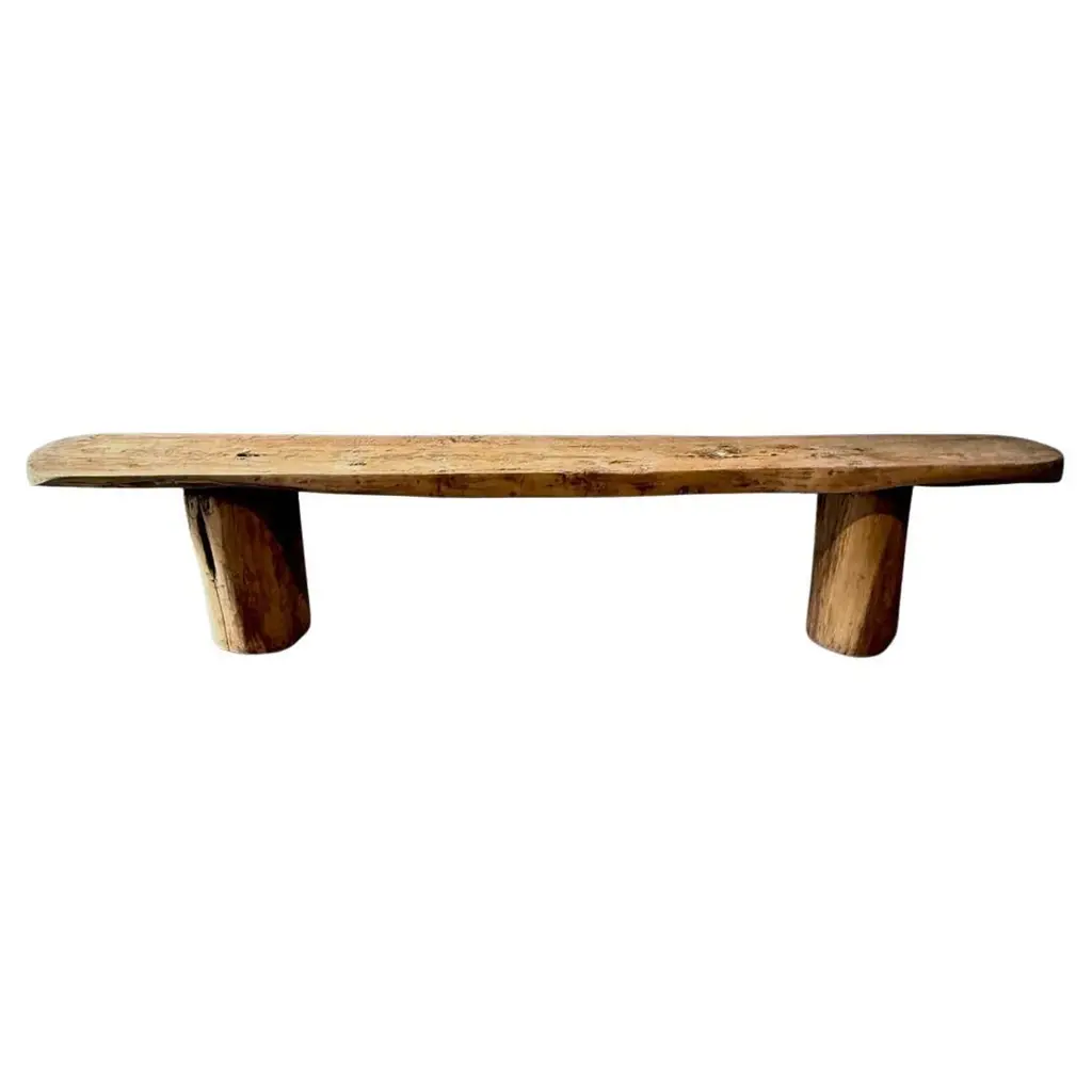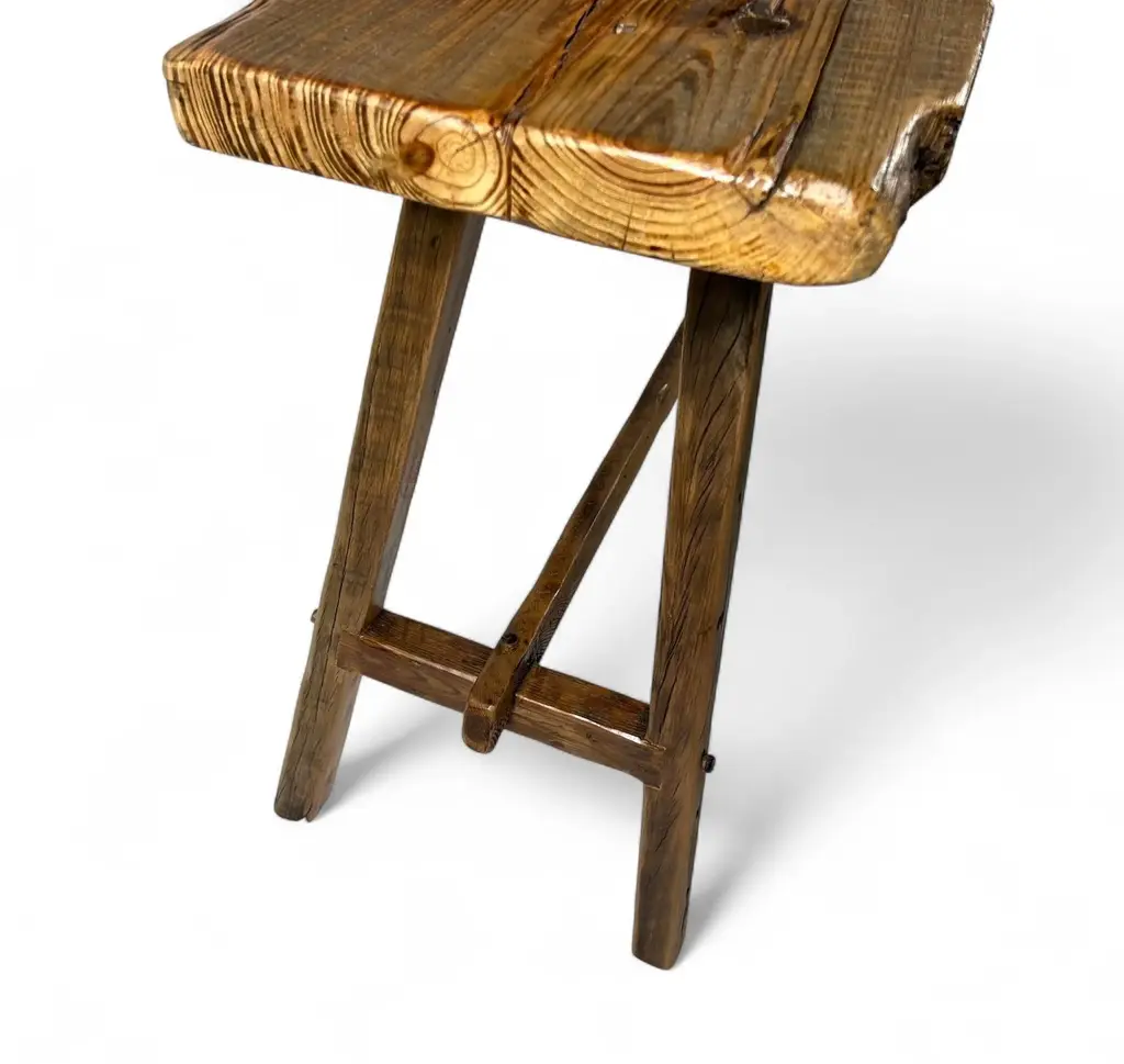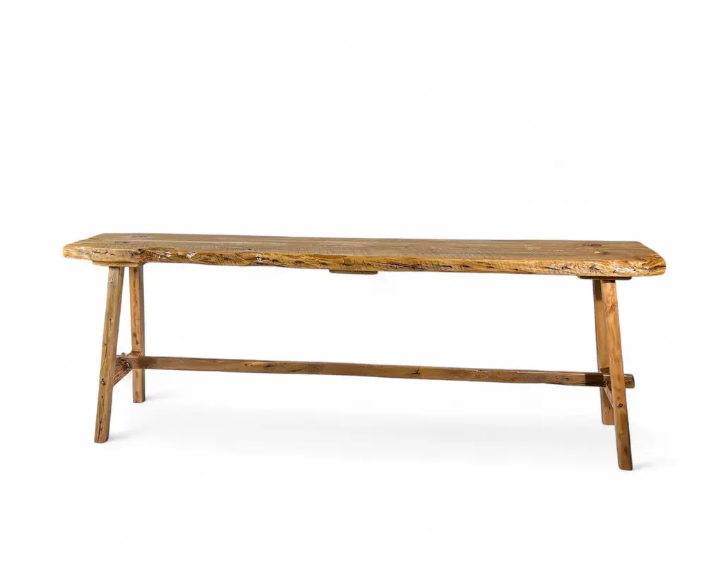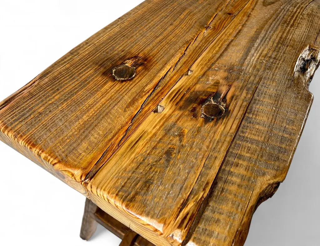Archaic’s made-to-order French farmhouse bucket console table. This version has a heavier 2” thick top and dramatically splayed, branch tooled legs which breach the top. Unlike our standard console, this bucket table version is skirt-less. The finish shown is semi-gloss Polycrylic. All of our farmhouse furniture is custom made by hand in our South Carolina workshop located just outside of Charleston. We use only antique reclaimed lumber found throughout the United States. Most of the wood is circle-sawn lumber harvested from 19th and early 20th century structures such as barns and farm buildings. The most common wood types we utilize are elm, oak, cypress, pecky cypress, walnut, and heart pine. The species used on this particular table are elm and oak for the undercarriage, and heart pine for the top. Each original piece is branded at the underside with the Archaic logo. 78"W x 34"H x 12"D (Overall Depth with Leg Spread - 14"D)