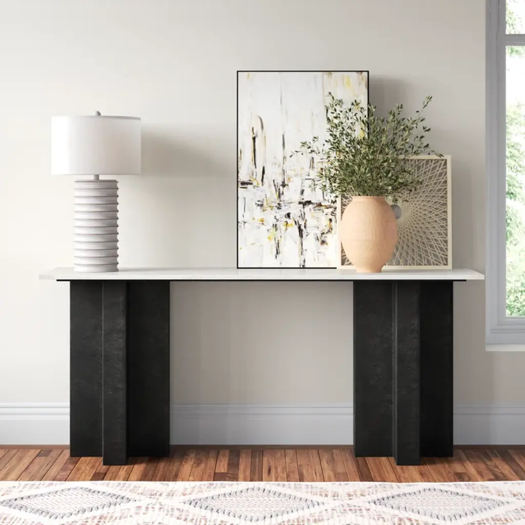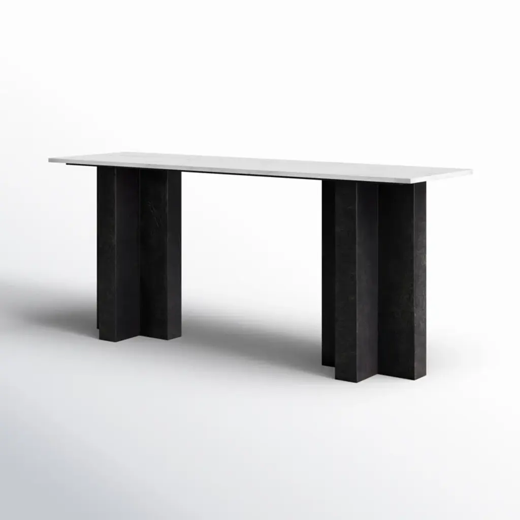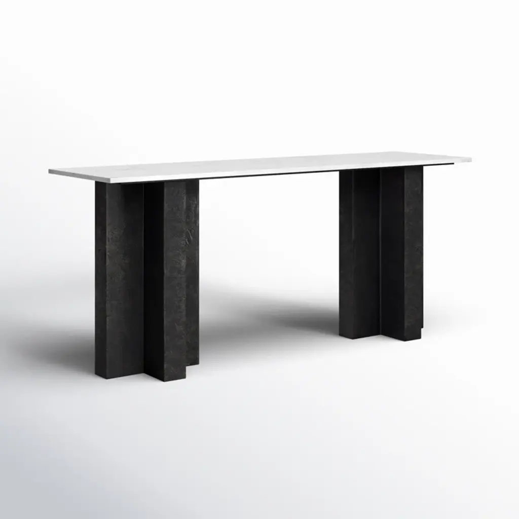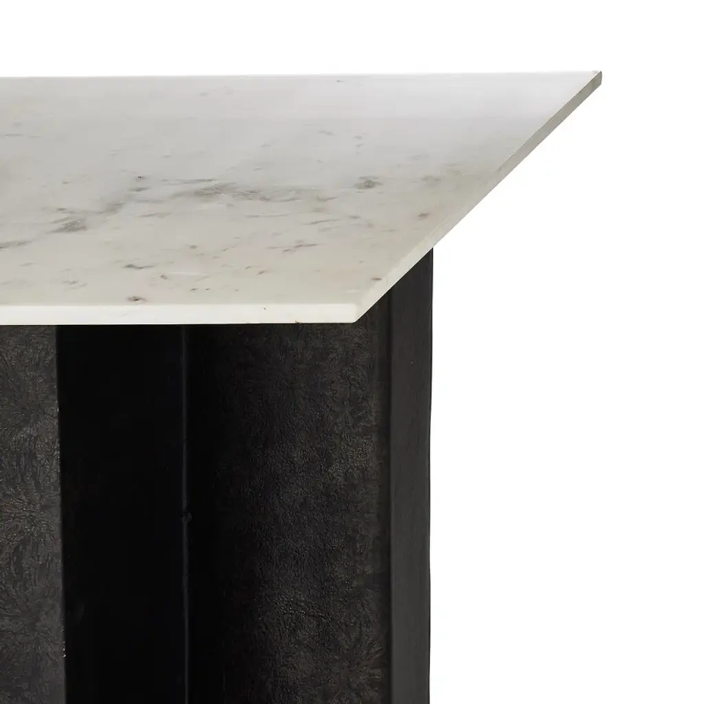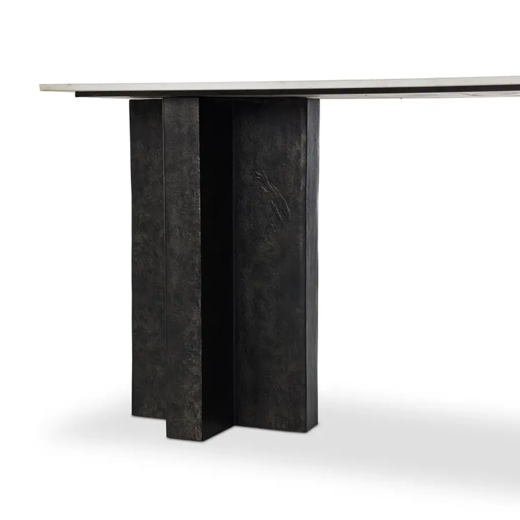 Classic with contrast. Finished in a raw black, angular cast aluminum legs support a large rectangular tabletop of solid marble in a clean, polished white.