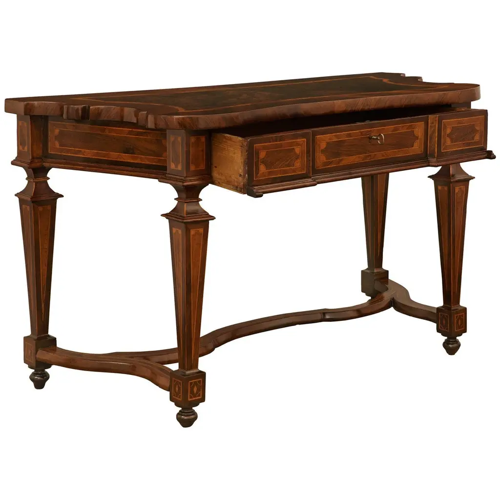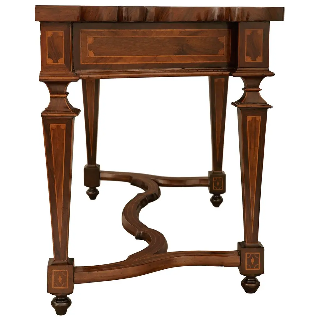 An impressive and most handsome pair of Italian early 18th century Louis XIV Period Walnut and Olivewood consoles. Each freestanding console is raised by four topie shaped feet below Walnut blocks detailed with Olivewood fillet inlays, and joined by a cabriole stretcher with matching two tone inlays. Rising from the bottom blocks are square tapered legs featuring outline fillets and two tone Olivewood inlays, ending in four inlaid blocks flanking the central drawer and side aprons. The central drawer displays three inlaid panels of Walnut and two tones of Olivewood. Above is the thick top carved to follow the shape of the console and featuring two book matched pieces of Walnut trimmed with Olivewood inlays.
