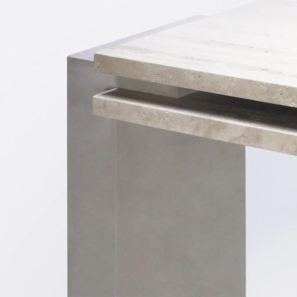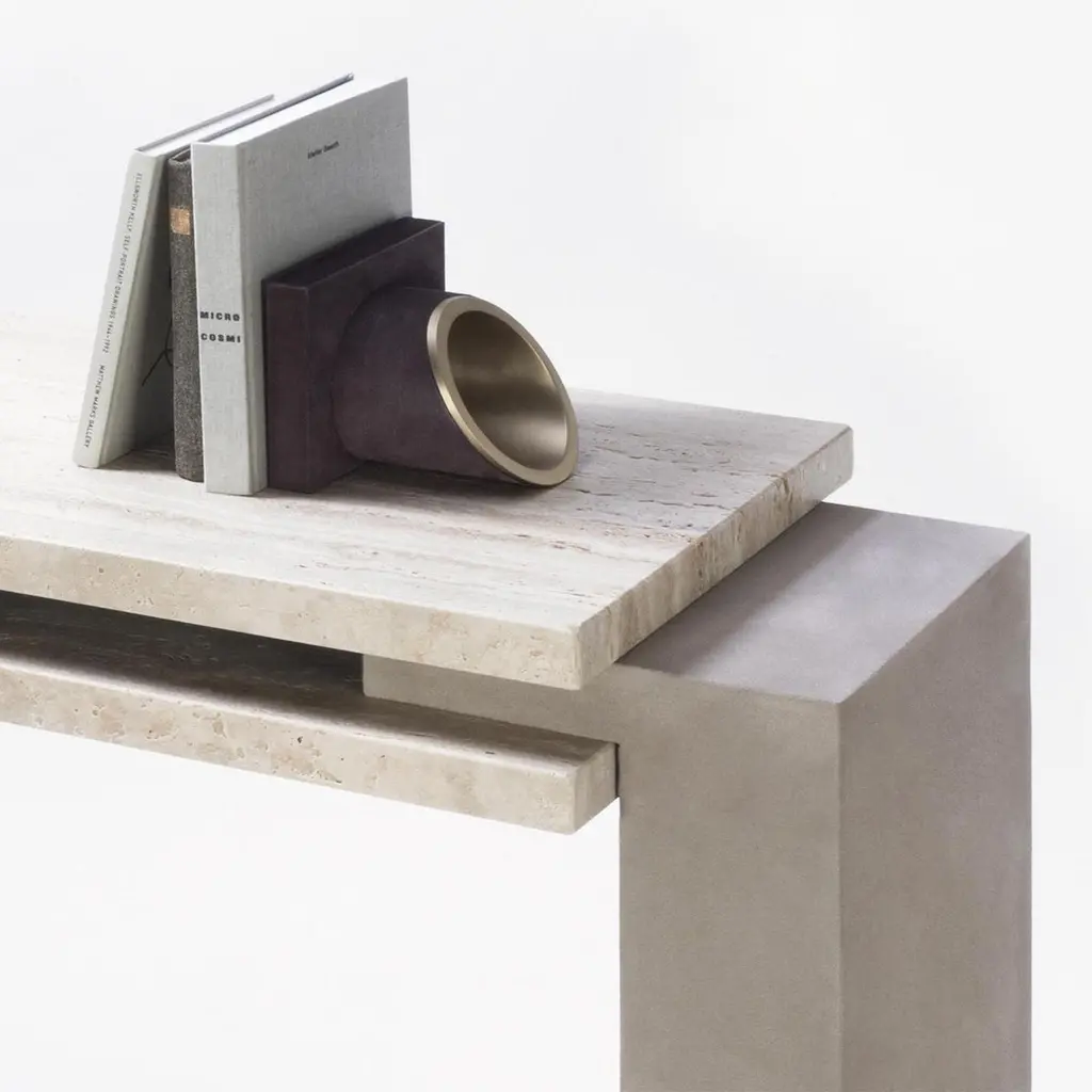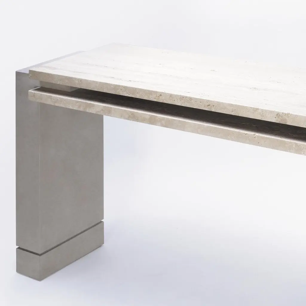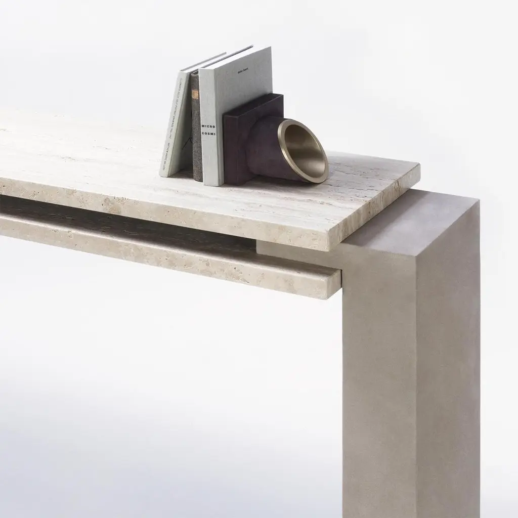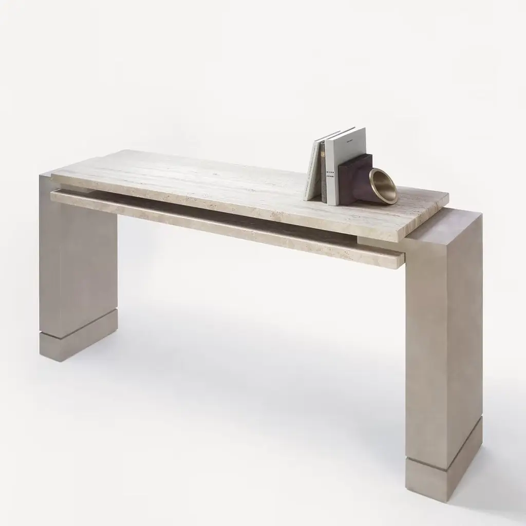 Console Table Abel Travertine with structure in solid wood, with travertine double tops and with feet covered with genuine suede leather in light grey color.