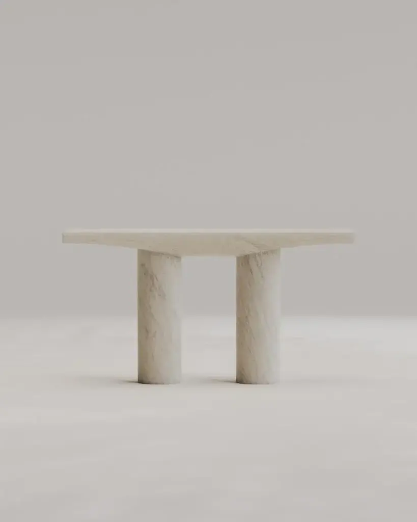 "Introducing the "Abraccio" Collection or translated "embrace" Collection unites the enduring beauty of solid carved marble with a language of form that pays homage to primitive structures. Two primal shaped columns support a commanding horizontal solid slab. It becomes a conversation between classical and contemporary, nature and craftsmanship, geometric precision and organic shapes. Yet, it's the ellipsoid embrace that truly defines the collection's character. These graceful curves, meticulously carved into the stone, encircle the columns like an enigmatic story waiting to be deciphered. This ellipsoidal motif not only adds a layer of visual allure but also imparts a sense of unity and balance, bridging the gap between the geometric precision of the columns and the softer lines of the surrounding space. sizes.