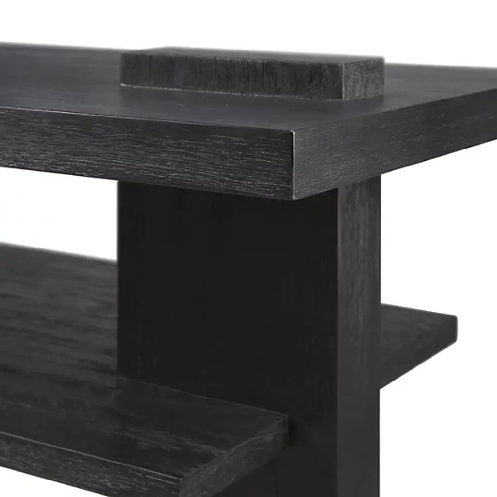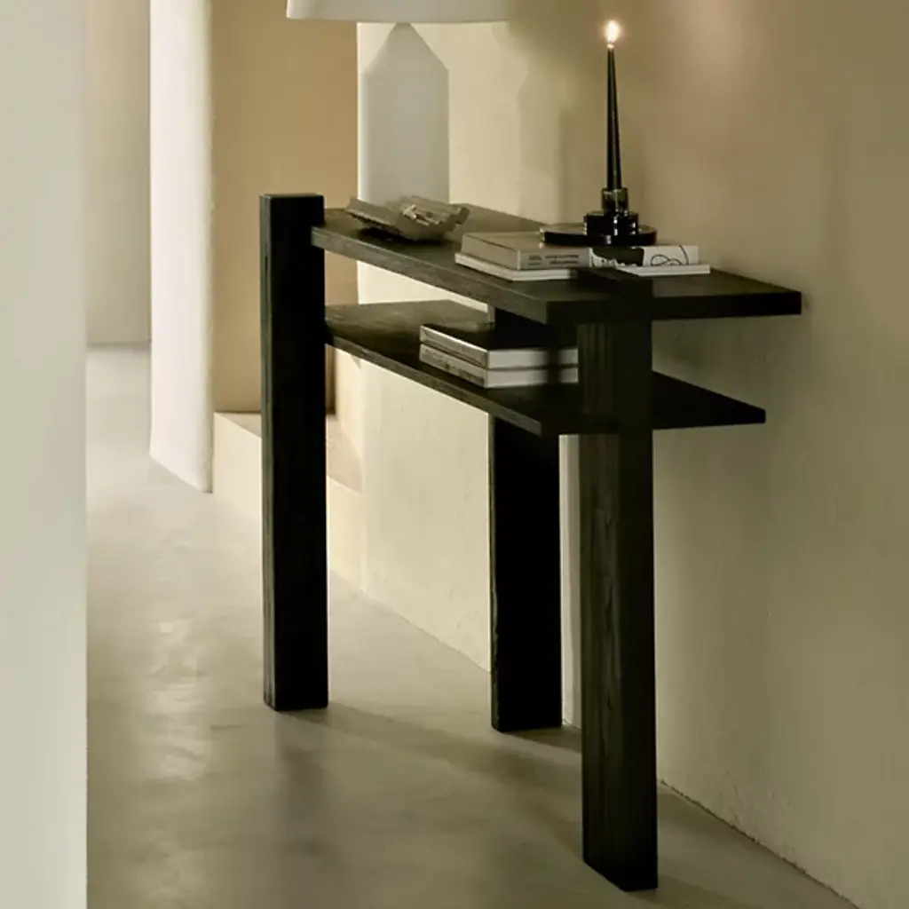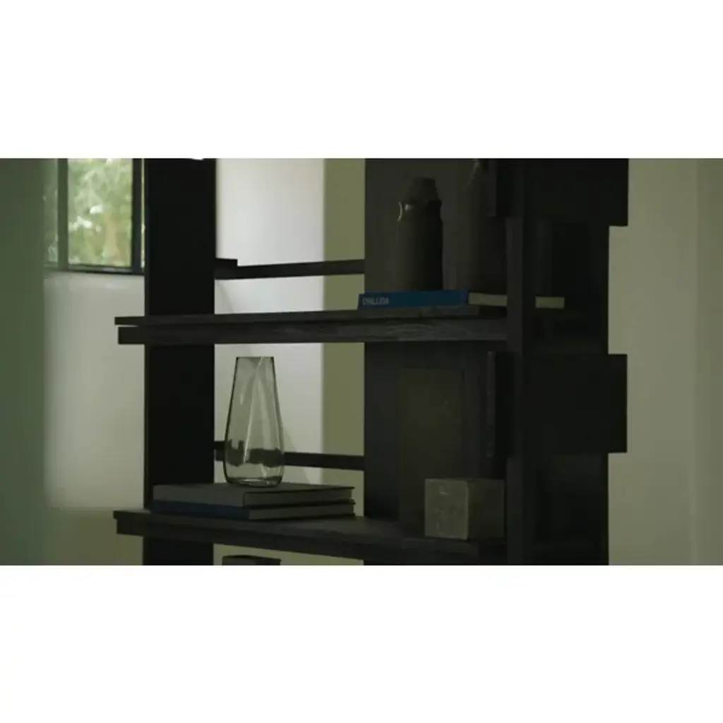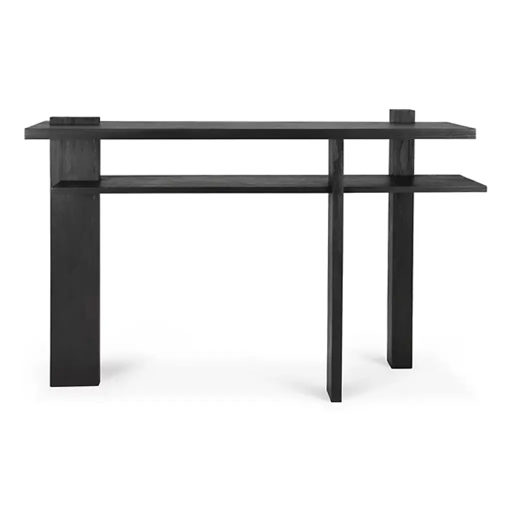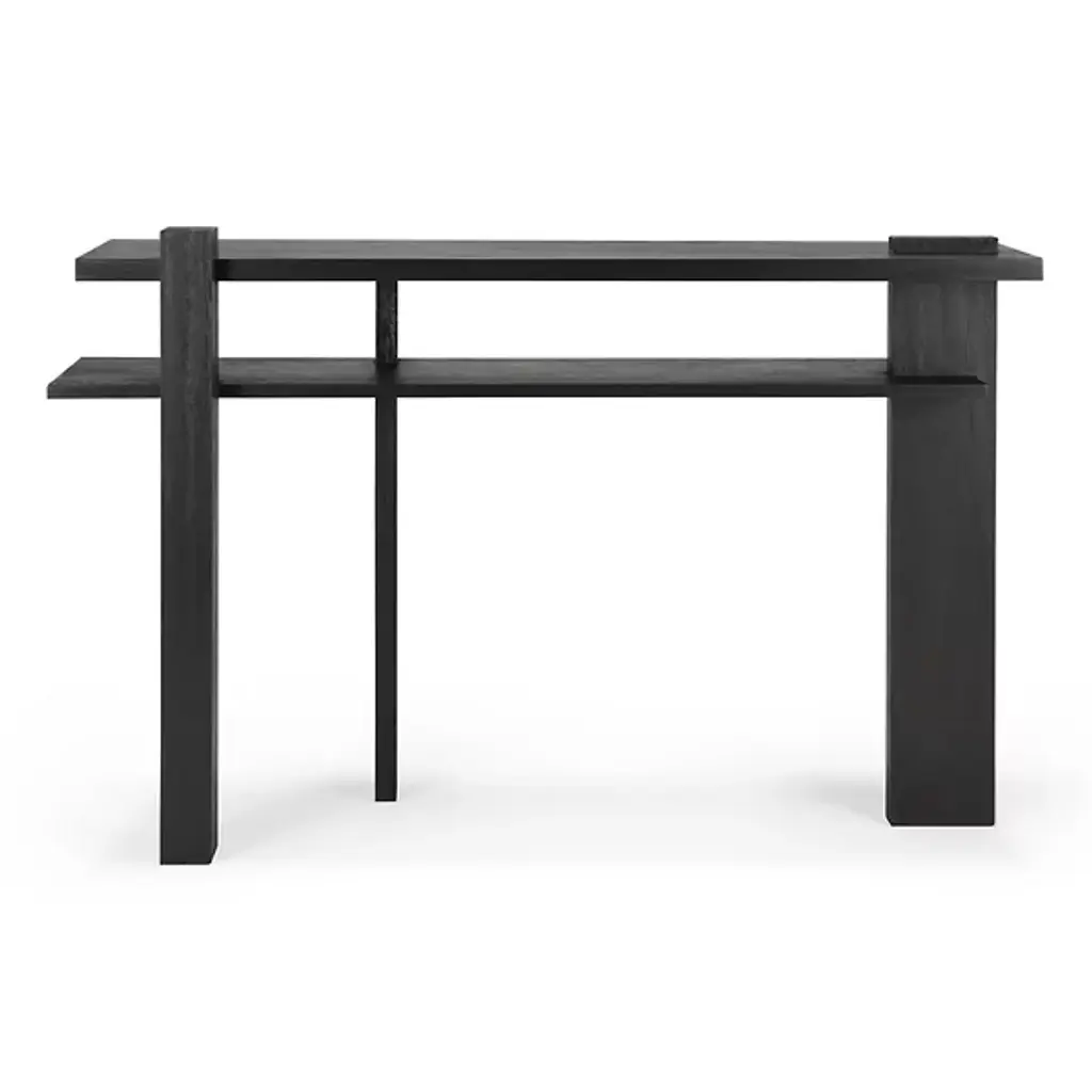 The Abstract Console Table from Ethnicraft extends a vital abstract edge to indoor environments, enriching its surroundings with a touch of sculptural style. An Alain Van Havre creation fashioned from teak wood, it is rich and robust, drawing its inspiration from the de Stijl Dutch architectural movement. The layered form appears to be almost the open sketch of a structure, the slender legs supporting two layered shelves, providing purpose and accessibility
