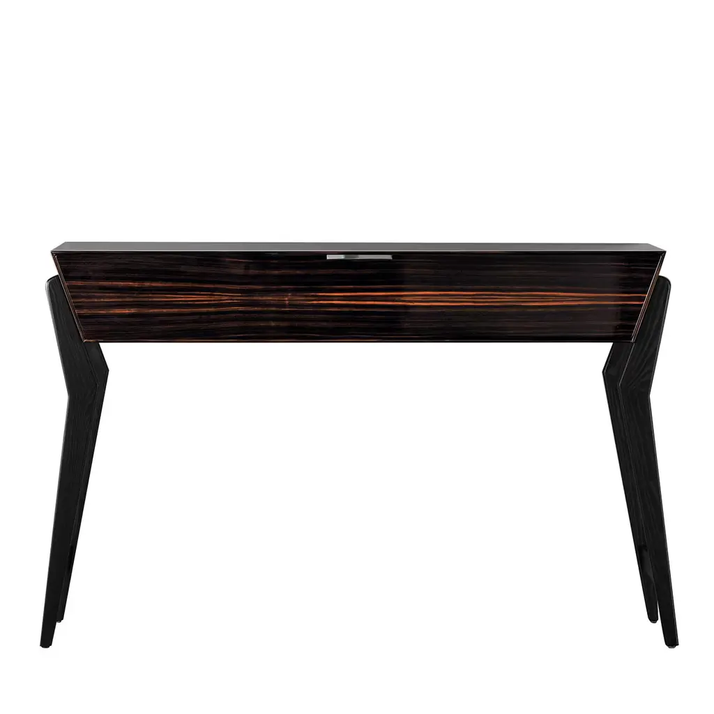 The Beverly Console offers a versatile design that complements any interior with its rich black satin veneer and brown Etimoa figure. Finished with hammered brass accents, this piece combines classic luxury with a modern edge. It’s perfect for creating a statement in any hallway, lounge, or hotel lobby.