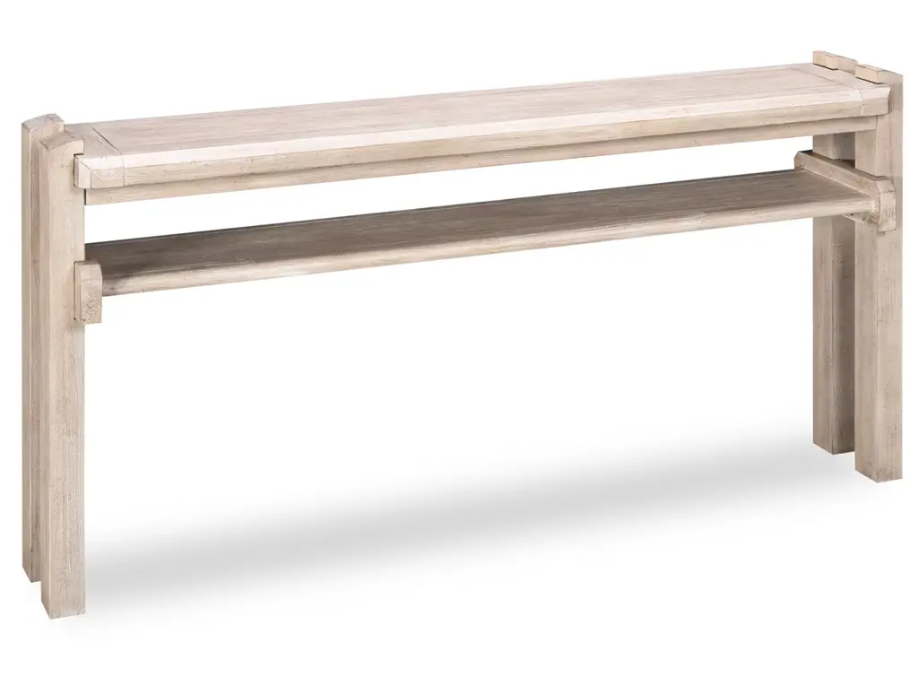 Add the finishing touch to any room with the Accents Console from Hooker Furniture. This transitional-style console table features a slim rectangular top with an interlocking post design, plus one fixed wood shelf. Chunky square legs complete the look of this versatile console. Place it behind your sofa or in an entryway.