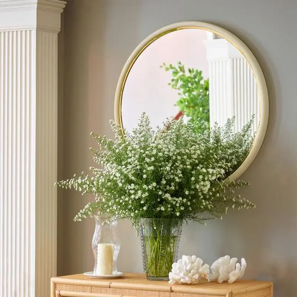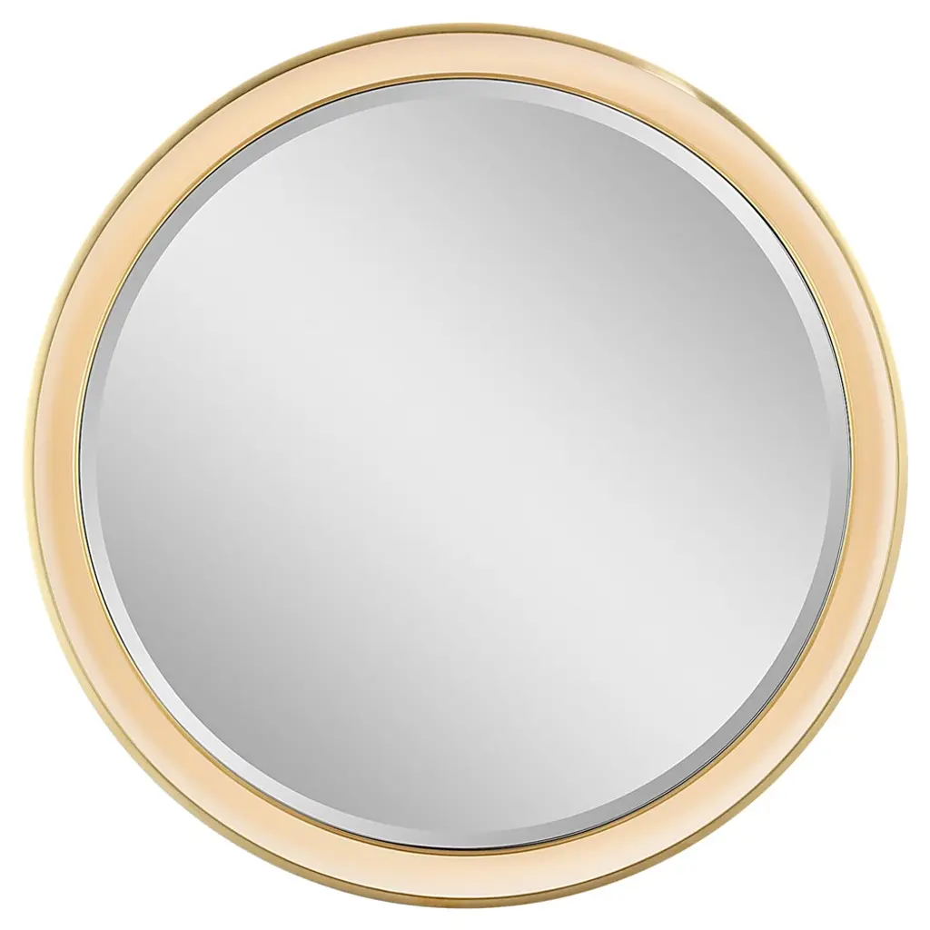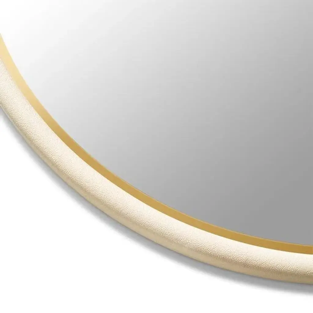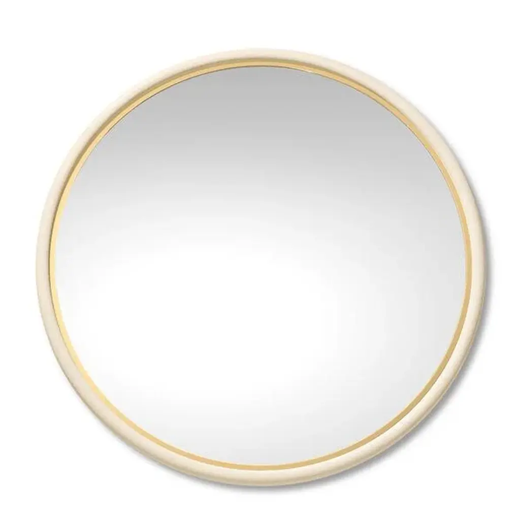 Add a stylish touch and depth to a room with this round floating mirror, edged in brass and a rounded faux shagreen frame. This well-balanced piece is finished on the back with bird’s eye maple veneer and comes with French cleat mirror hanger hardware. A wonderful touch to pair above the faux shagreen Console Table. Embossed faux shagreen, mirror, brass-plated stainless steel hardware, wood veneer, suede lining Dimensions: 36.0" x 36.0" x 1.8" French cleat hanger system with mounting instructions included. Care Instructions: Wipe faux shagreen and mirror with a soft dry cloth.