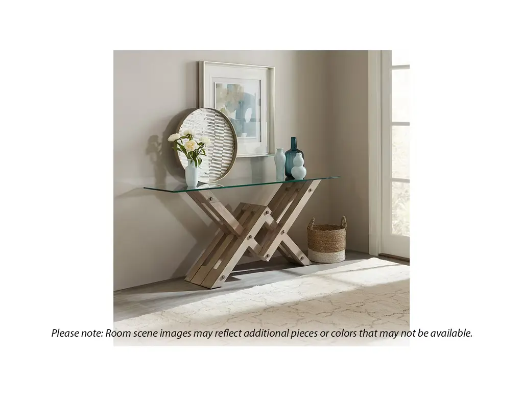 Sand-blasted greige and an antique white finish combine to create an inviting look for this Hooker Furniture Affinity Console Table. The unique zig-zag base and clear glass top gives this piece a modern, refined look for your living room or entryway.