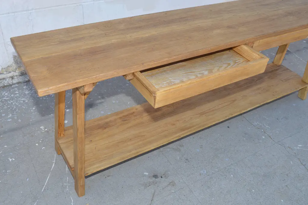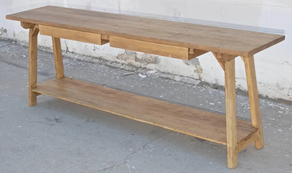 This custom built console table is made using reclaimed, vintage wood. It has a shelf and two drawers that can be opened from either side. It is seen here 96" x 17.5" We use only traditional carpentry techniques, no nails or metal fasteners of any kind. Just mortise and tenon construction reinforced with hand-cut wooden dowels.