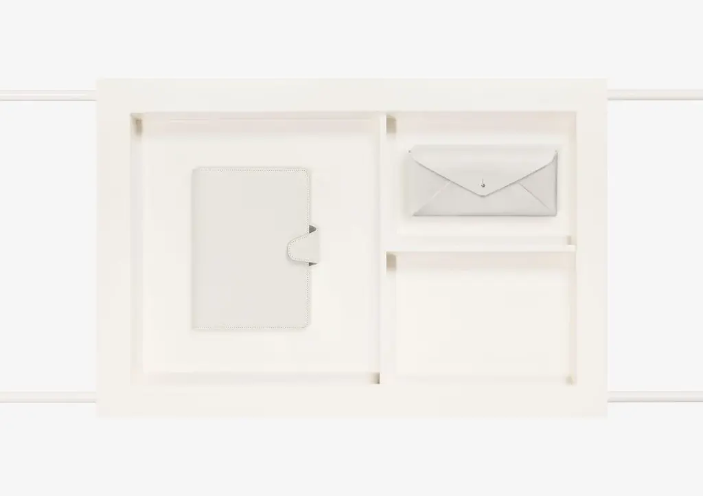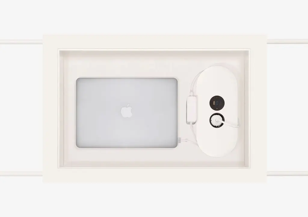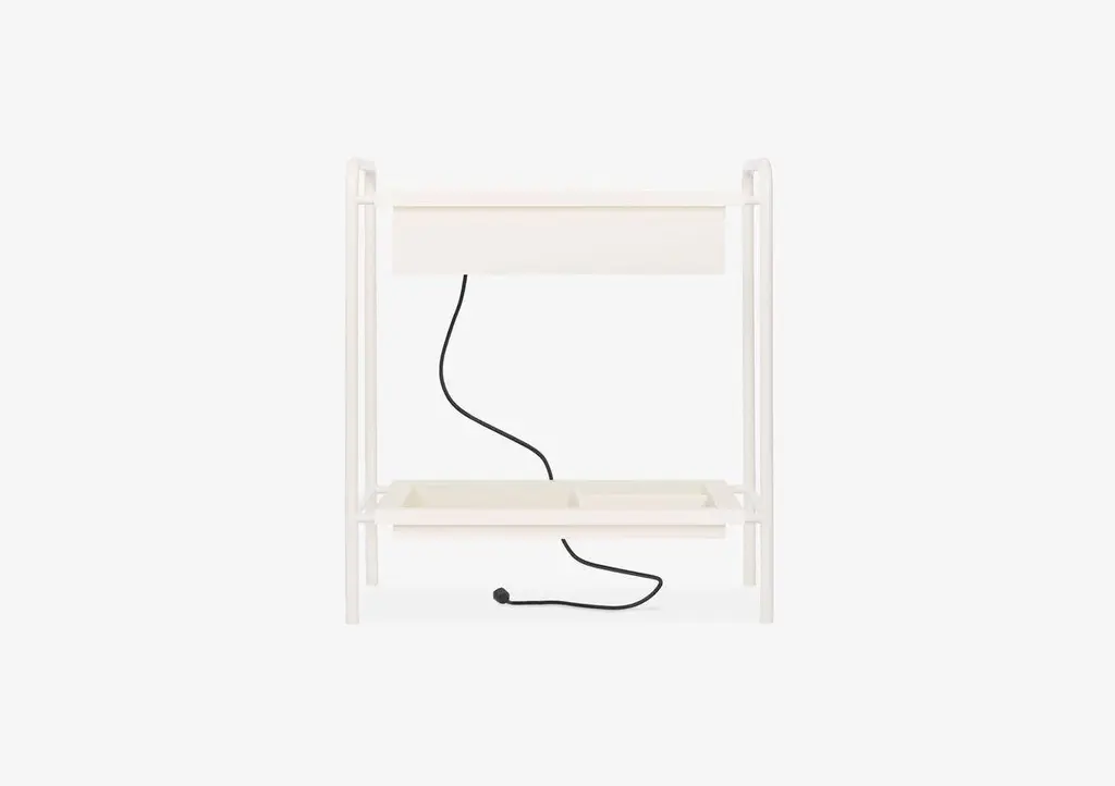 Console table composed of 1 lacquered steel structure with fixed feet and 2 tops in lacquered MDF. The Living tops have a recess that allows a simple fit into the structure and you can easily change the order of placement. This set includes: 1 Console table structure with feet – Lacquered steel – White 1 Large divided tray – Lacquered – White 1 Laptop box – Lacquered – White - Includes 1 power strip with 1 socket + 2 USB chargers. Choose between schuko, british, or american sockets/plugs.