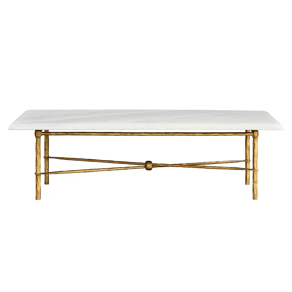 A stunning mix of organic and man-made, the Alessandro Cocktail Table features a hand forged solid brass base and honed white Volakas marble top. These two components come together to create a functional yet beautiful piece inspired by the work of designer Diego Giacometti. The Alessandro collection also includes an end table and a console table (sold separately). Ships In 4-5 Weeks Honed white Volakas marble top Antiqued hammered brass base This image is for illustrative purposes only. The colors shown are accurate within the constraints of lighting, photography, and the color accuracy of your screen.